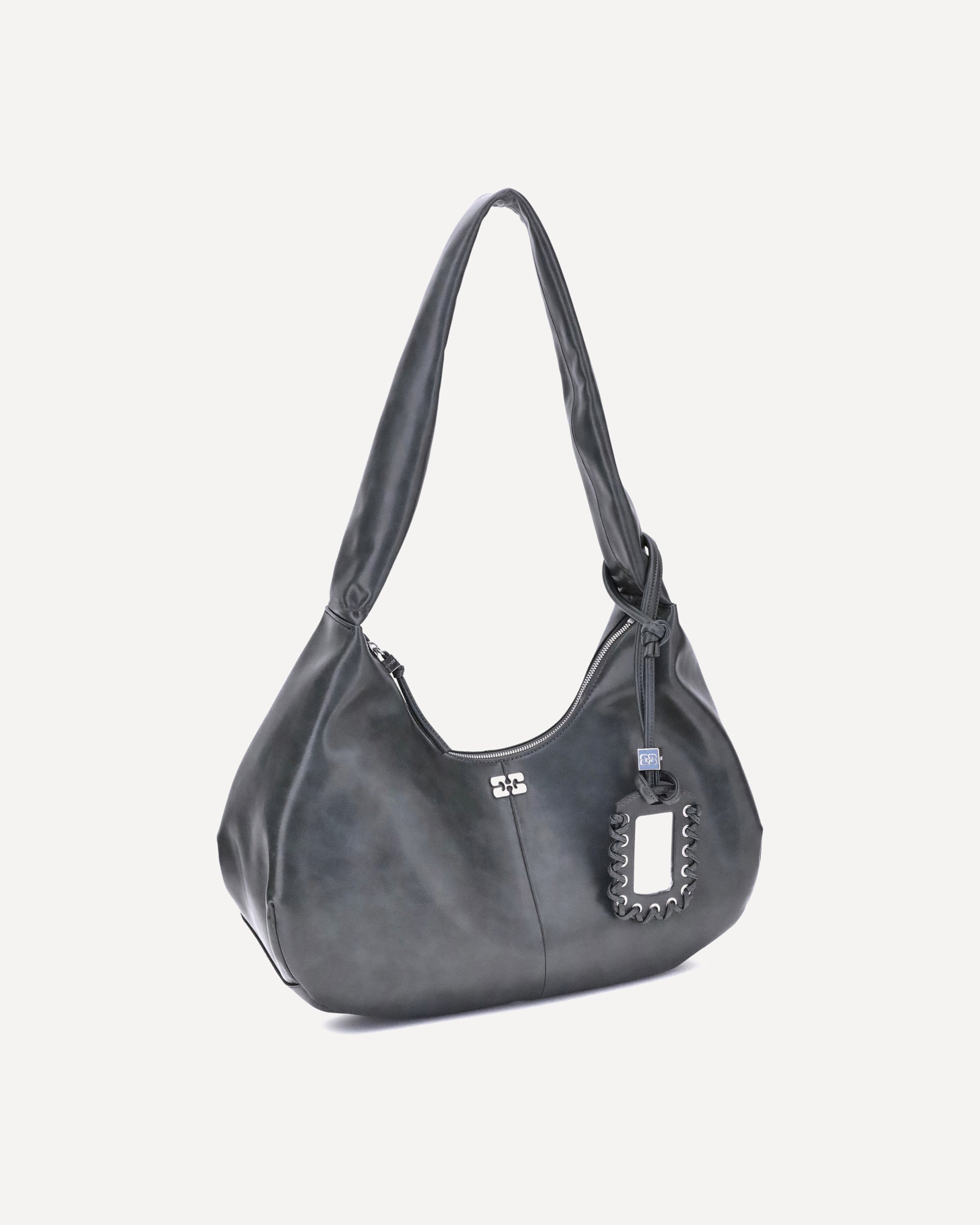 La Borsa a Spalla Hobo media di Ganni è un accessorio dallo stile contemporaneo e funzionale. Dotata di una tracolla piatta che assicura comfort durante l’uso quotidiano, presenta una chiusura superiore con cerniera che garantisce praticità e sicurezza. Alla base spicca una targhetta con logo applicata, mentre sul fronte una placca con l’iconico logo del brand aggiunge un tocco distintivo. Essenziale e versatile, è perfetta per completare con carattere look urbani e casual.