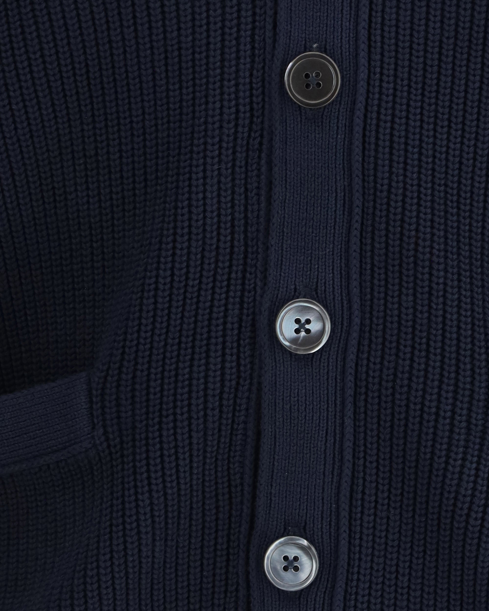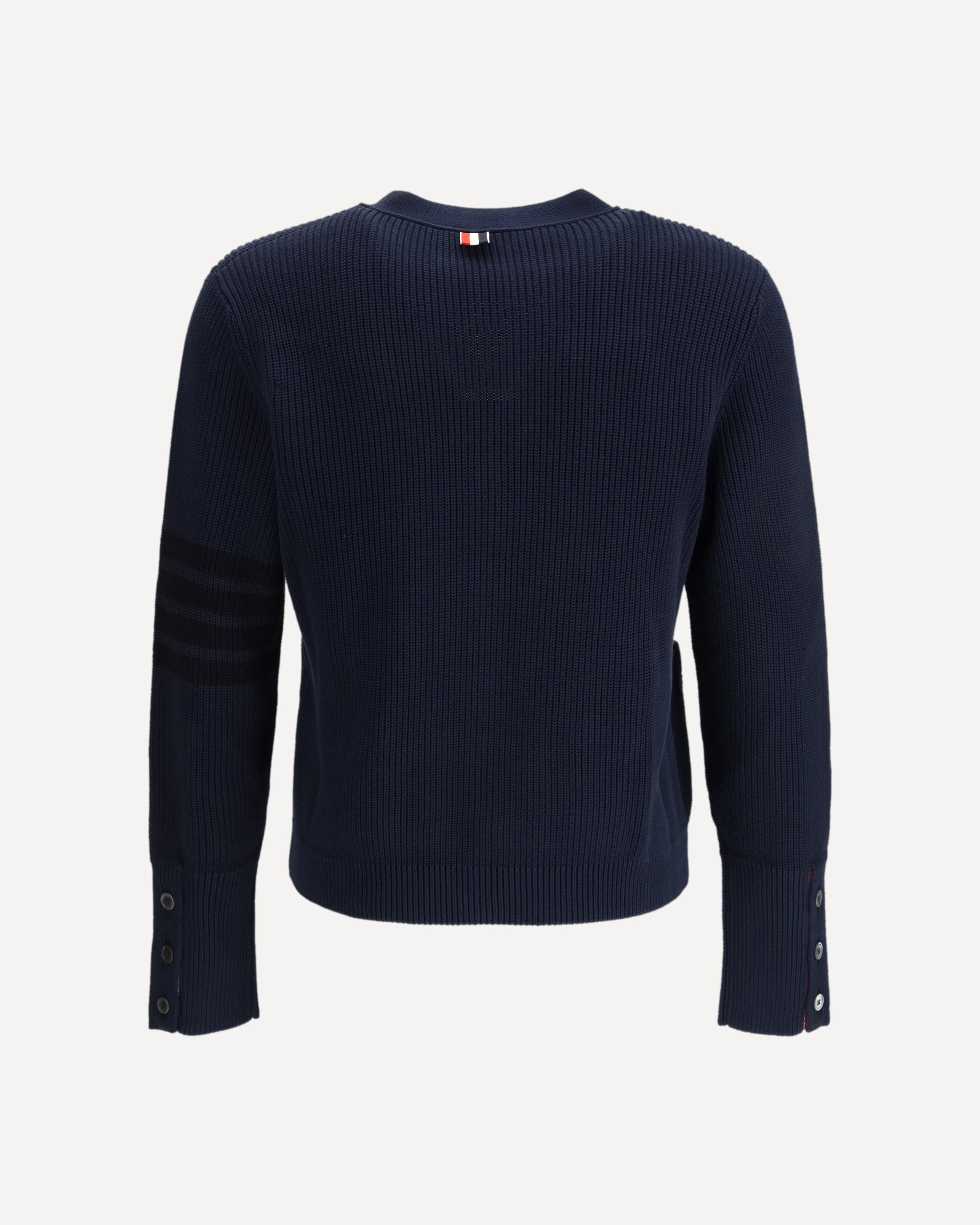 Il Cardigan V-neck di Thom Browne è un modello elegante con scollo a V e chiusura frontale a bottoni. Presenta tasche frontali applicate, iconiche bande a righe sulla manica, e l’inconfondibile grosgrain striped loop tab sul retro del collo. Le aperture laterali e i polsini sono completati da bottoni e rifiniti con il caratteristico grosgrain a righe, elemento distintivo del brand.