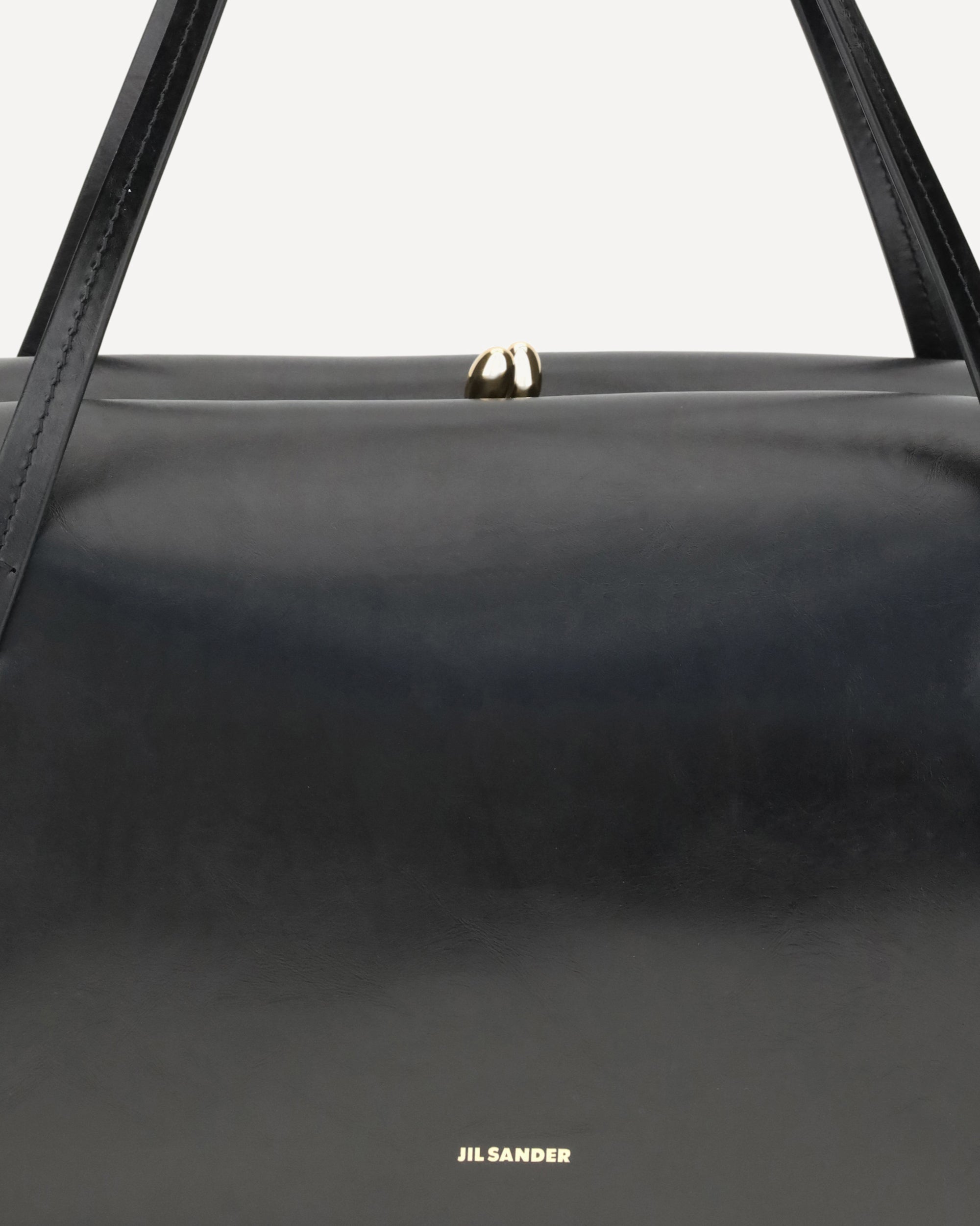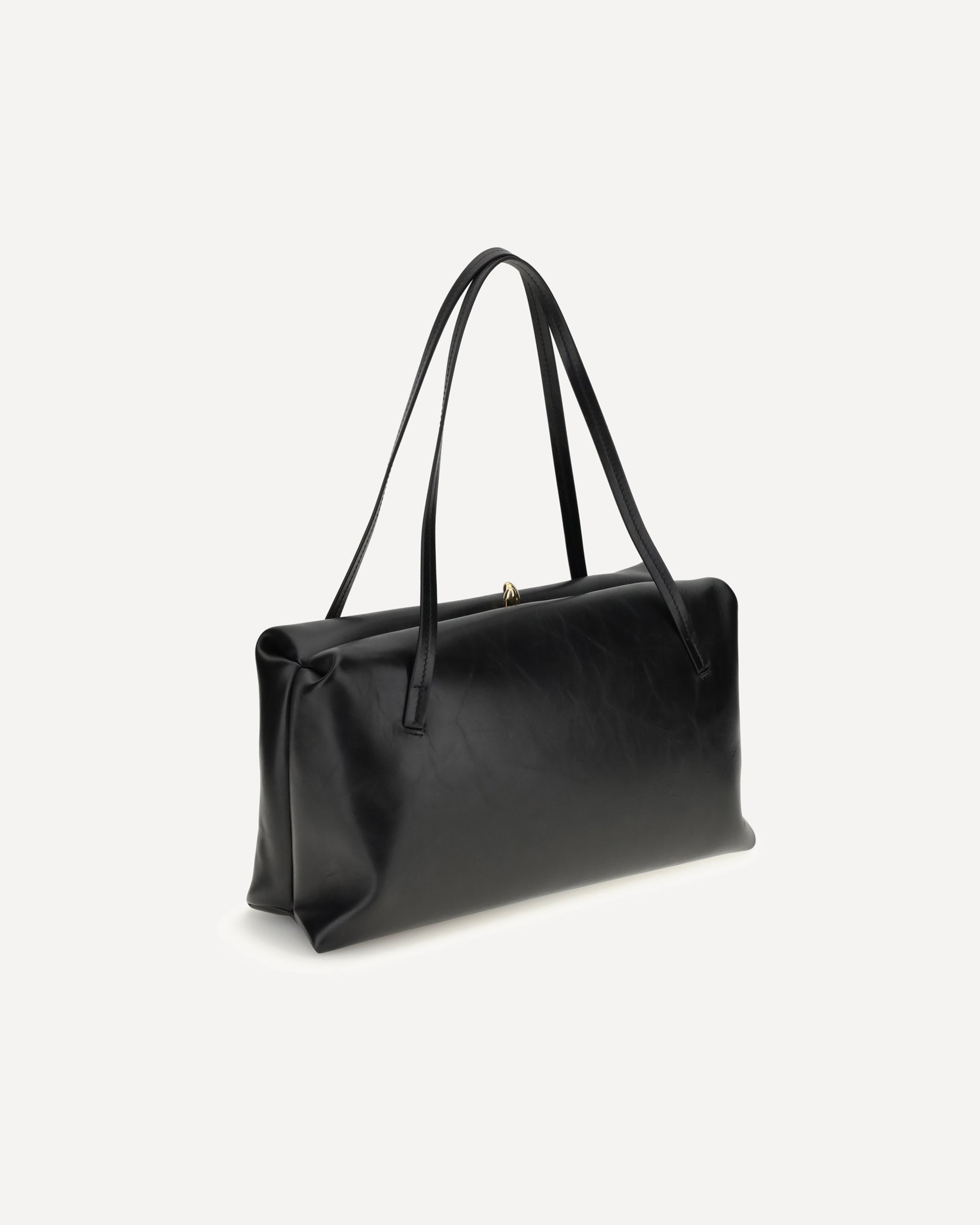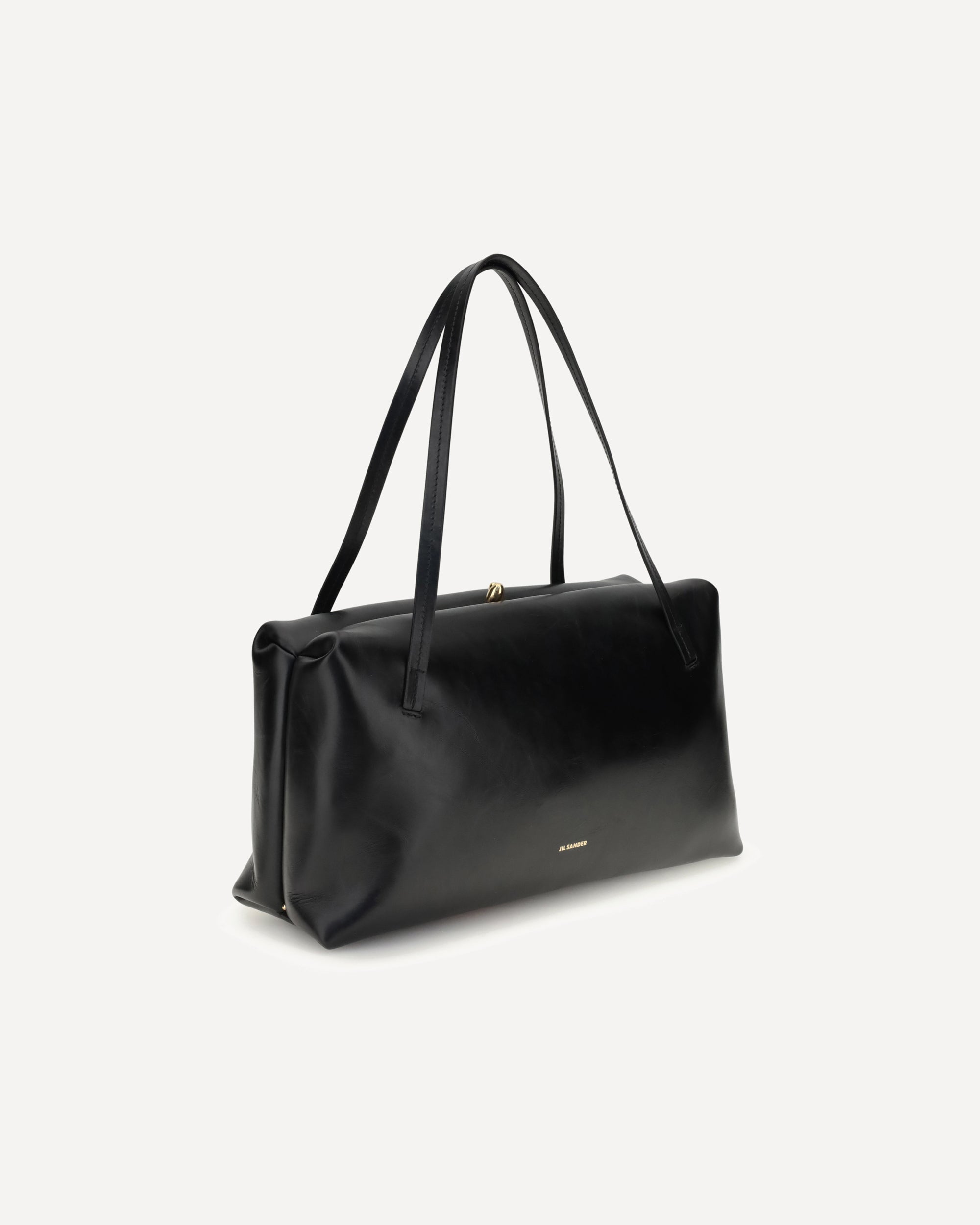 La Borsa a Spalla Goji Pillow media di Jil Sander è realizzata in pelle di vitello e si distingue per il logo stampato laminato sulla parte frontale. Presenta due manici piatti in pelle tonale e una pratica chiusura clic-clac, unendo design essenziale e funzionalità.