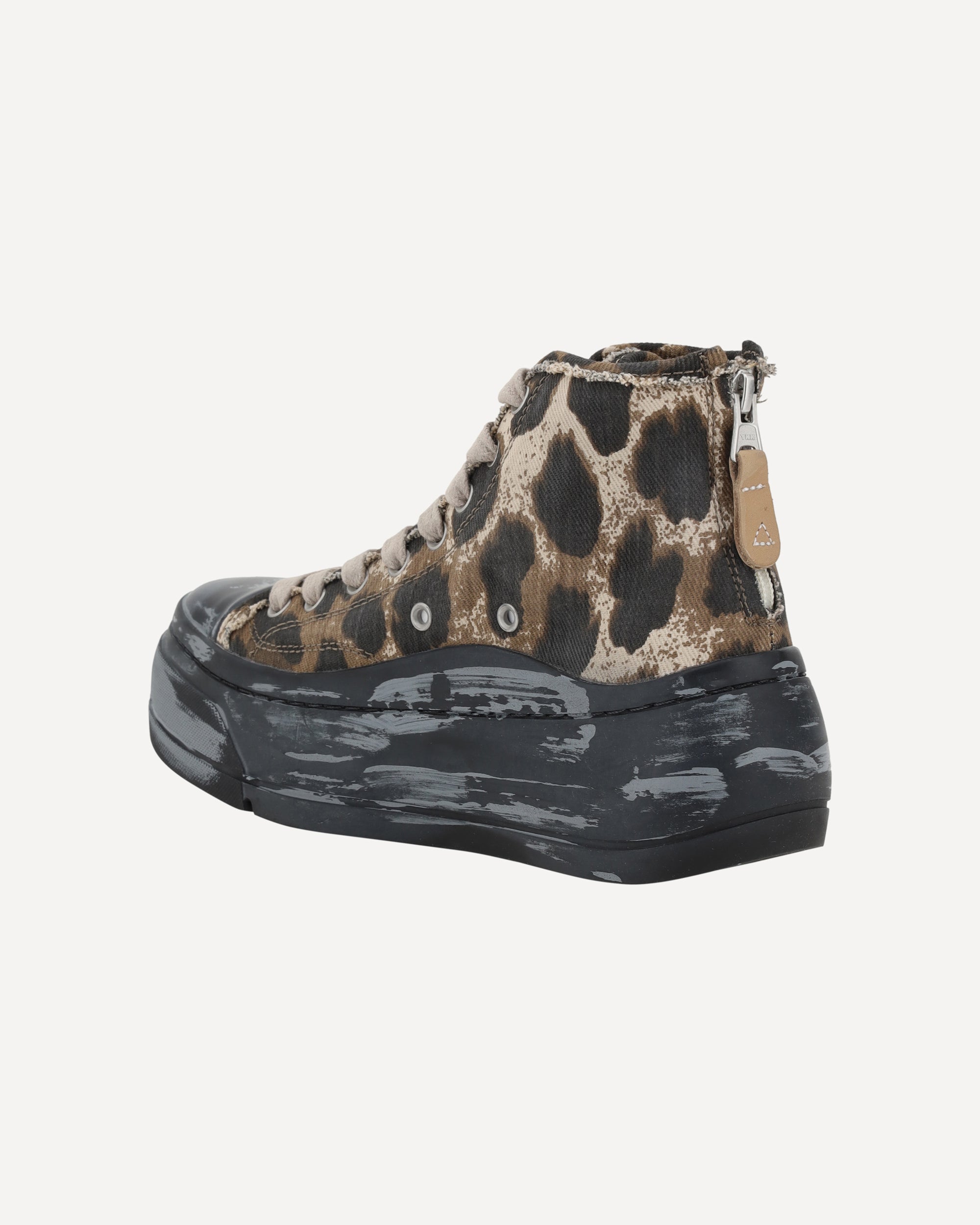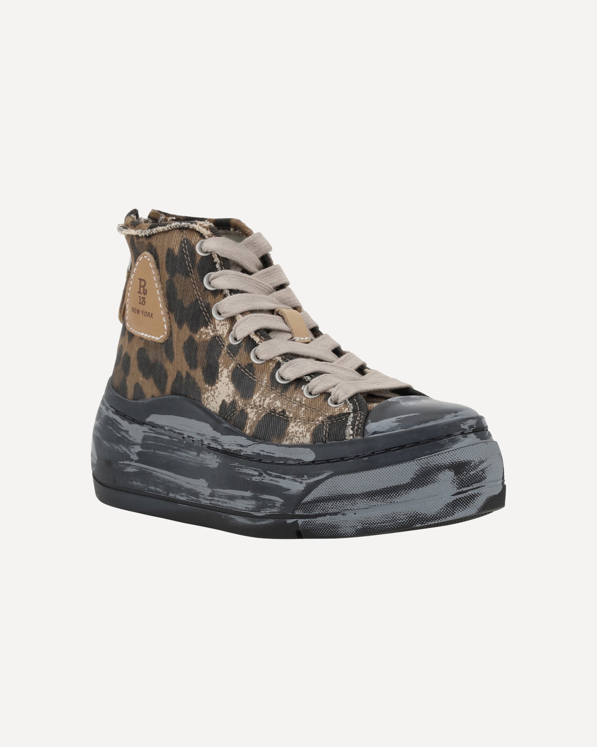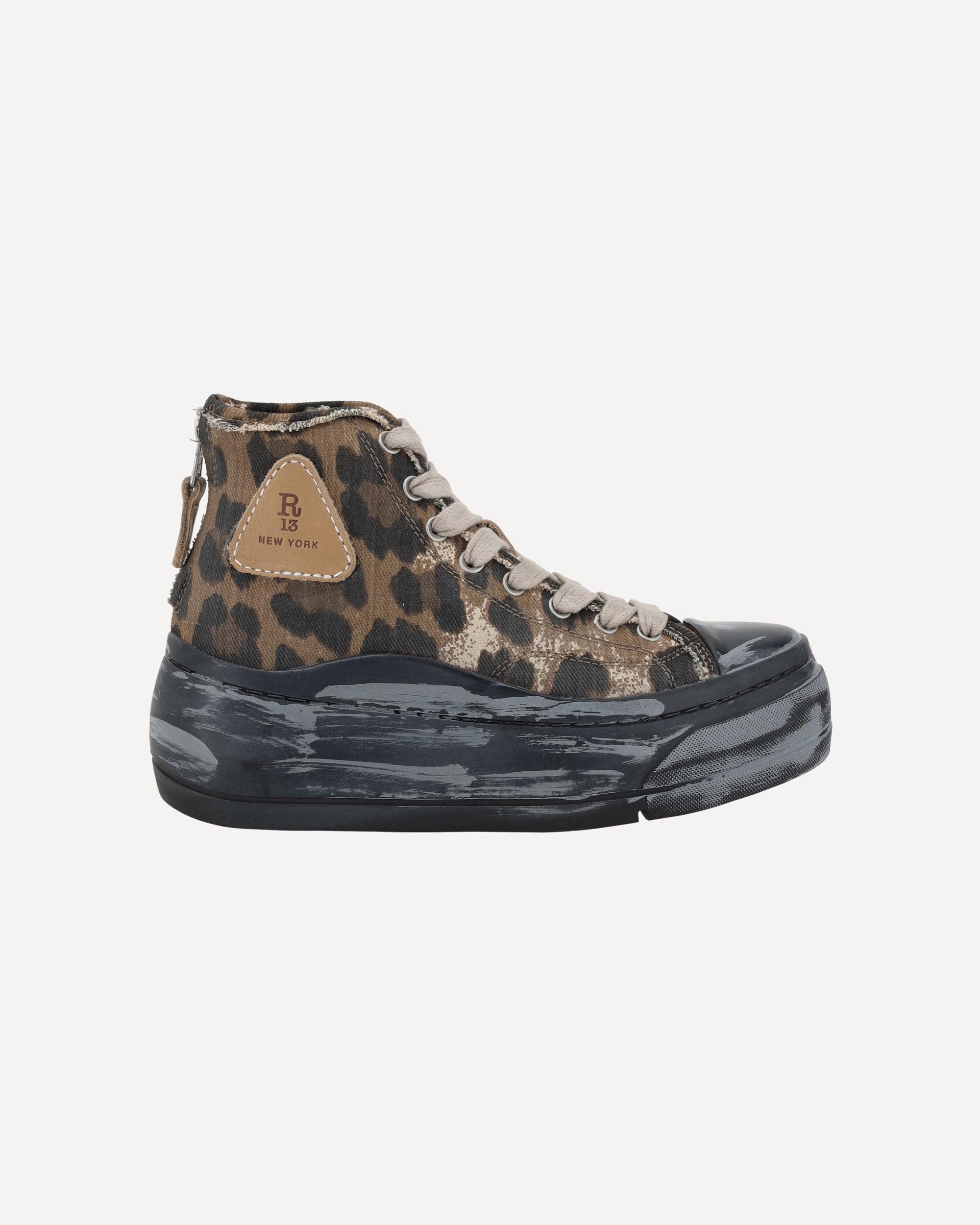 Le Sneakers High Top di R13 combinano un design audace e un tocco streetwear distintivo. Il modello a gambale alto con plateau aggiunge un elemento di altezza e stile, mentre la punta rotonda offre comfort e praticità. Il logo del brand, in rilievo su un pannello laterale esterno, sottolinea l'identità di R13. La chiusura frontale con lacci e sul tallone con cerniera assicurano una calzata sicura. La suola effetto usurato conferisce un look vissuto e grunge, perfetto per chi cerca sneakers dallo stile unico e contemporaneo.