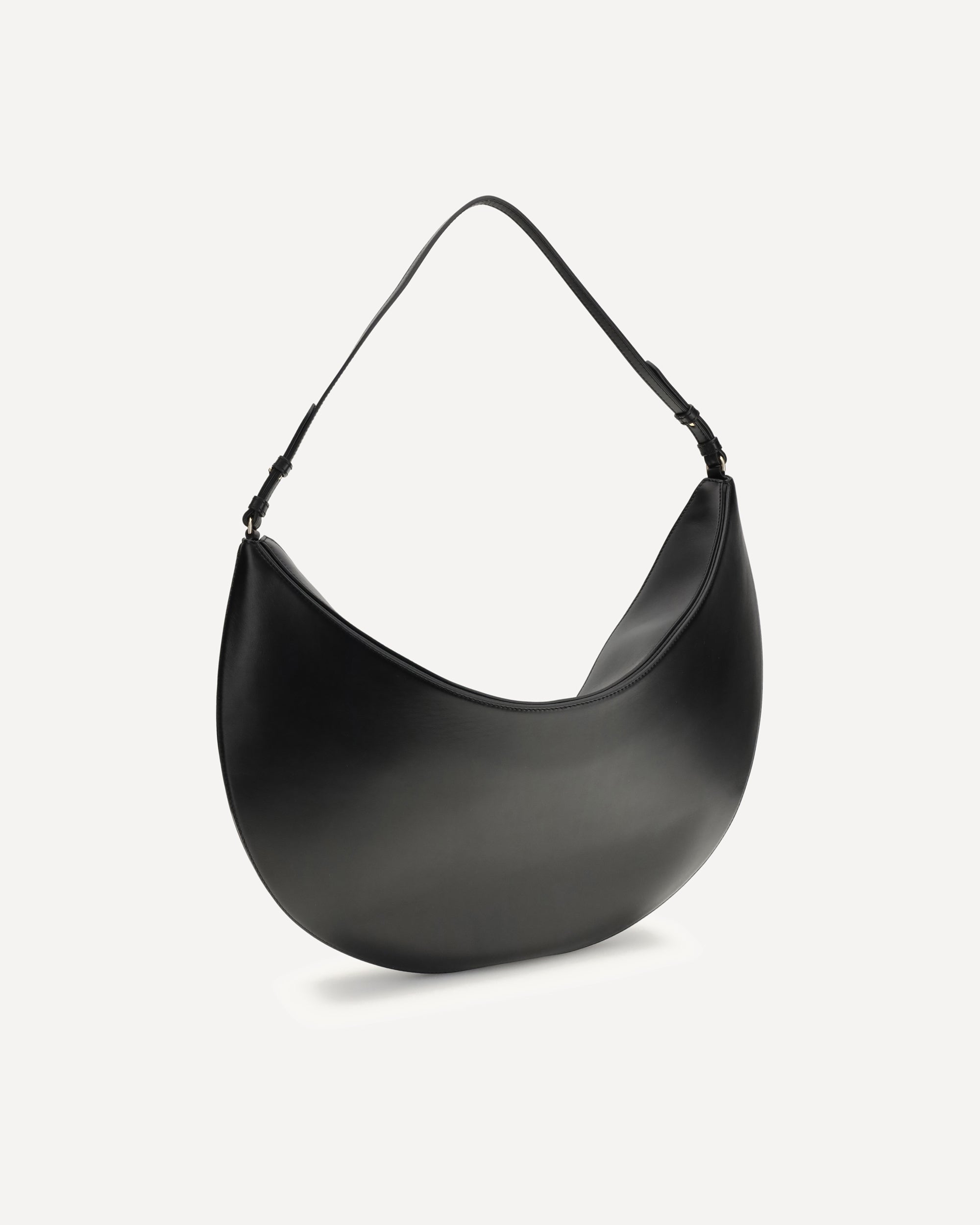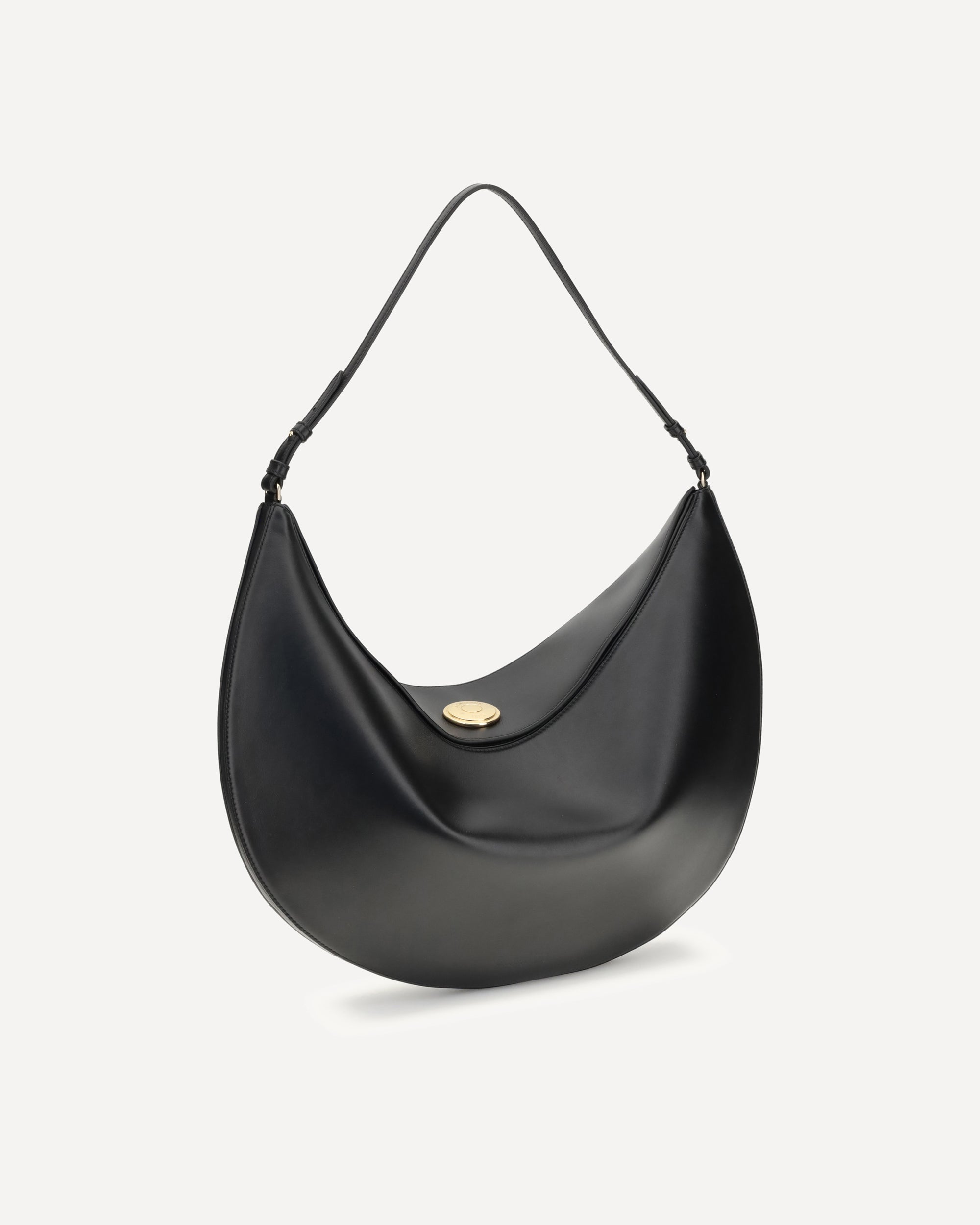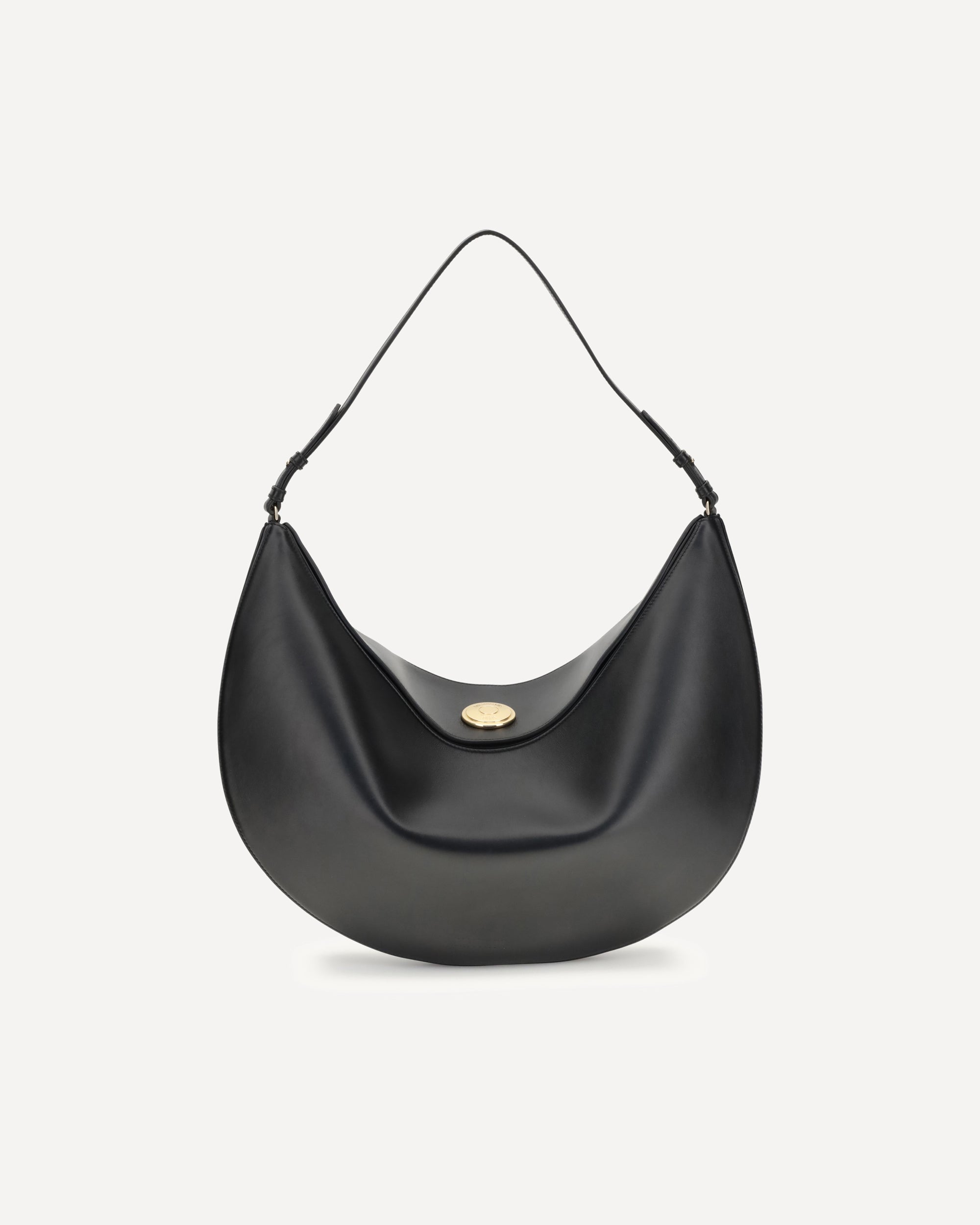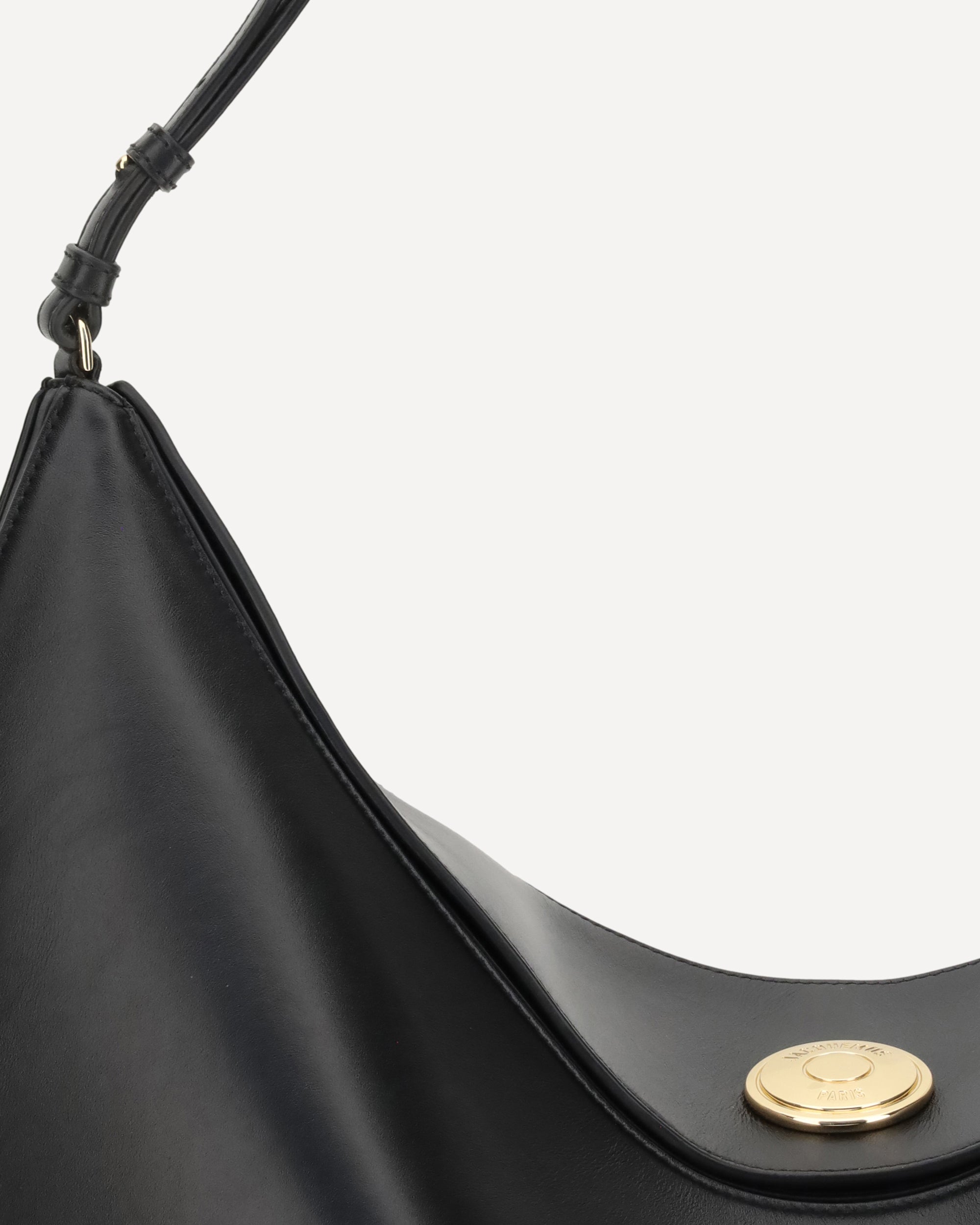 La Borsa Ovalo di Jacquemus è un’elegante borsa hobo grande in pelle liscia, caratterizzata da una tracolla sottile che ne facilita il trasporto. La patta magnetica con grande bottone a pressione inciso assicura chiusura e sicurezza, mentre l’interno dispone di una tasca in pelle con zip e scomparti per carte di credito. Il logo goffrato e la fodera interna completamente in cotone completano questo accessorio raffinato e versatile.