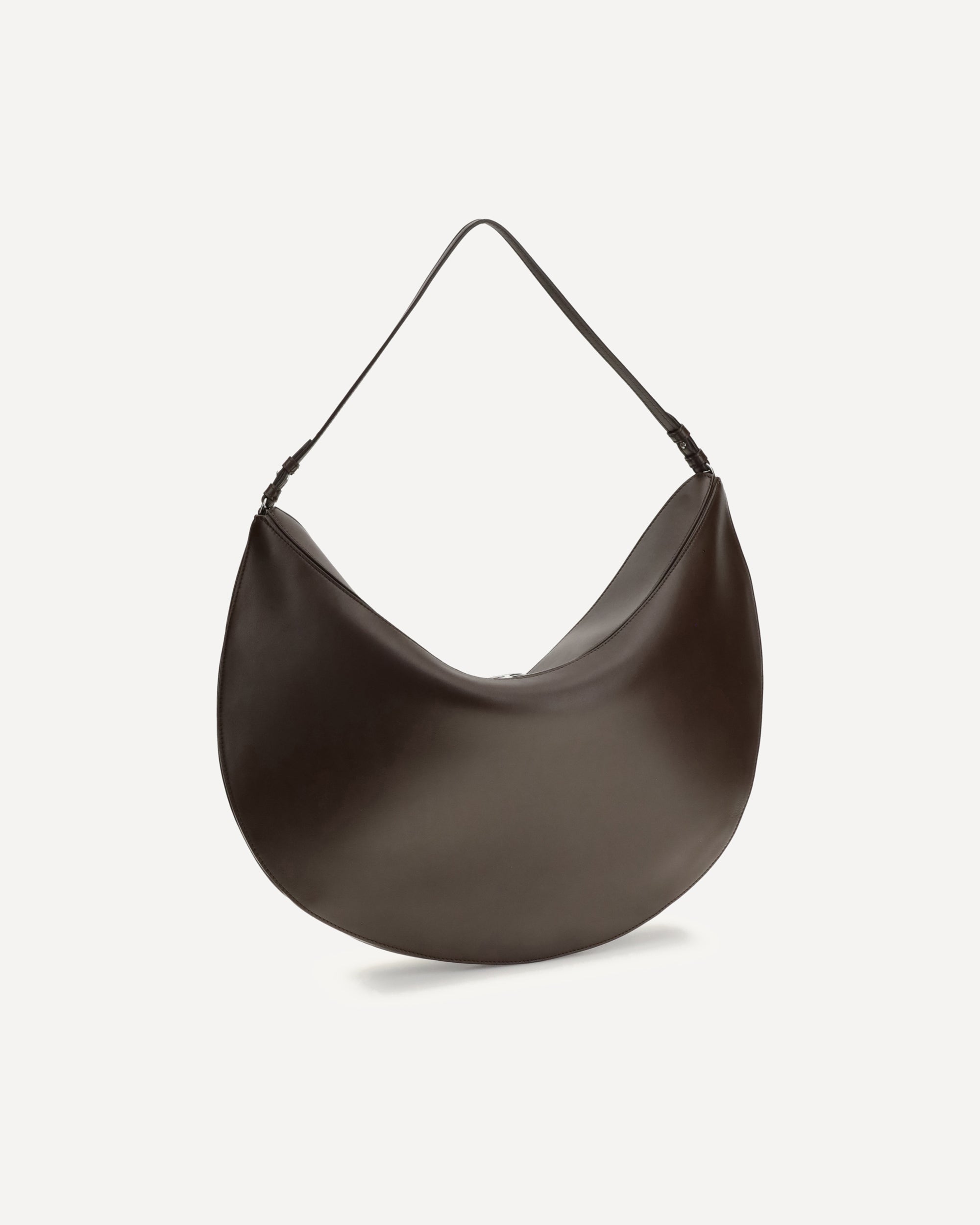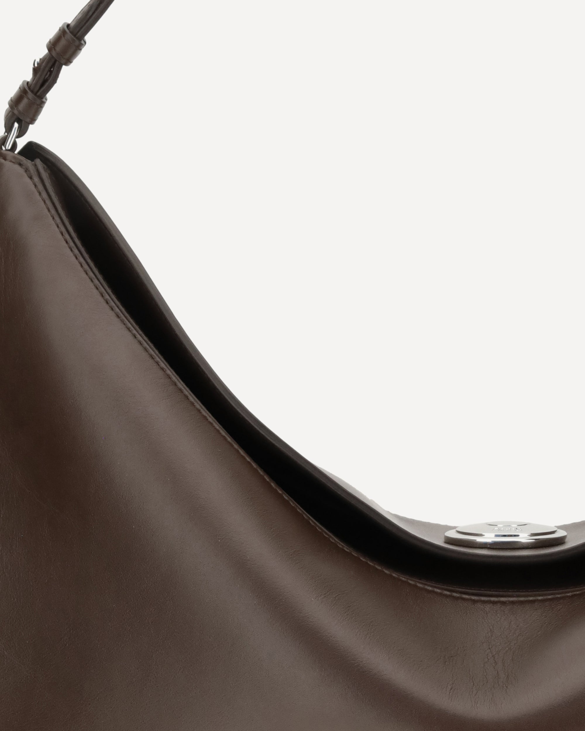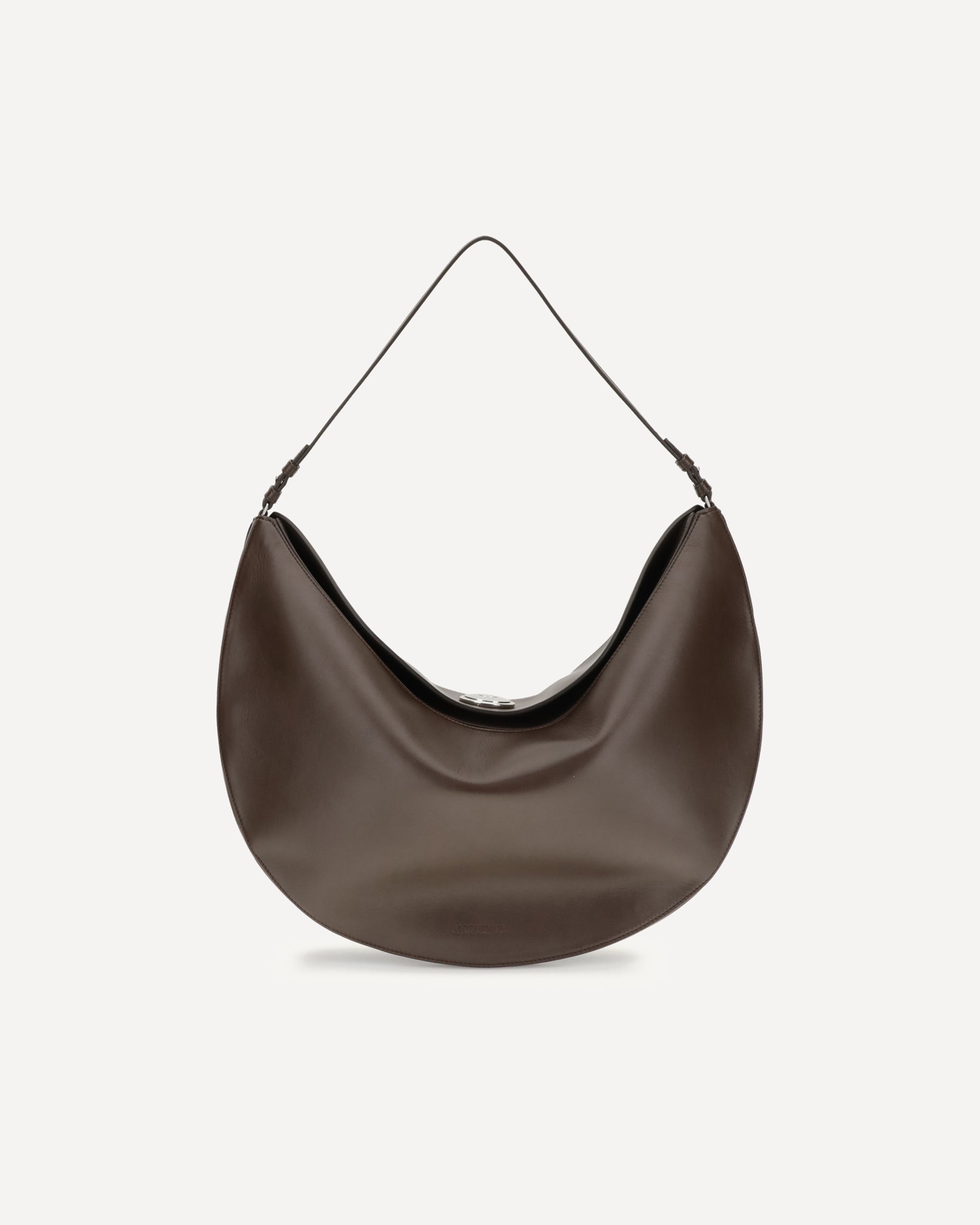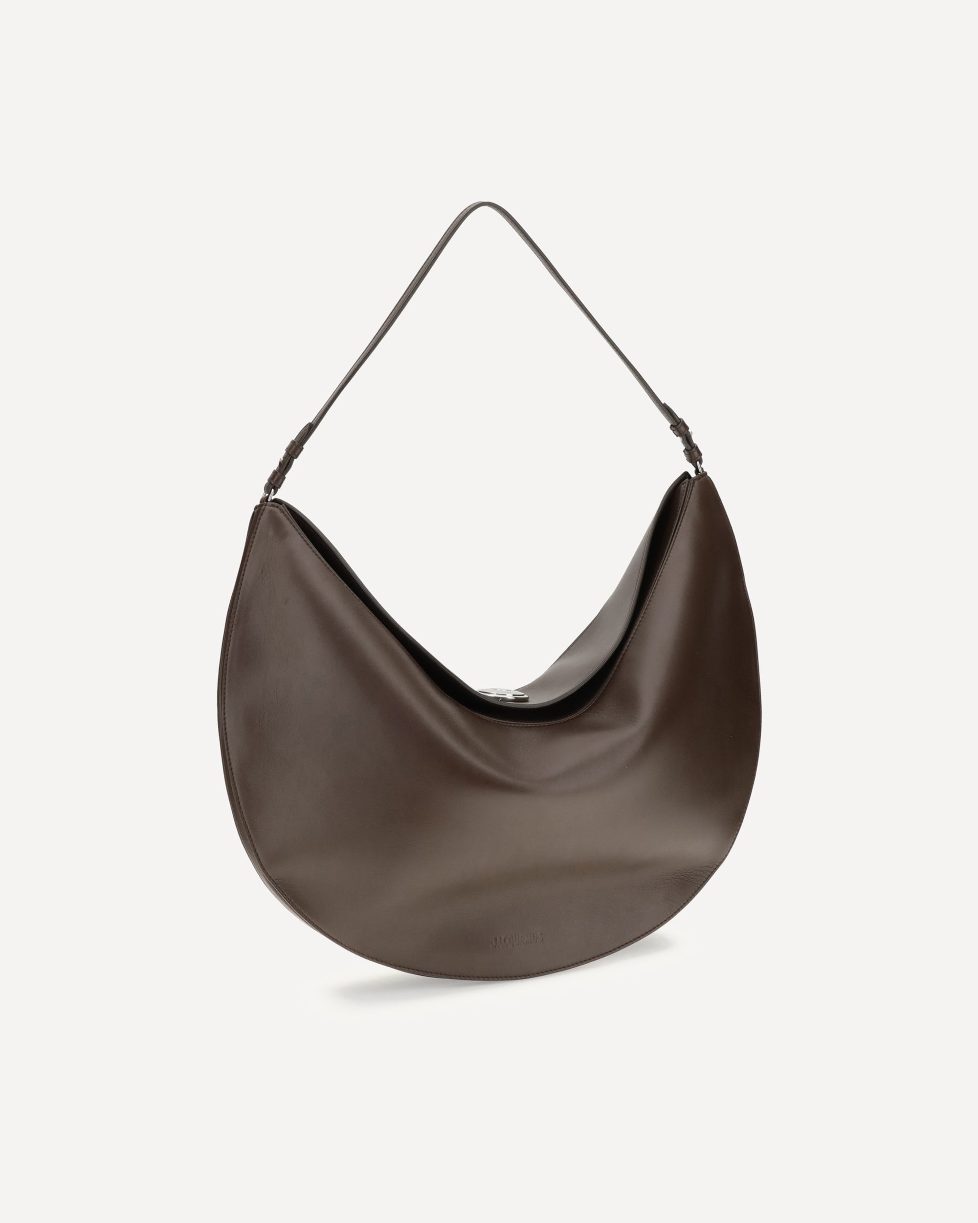 La Borsa Ovalo di Jacquemus è un’elegante borsa hobo grande in pelle liscia, caratterizzata da una tracolla sottile che ne facilita il trasporto. La patta magnetica con grande bottone a pressione inciso assicura chiusura e sicurezza, mentre l’interno dispone di una tasca in pelle con zip e scomparti per carte di credito. Il logo goffrato e la fodera interna completamente in cotone completano questo accessorio raffinato e versatile.