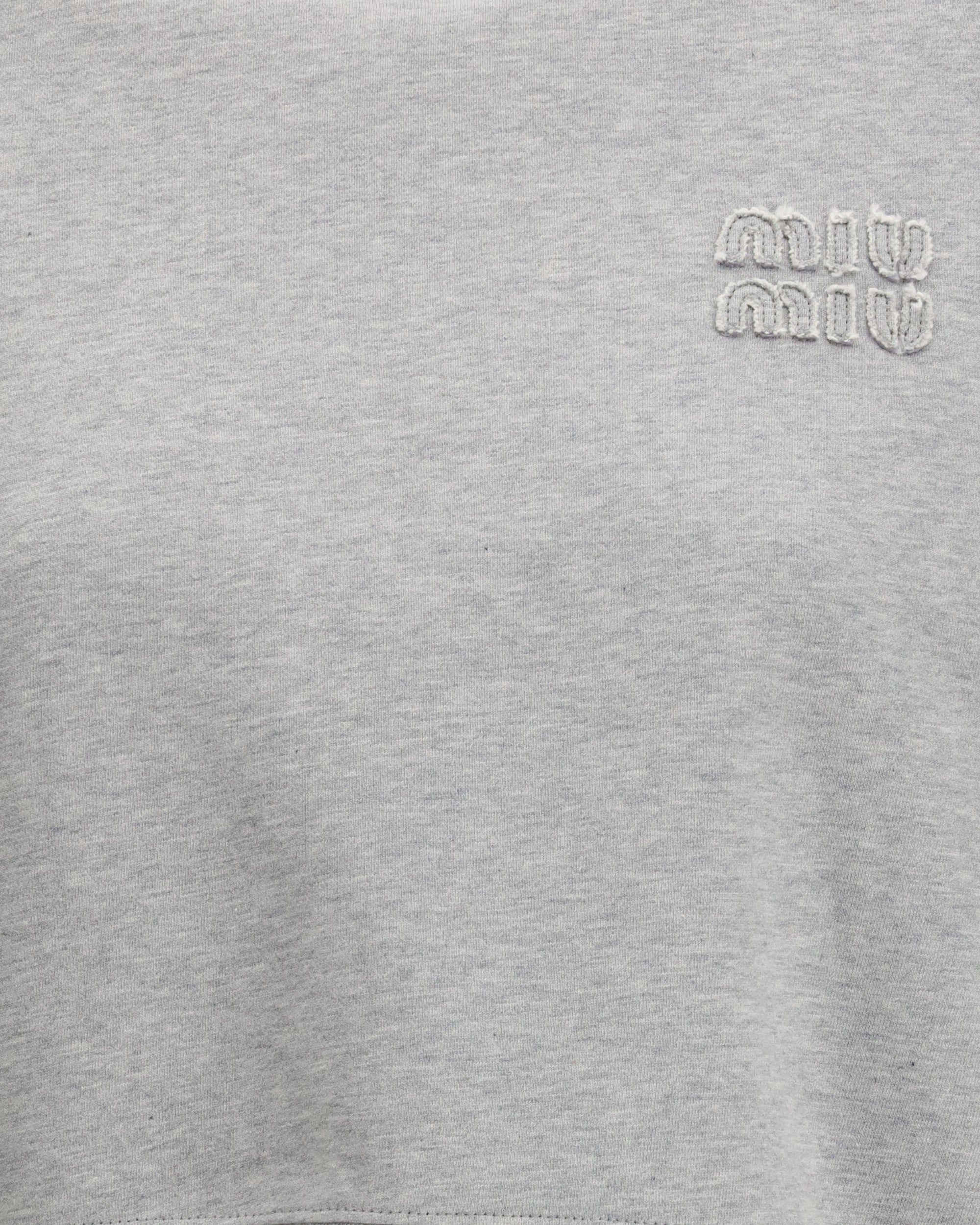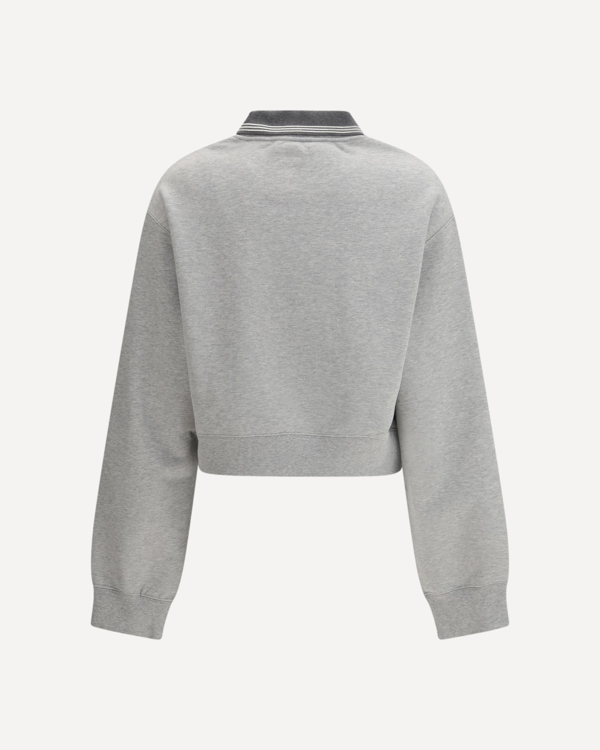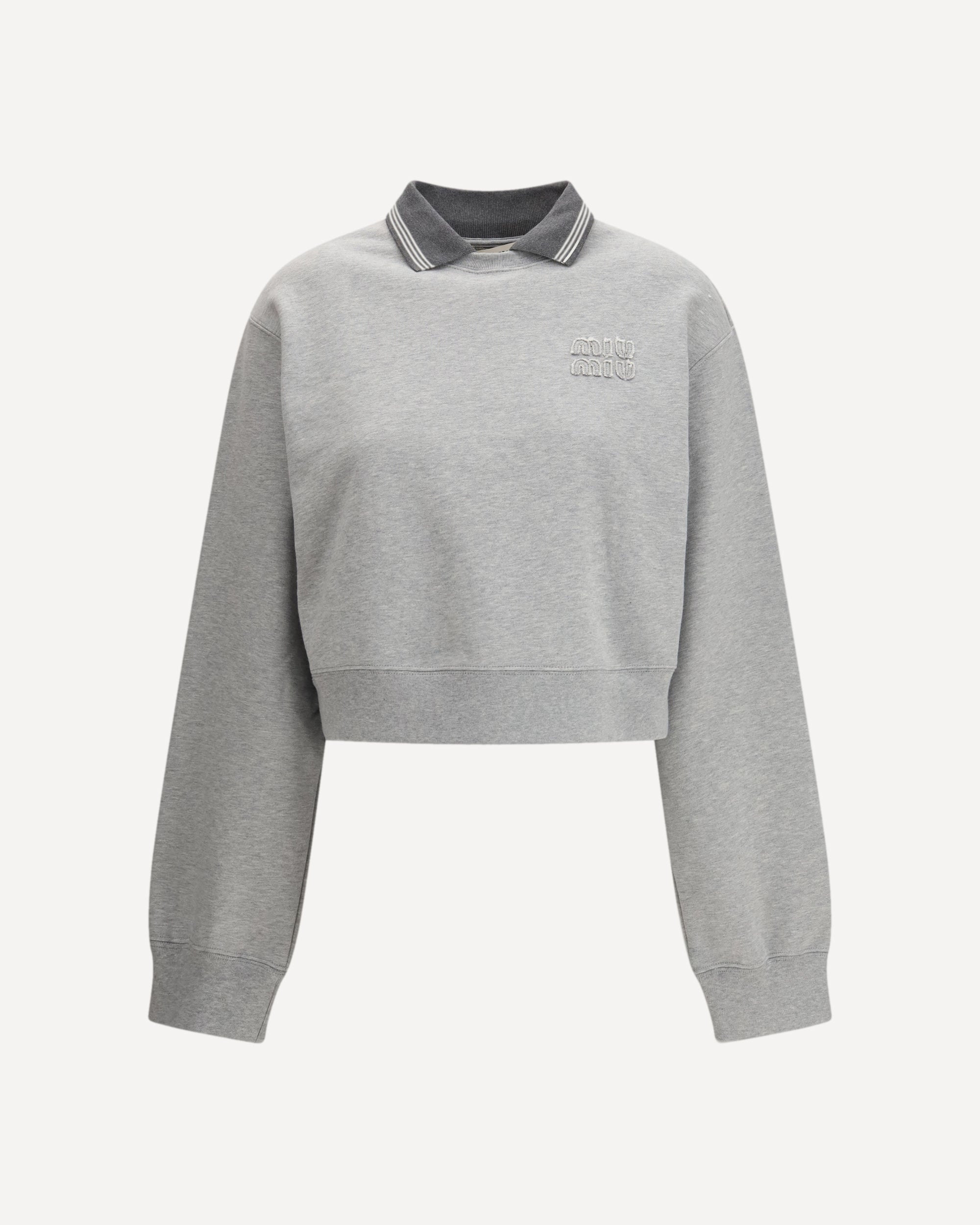 La Felpa di Miu Miu presenta un design essenziale e raffinato, definito da maniche lunghe, colletto a contrasto e bordi a costine che aggiungono struttura al capo. Il logo ricamato sul davanti completa il modello con un dettaglio iconico della maison, per un’estetica quotidiana ma distintiva.