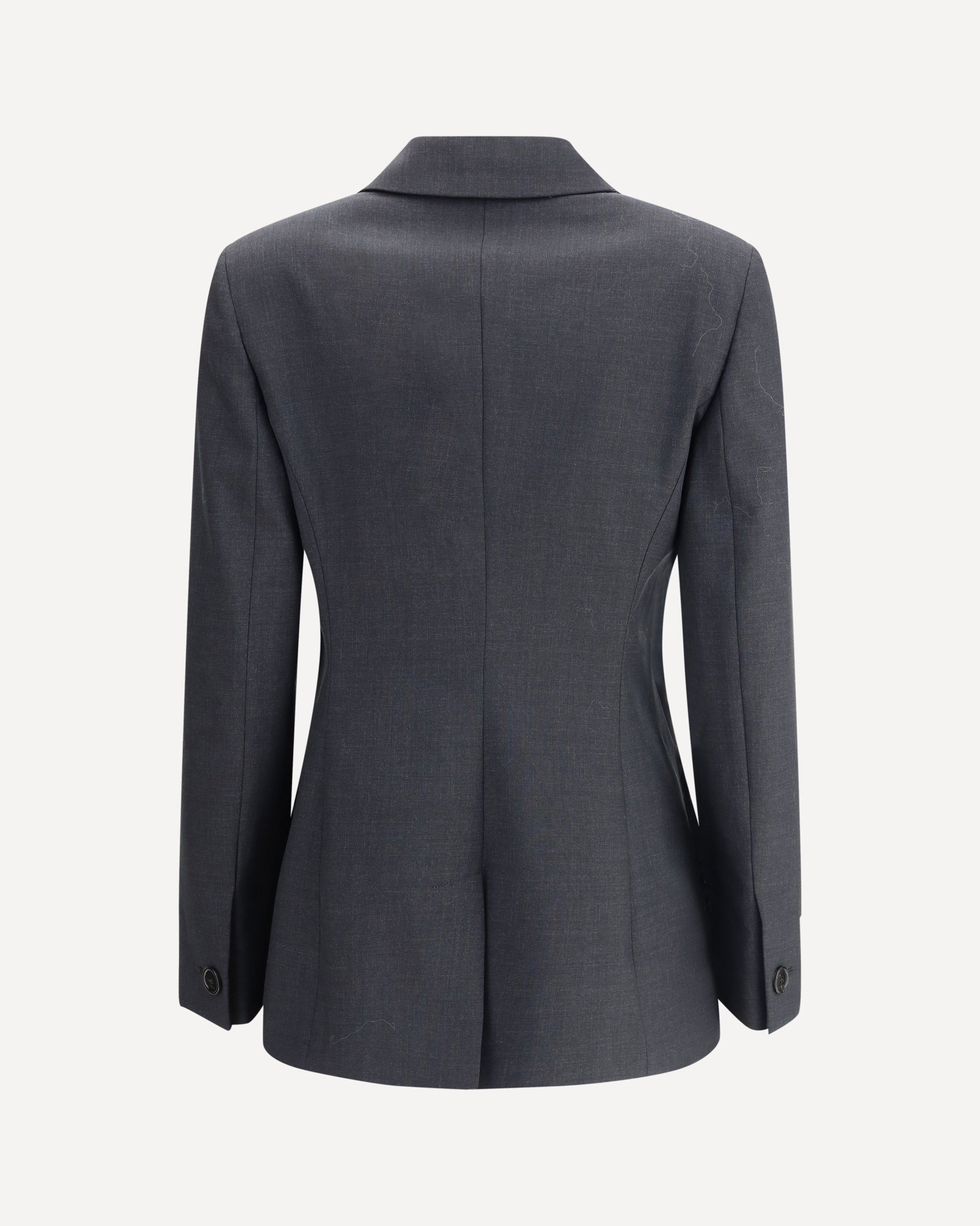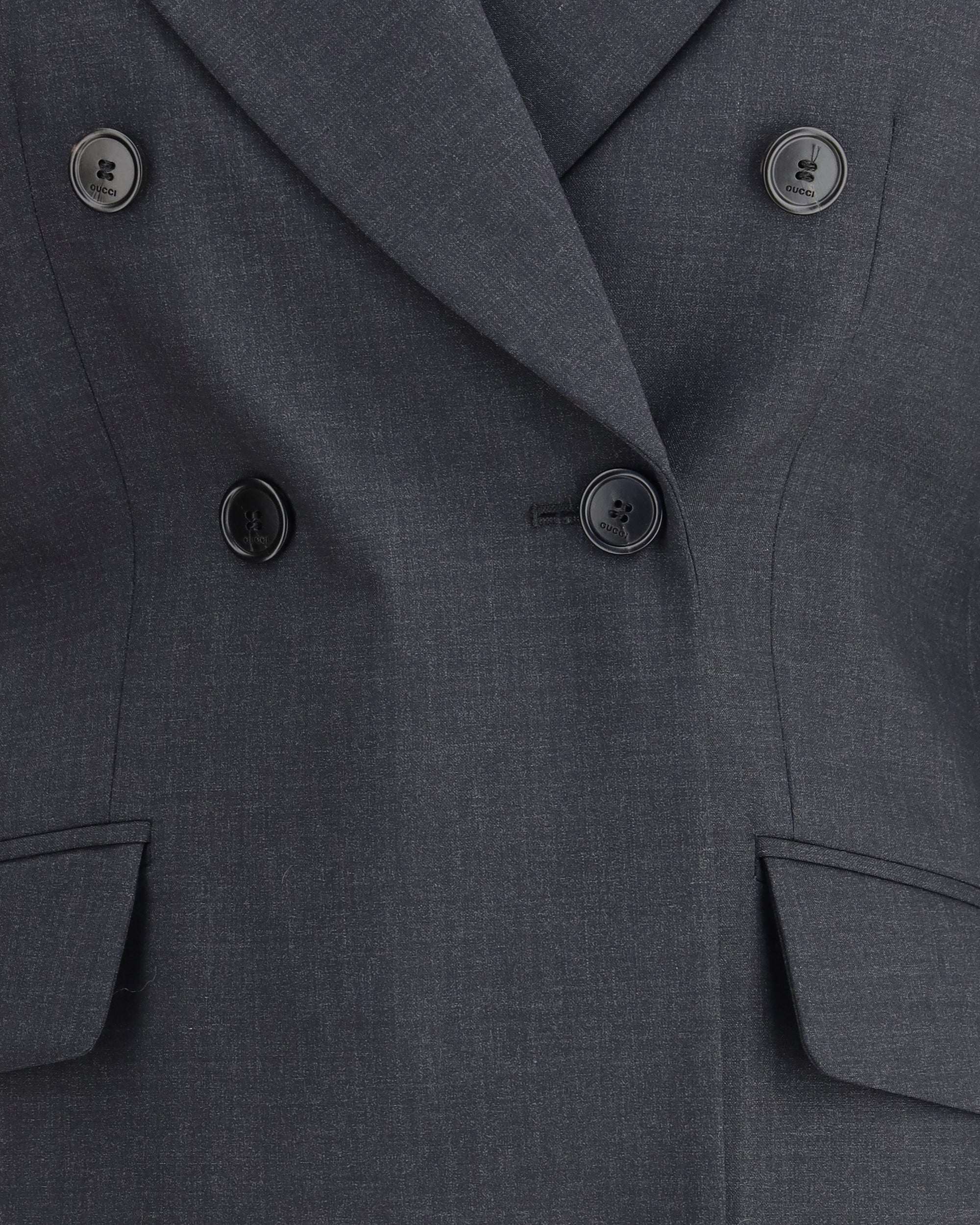 Il Blazer in lana di Gucci è un capo classico dallo stile deciso, arricchito da dettagli sartoriali distintivi. La chiusura doppiopetto con bottoni dona struttura e raffinatezza, mentre le due tasche frontali a filetto con patta aggiungono funzionalità e simmetria al design. I revers a lancia completano la silhouette con un tocco elegante e maschile, rendendo questo blazer un must-have del guardaroba formale e contemporaneo.