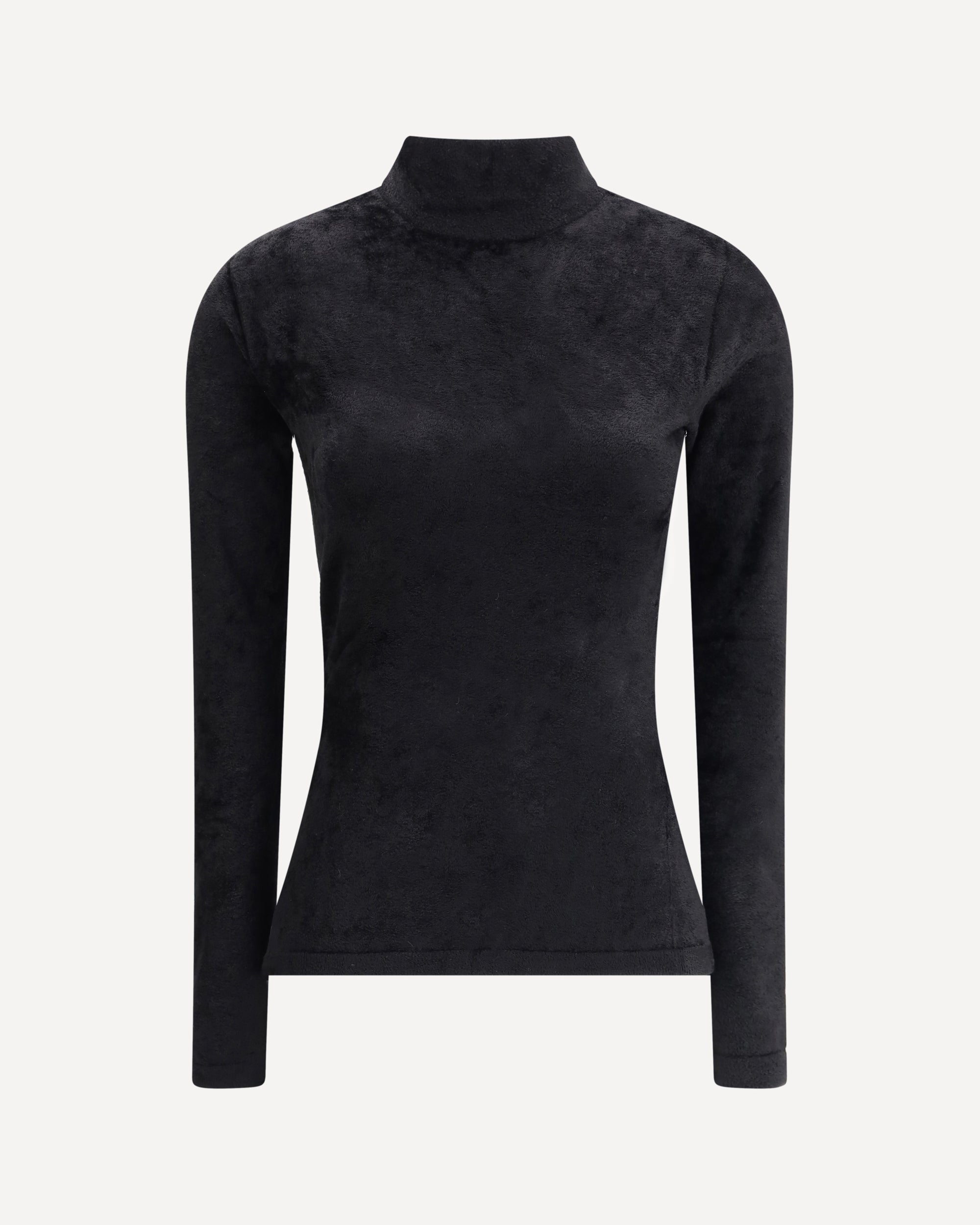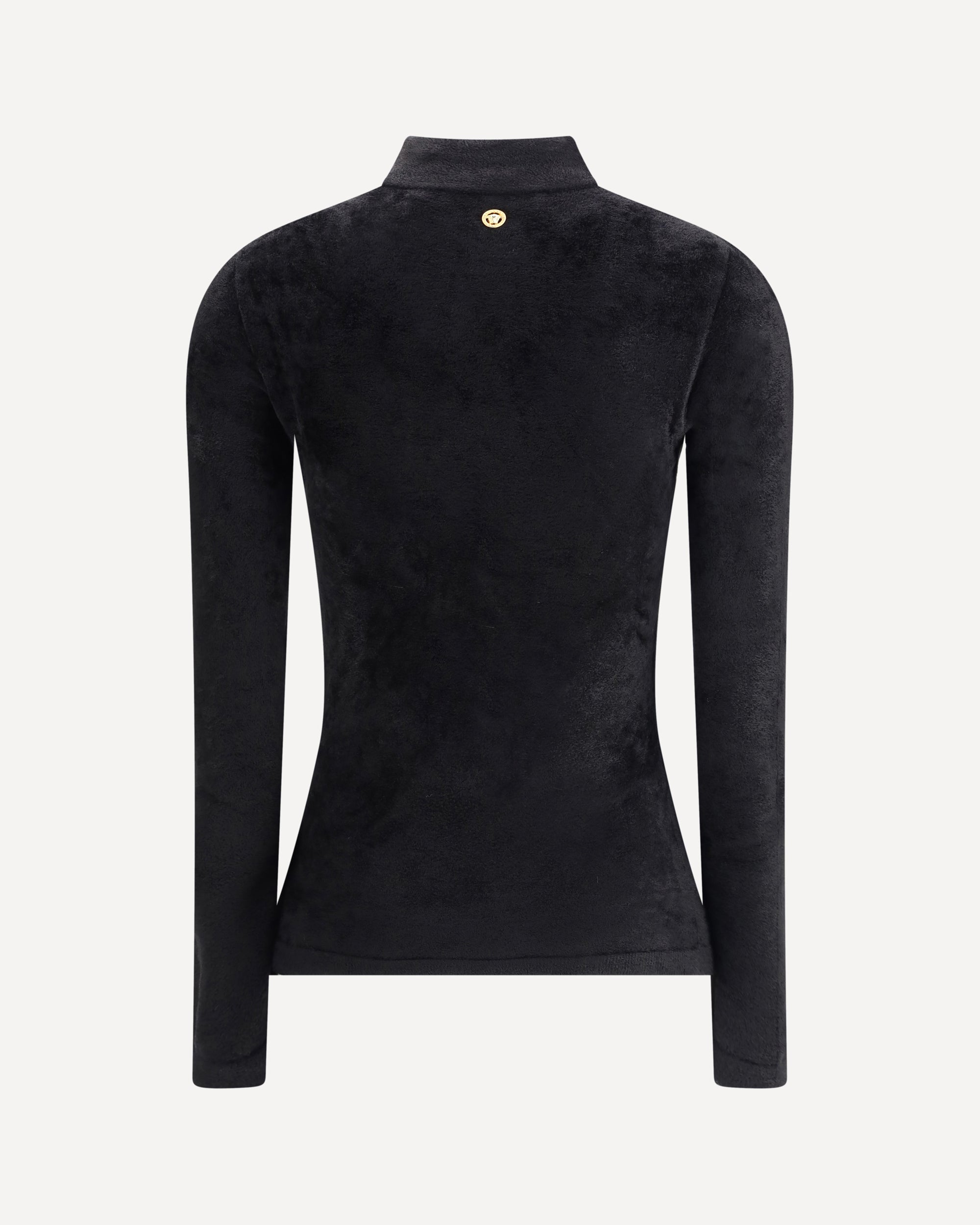 Il Top in ciniglia di Versace unisce comfort e sensualità in un design dal gusto deciso. Caratterizzato da maniche lunghe e mezzo collo, è realizzato in una morbida ciniglia che avvolge la silhouette con eleganza. Sul retro, una piccola borchia Medusa firma il capo con un tocco iconico, mentre la chiusura con gancetti aggiunge un dettaglio raffinato e femminile.