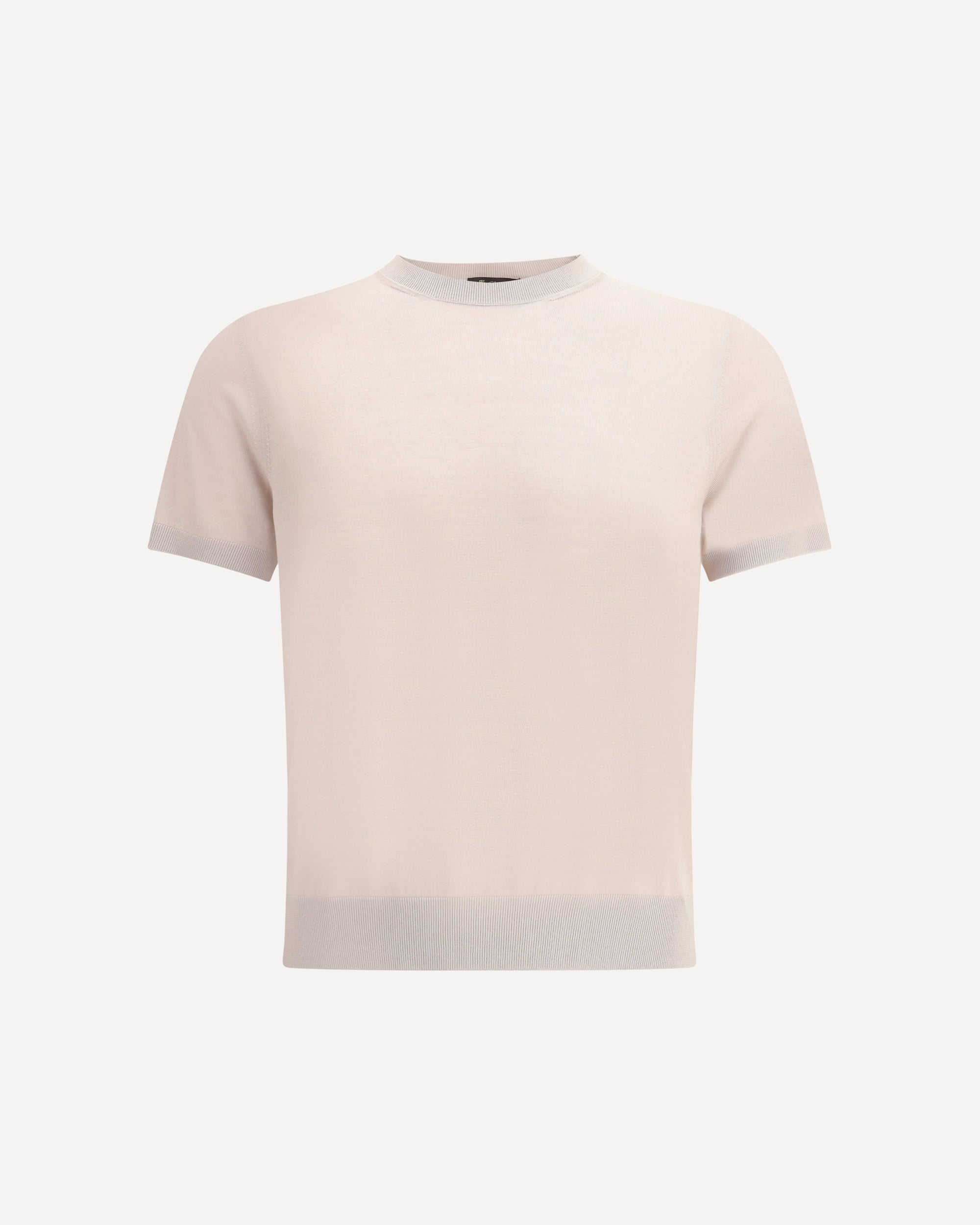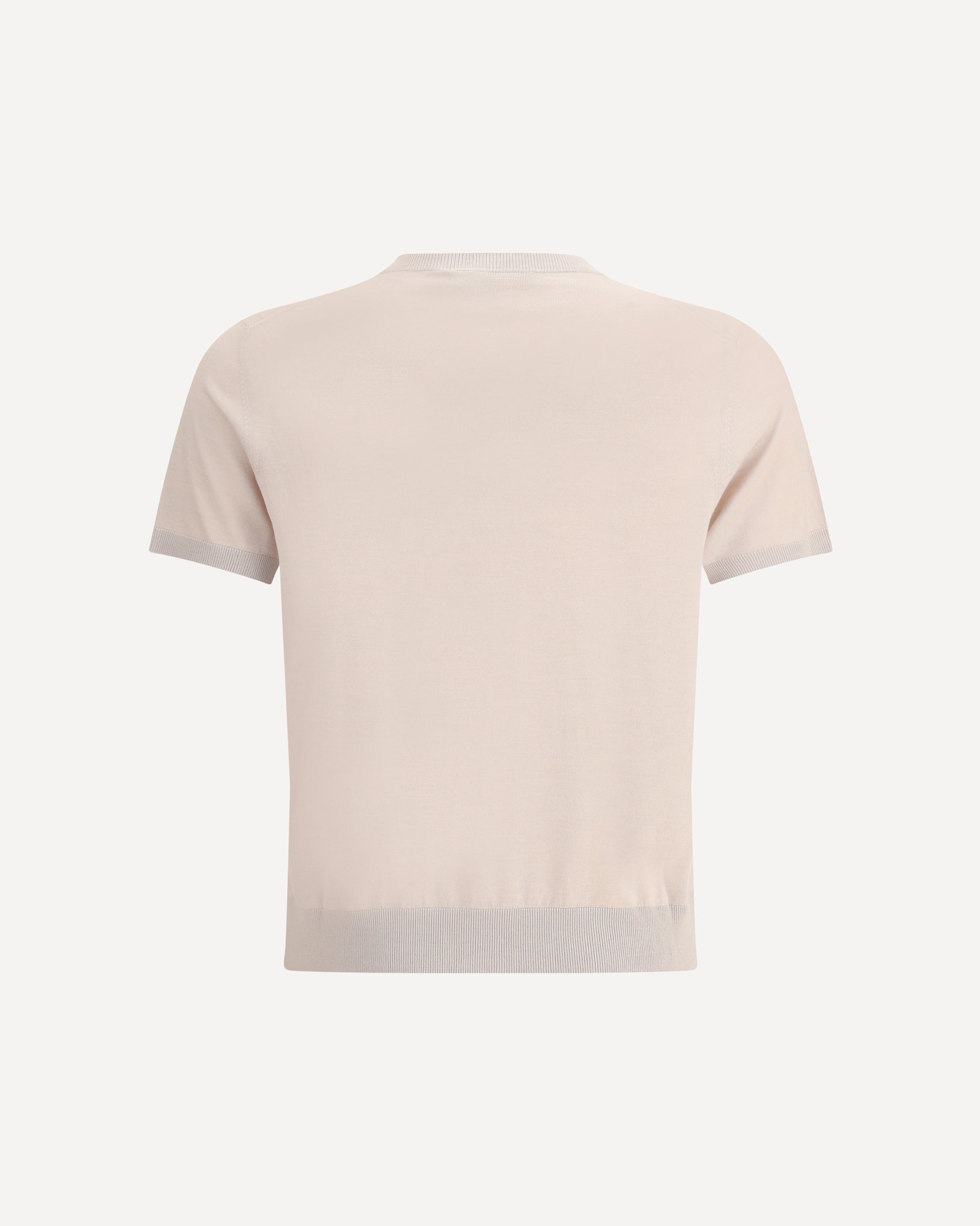 T-Shirt in lana vergine, seta e cashmere di Loro Piana, caratterizzata da un morbido girocollo a costine e orlo rifinito a costine per un dettaglio di pregio. Realizzata con un mix esclusivo di materiali pregiati, questa T-shirt offre una fantasia monocromo elegante e sofisticata. Perfetta per chi cerca un capo versatile che unisce comfort, lusso e stile contemporaneo, adatto sia a look casual che a outfit più ricercati.