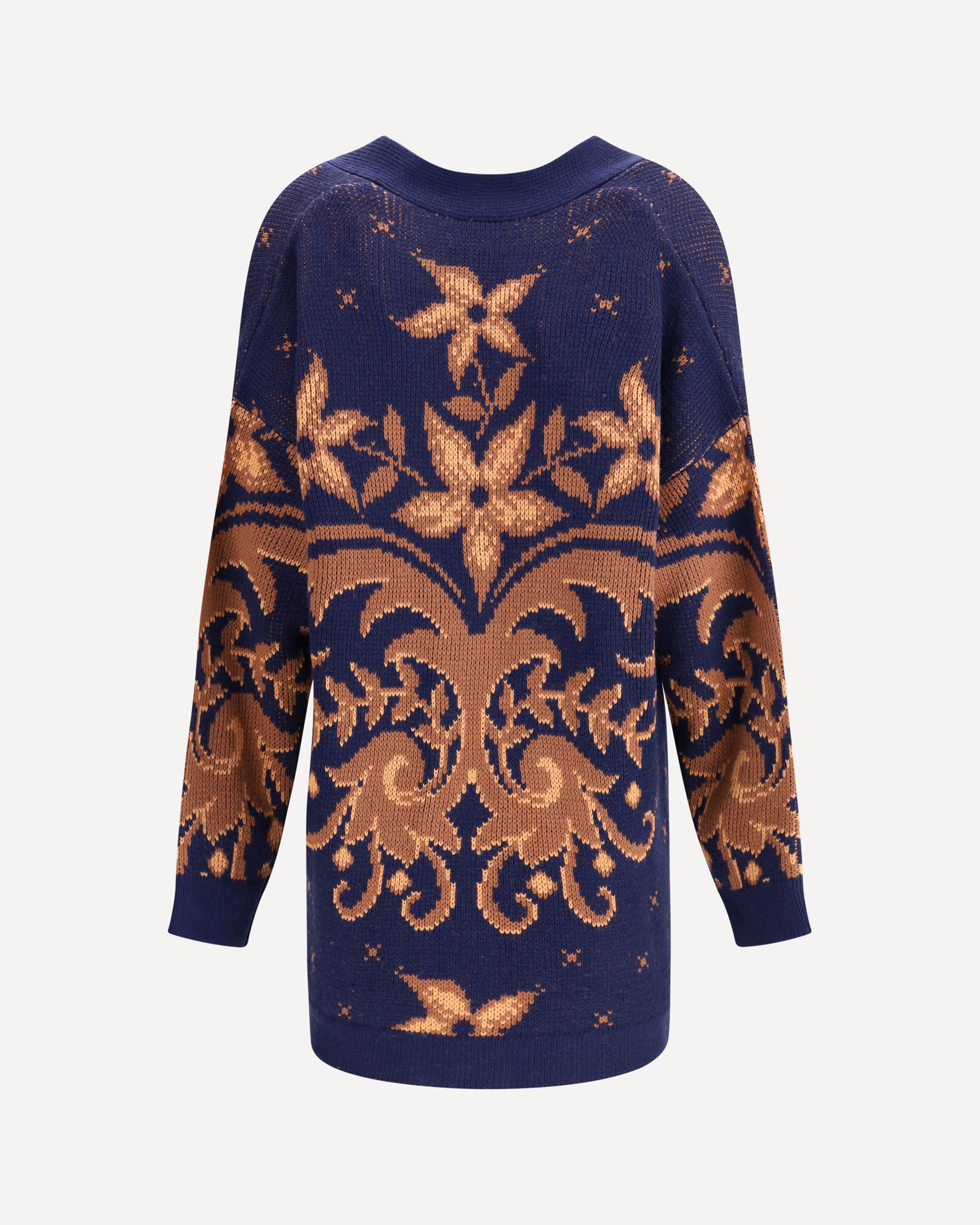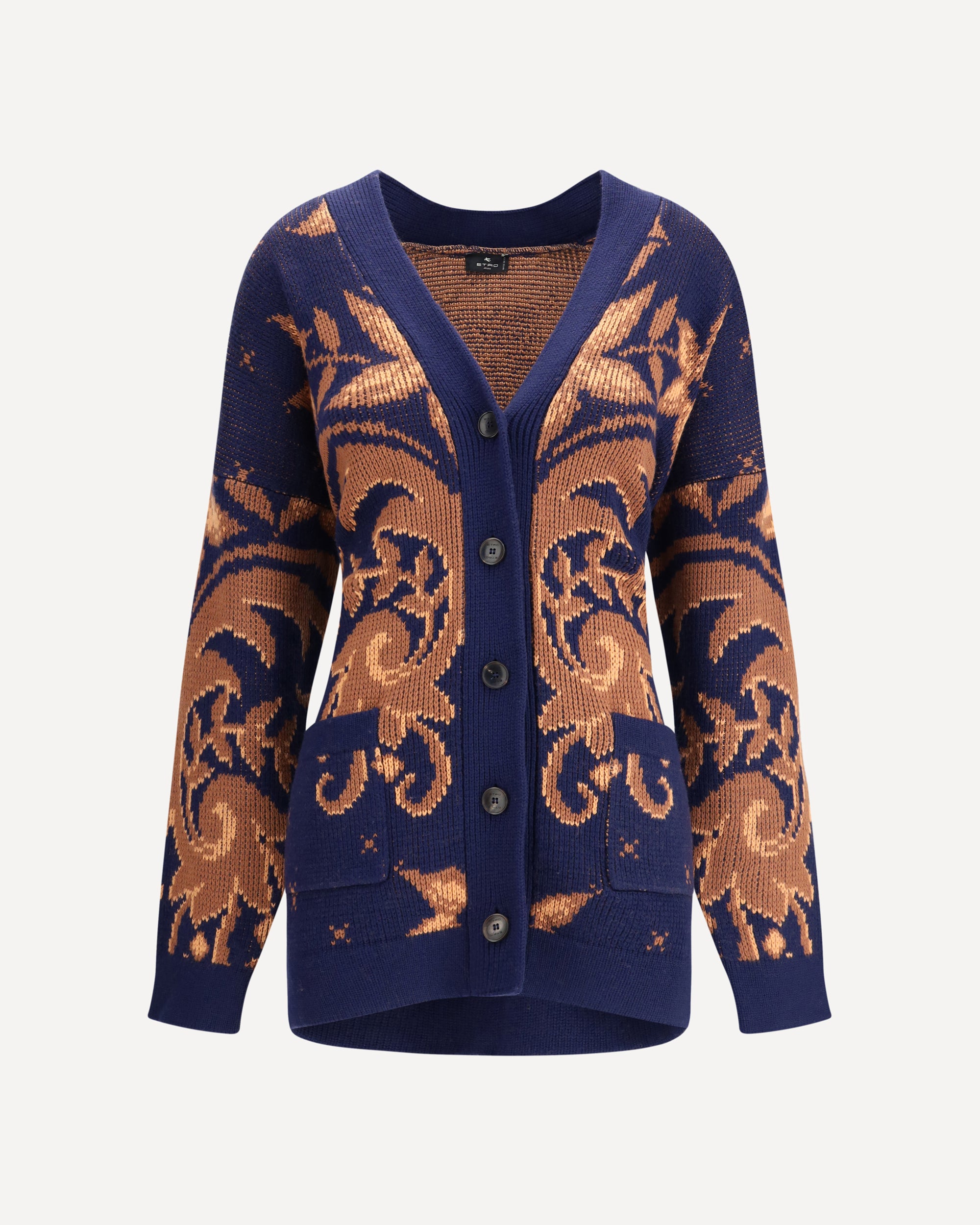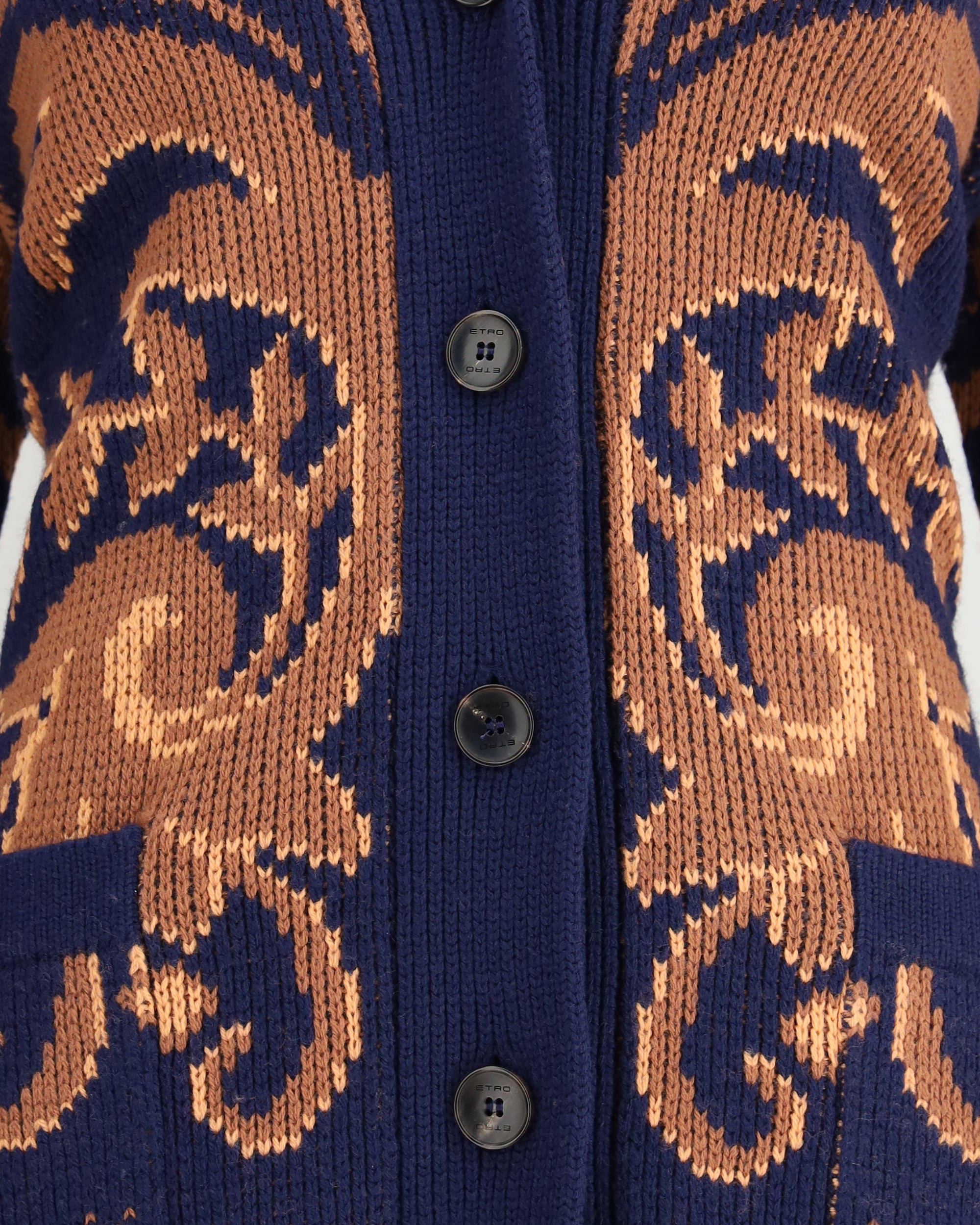Il Cardigan in lana jacquard di Etro è caratterizzato da una linea ampia e da un motivo piazzato d’ispirazione floreale. Realizzato in calda lana jacquard, presenta scollo a V, chiusura con bottoni e tasche laterali applicate. La vestibilità over dona al capo un’eleganza rilassata e sofisticata.