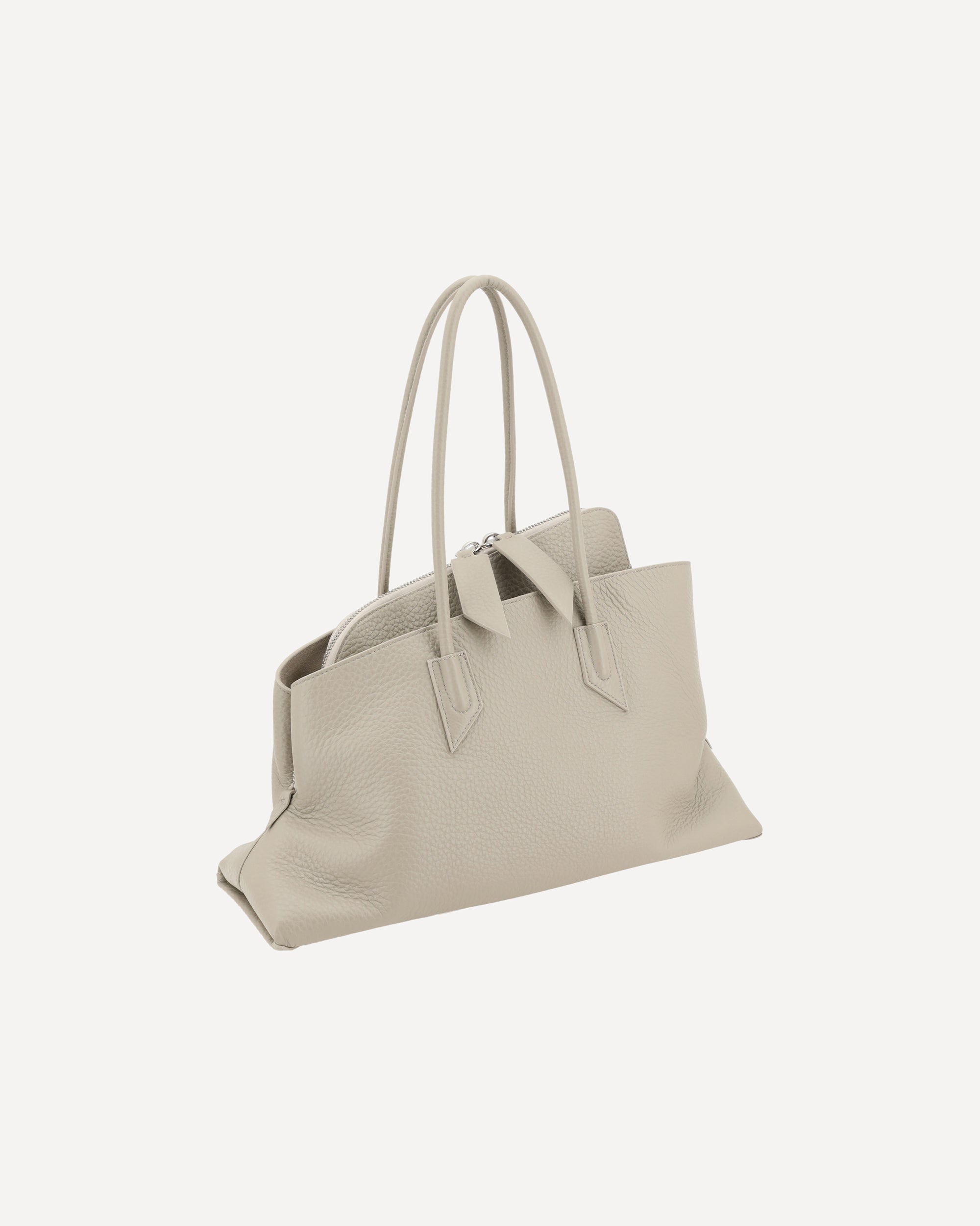 Borsa a Spalla La Passeggiata in Pelle di The Attico, due manici piatti tubolari nella parte superiore, chiusura superiore con cerniera a doppio cursore, cursori geometrici, iconica firma brand stampata a pressione sul fronte a contrasto, borsa geometrica asimmetrica.