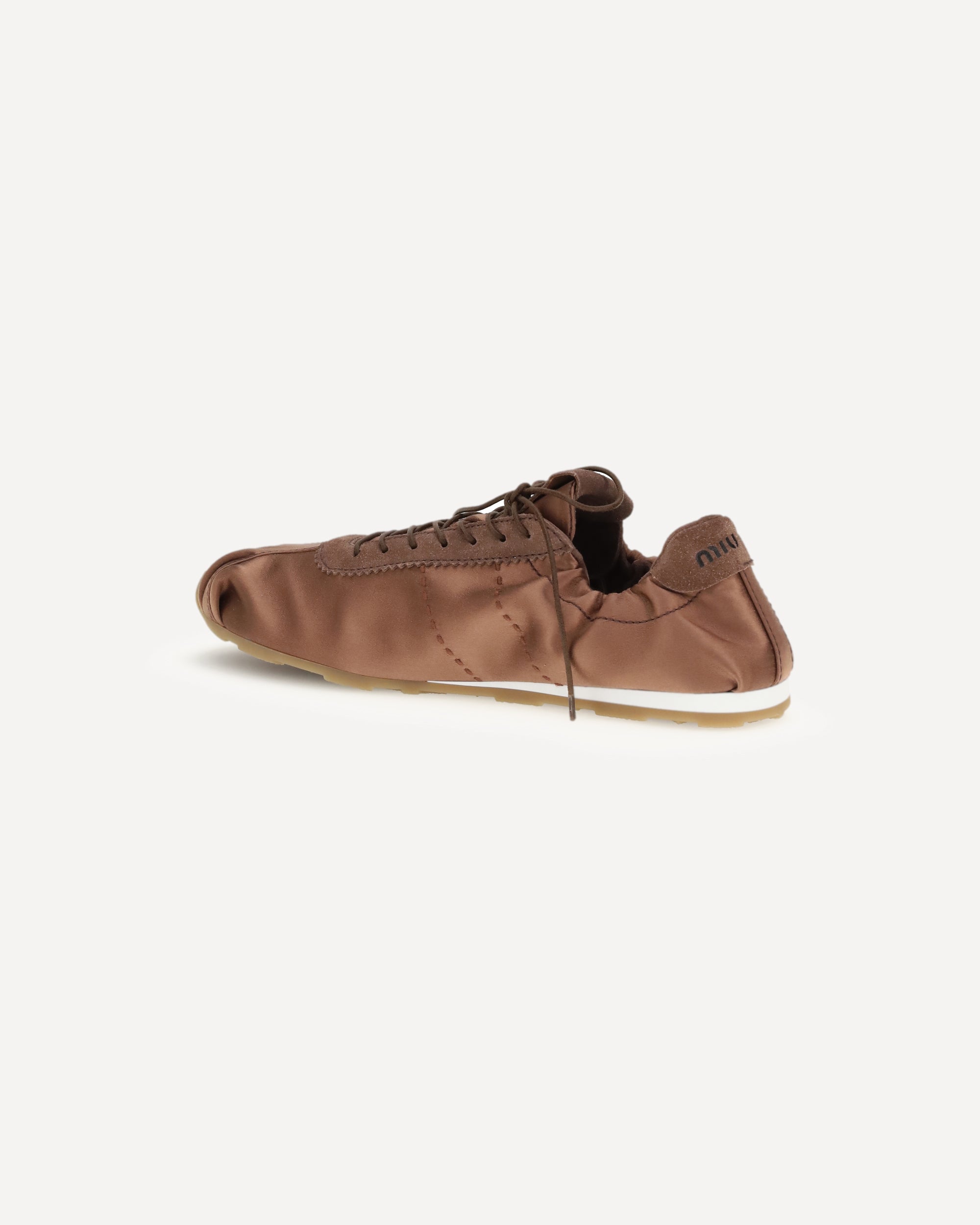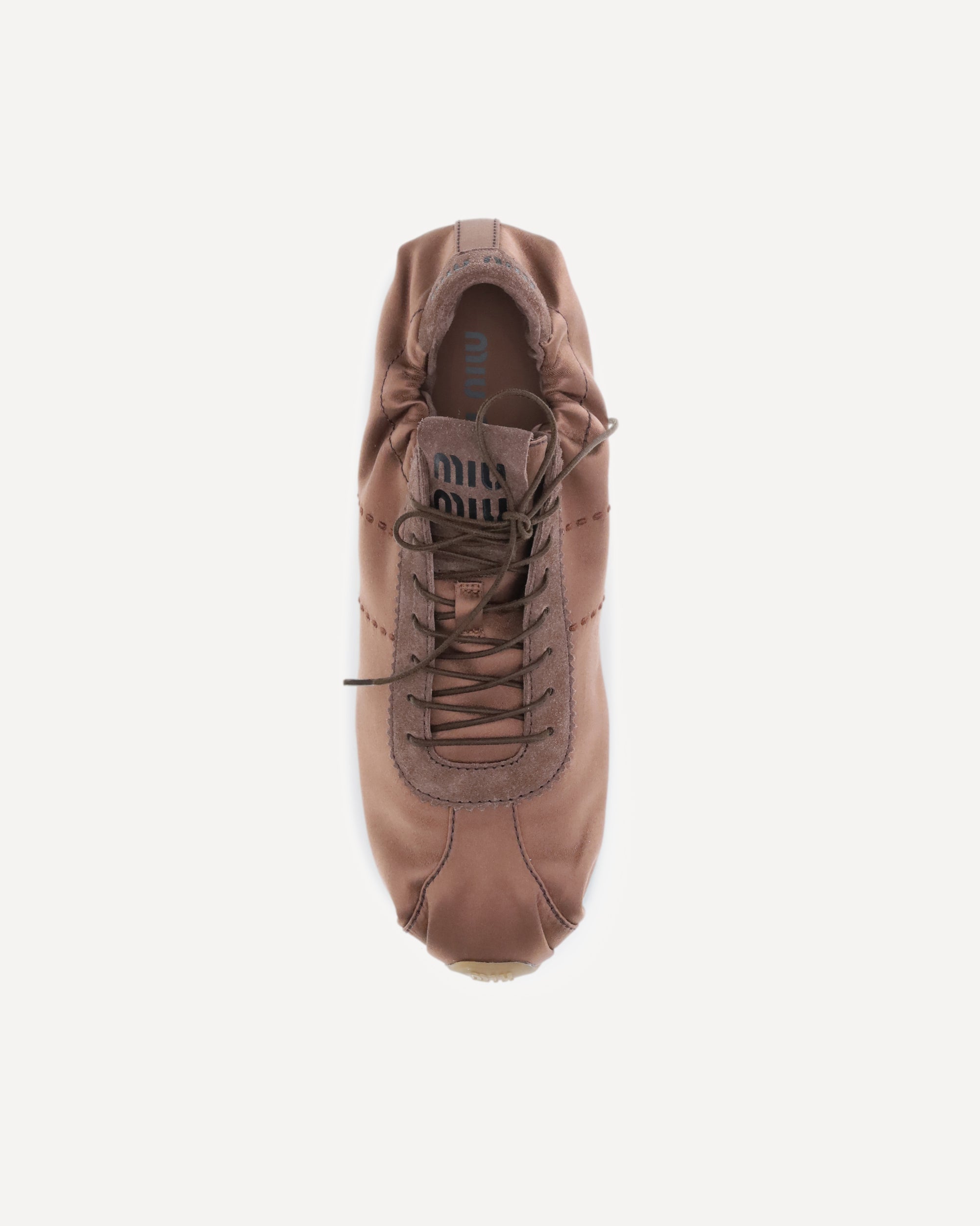 Le Sneakers Plume in raso di Miu Miu uniscono la leggerezza estrema del modello alla raffinatezza del raso, richiamando l’eleganza dell’iconica ballerina e interpretando lo stile della Maison attraverso colori sofisticati e dettagli innovativi. La tomaia è arricchita da impunture, mentre la fodera in tessuto e l’allacciatura con stringhe garantiscono comfort e praticità. La suola in gomma con logo presenta un battistrada decorato da stelle, e il logo serigrafato compare su linguetta, soletta e dietrino, completando un design sperimentale e distintivo.