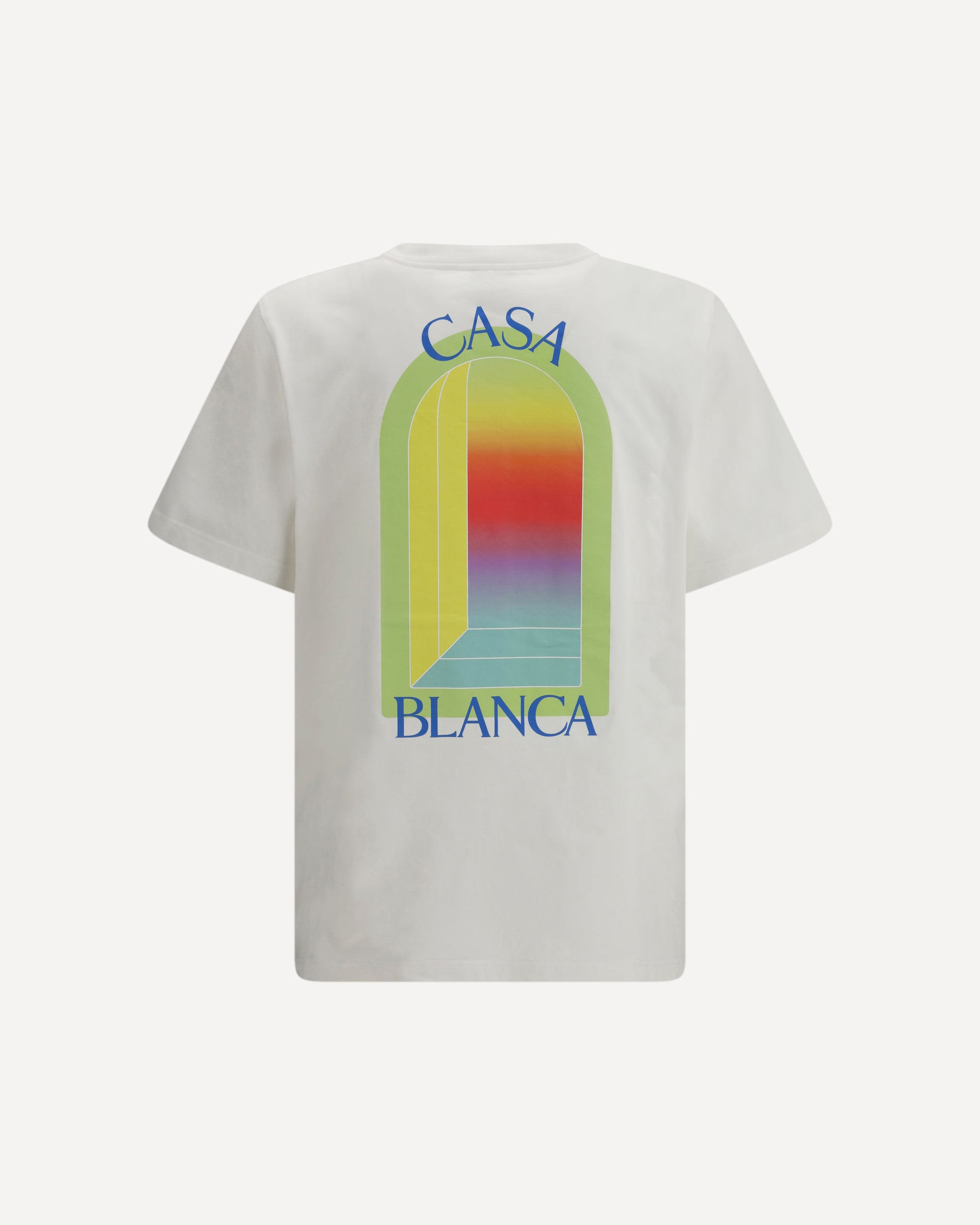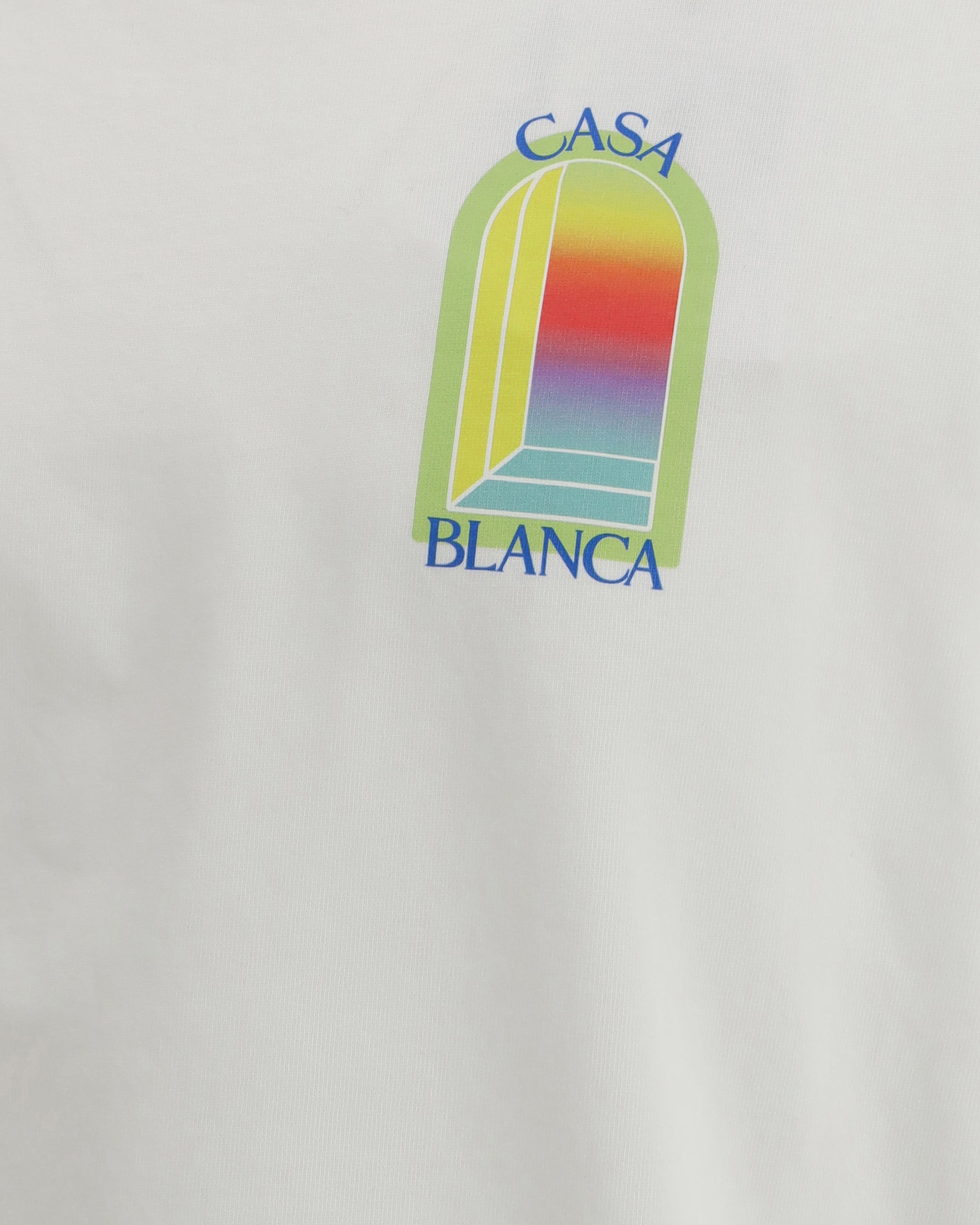 La T-shirt L'Arche di Casablanca è una maglietta a maniche corte realizzata in cotone biologico, caratterizzata dall’iconica stampa serigrafata dell’Arch, simbolo astratto di forza. Il modello presenta un classico girocollo a coste e una linea essenziale, valorizzata dalla texture morbida del tessuto stampato.