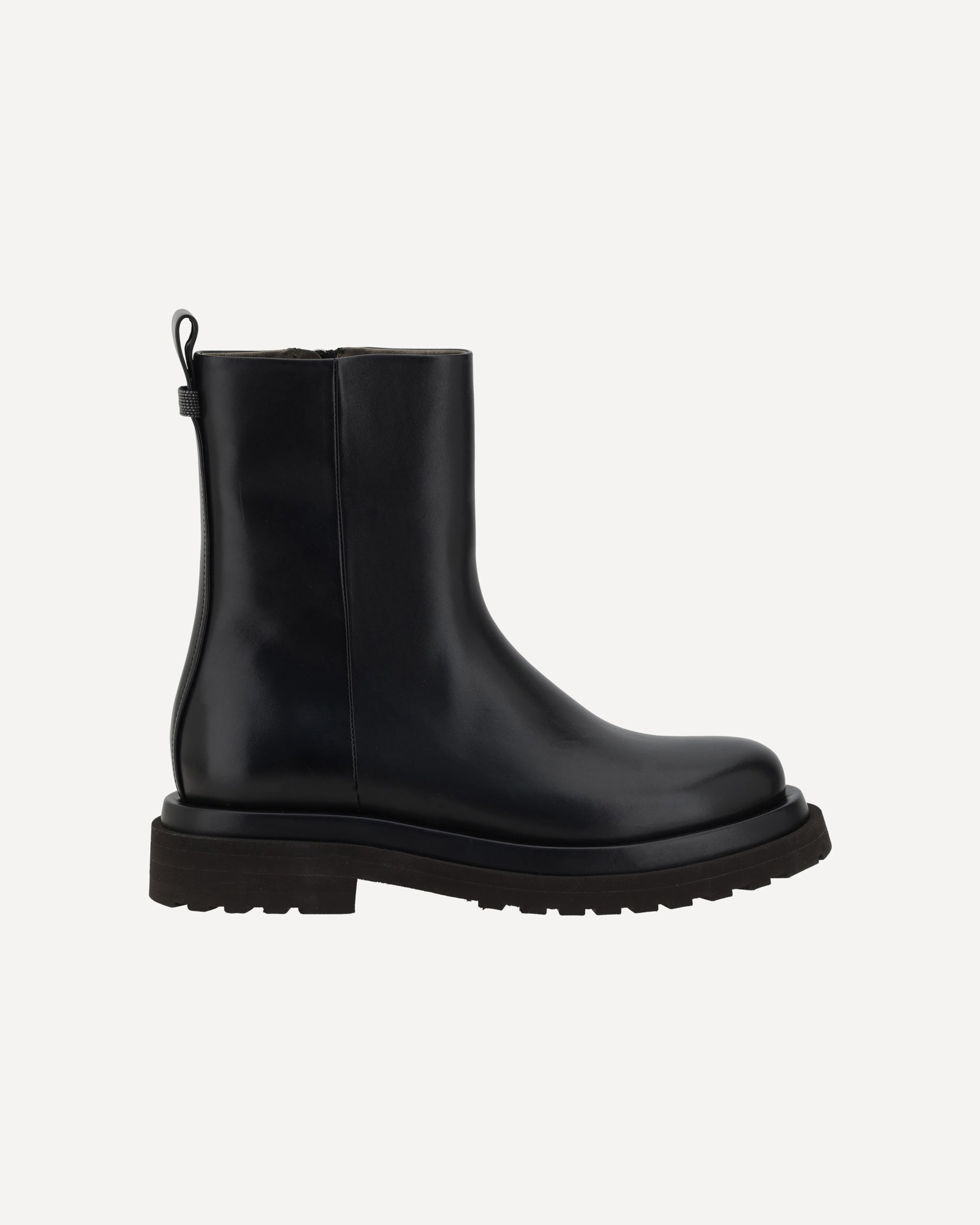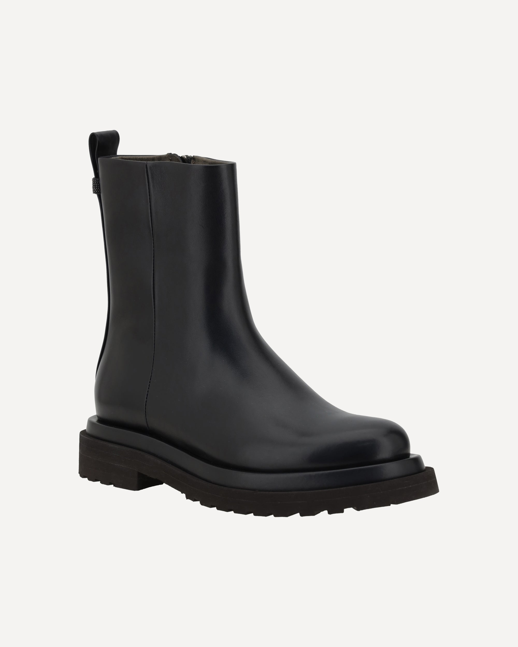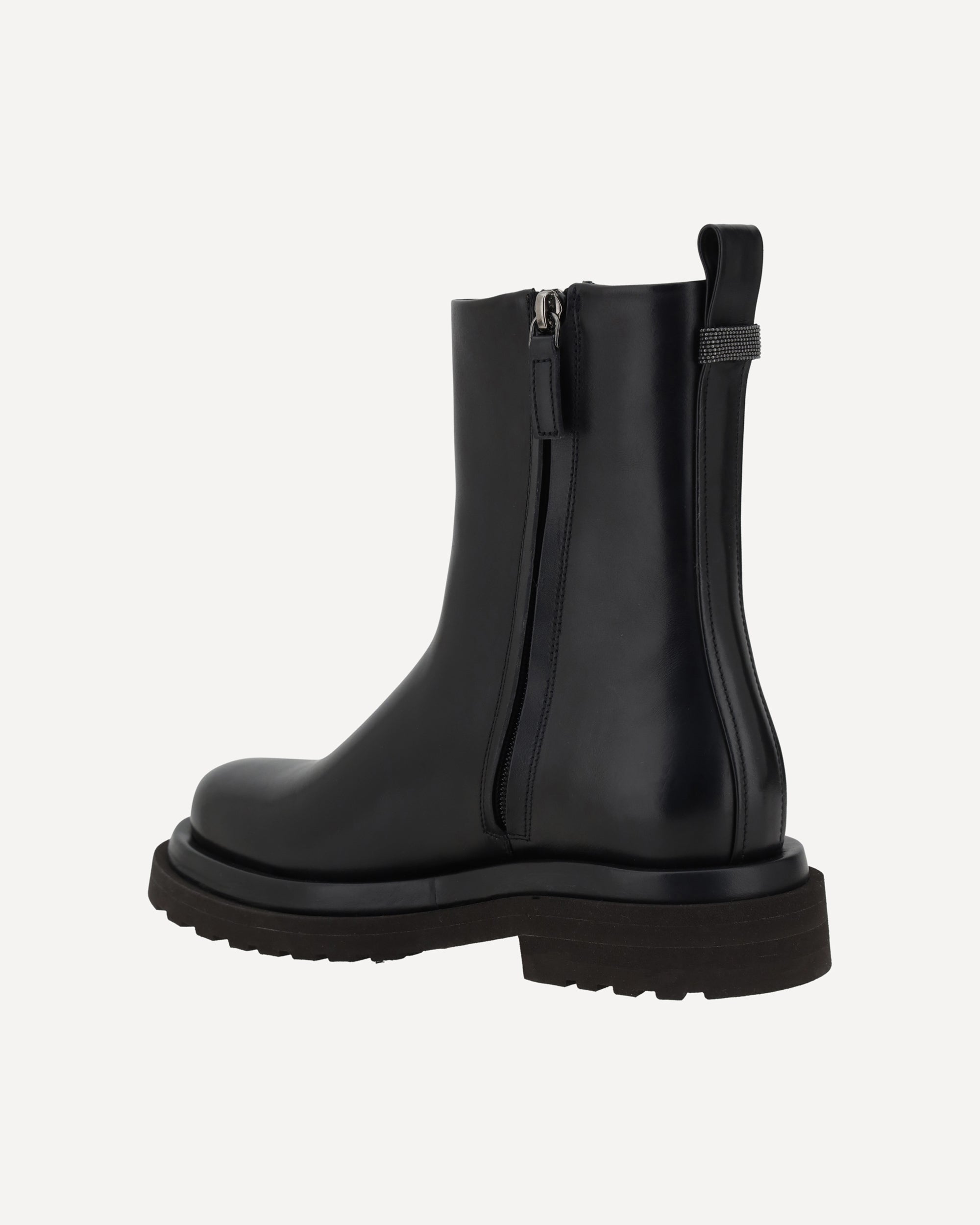 Gli Stivaletti in pelle di Brunello Cucinelli sono un capo elegante e funzionale, caratterizzati da una punta tonda che garantisce una calzata comoda. Il modello alla caviglia presenta bande laterali in tessuto elasticizzato che assicurano una vestibilità perfetta, mentre il tiretto sul retro facilita l'indossamento. Il design in pelle lucida conferisce un tocco di lusso, mentre il tacco a blocco aggiunge stabilità e comfort. Perfetti per completare con stile qualsiasi outfit, questi stivaletti sono ideali per ogni occasione.