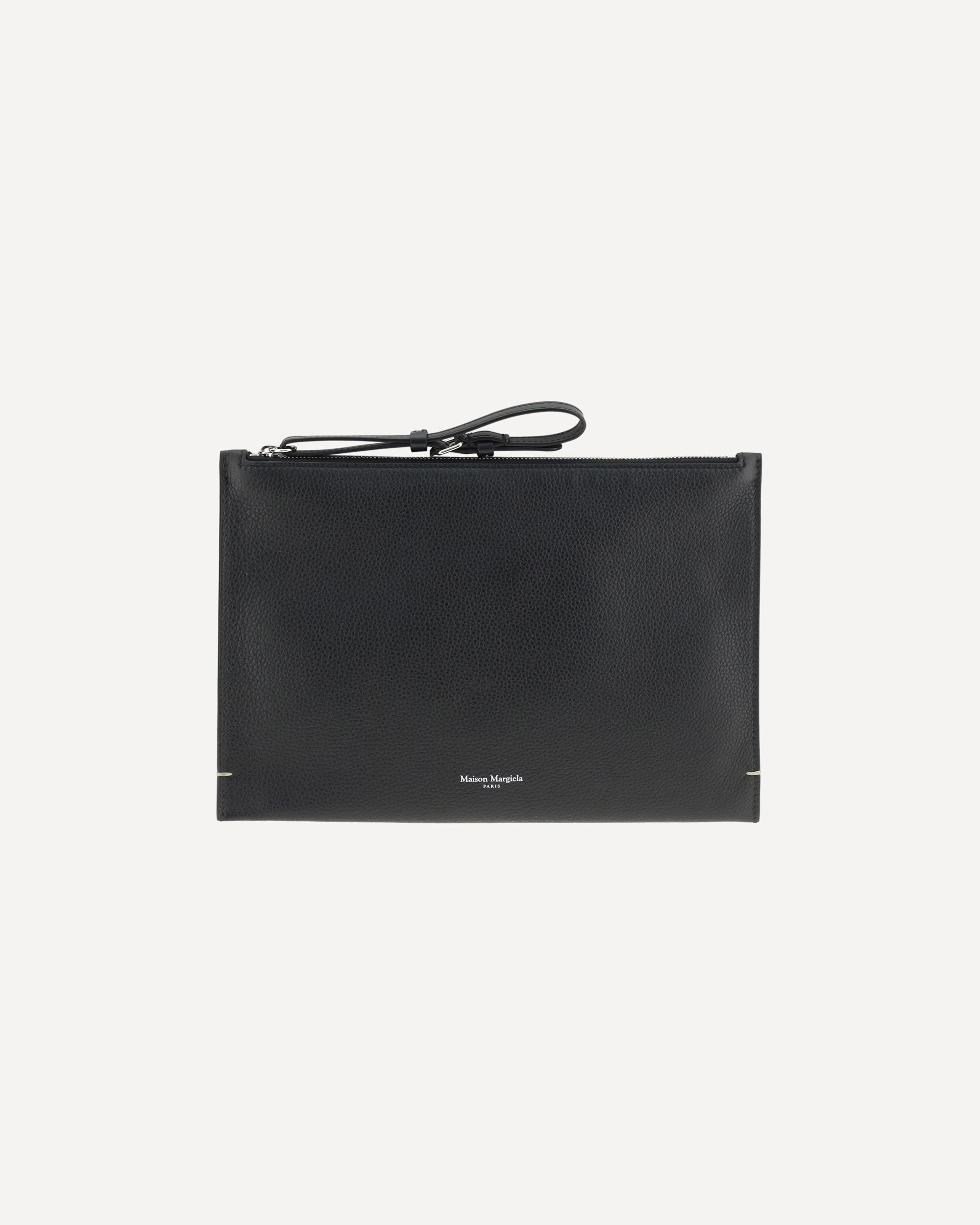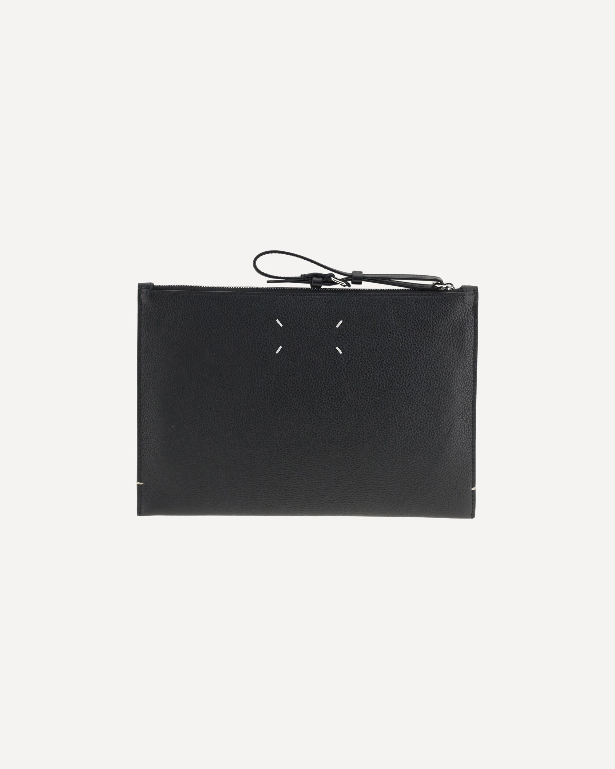 La Pouch in pelle di Maison Margiela è un accessorio essenziale dal carattere deciso. Dotata di una pratica chiusura lampo, si distingue per il logo con scritta color argento sul fronte, che aggiunge un tocco luminoso e contemporaneo. Sul retro, le iconiche impunture bianche a contrasto richiamano l’estetica inconfondibile della Maison. Completa il design una maniglia ad anello, che unisce funzionalità e stile minimale.