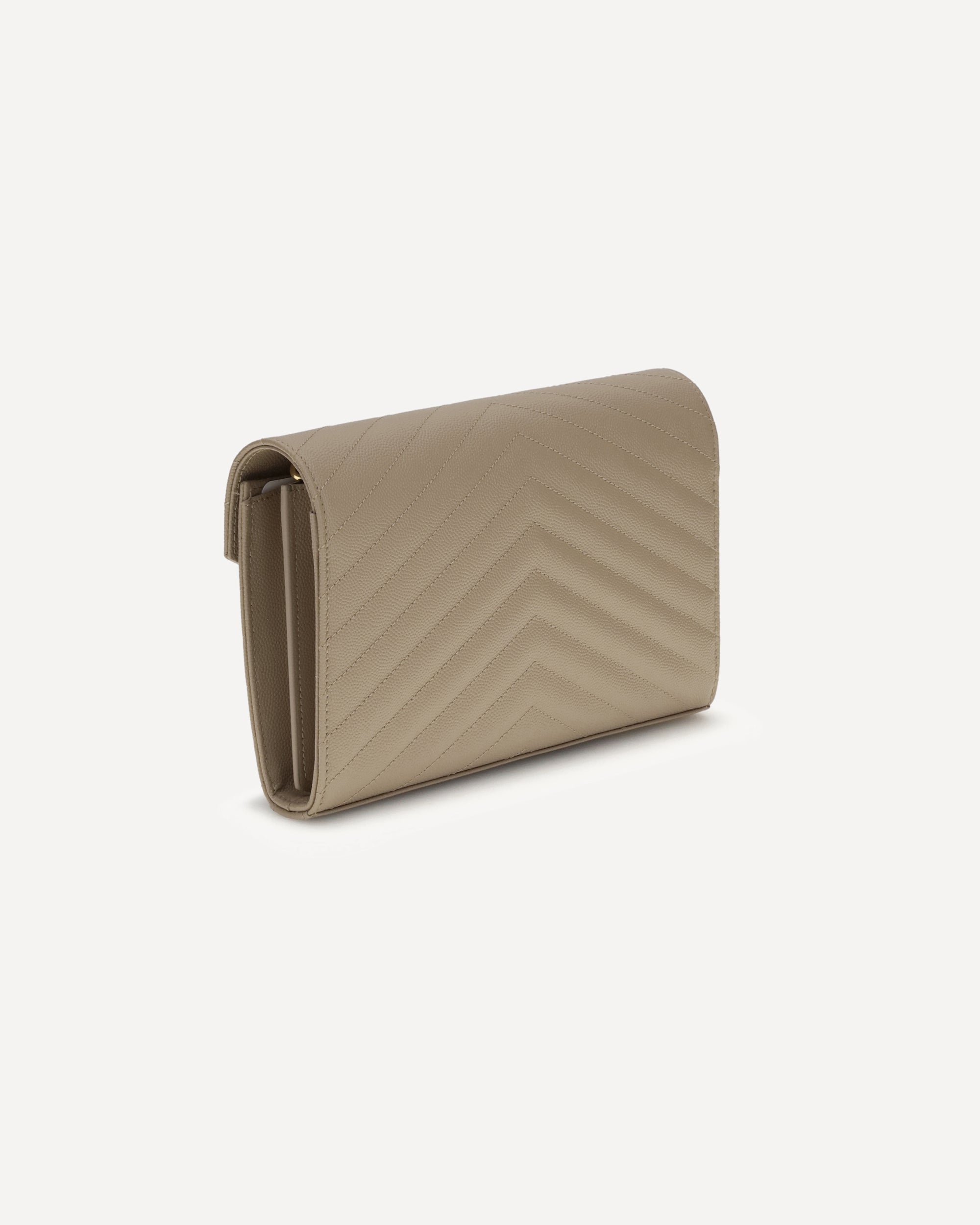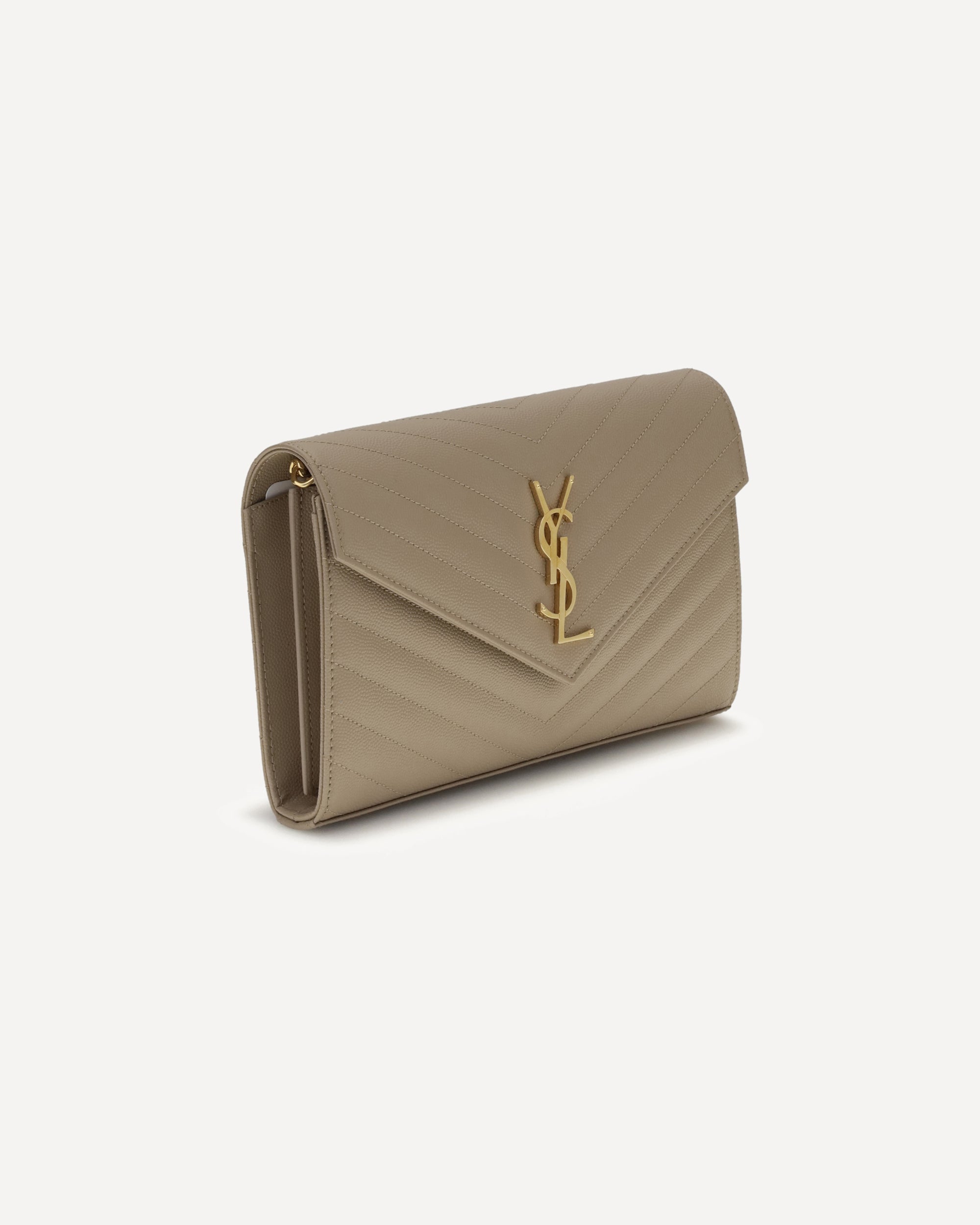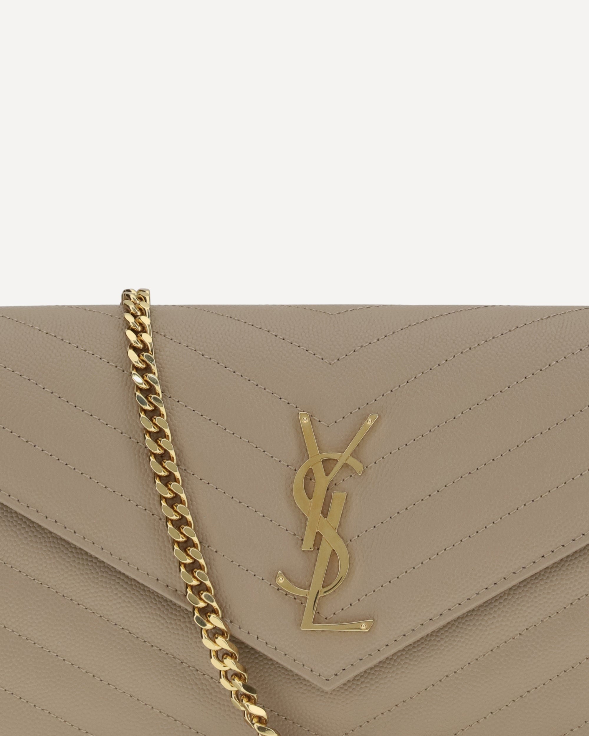 La Borsa a Tracolla Monogram in Pelle di Saint Laurent presenta una chiusura frontale con bottone automatico per praticità e sicurezza. Il design in pelle è arricchito dalla stampa matelassé, che aggiunge una texture elegante e sofisticata. All'interno, dispone di slot portacarte, una tasca centrale con zip e il logo del brand visibile. Sul fronte, è presente una placca con l'iconico logo dorato. La tracolla a catena dorata con manico in pelle conferisce un tocco di lusso, rendendo questa borsa ideale per ogni occasione elegante.