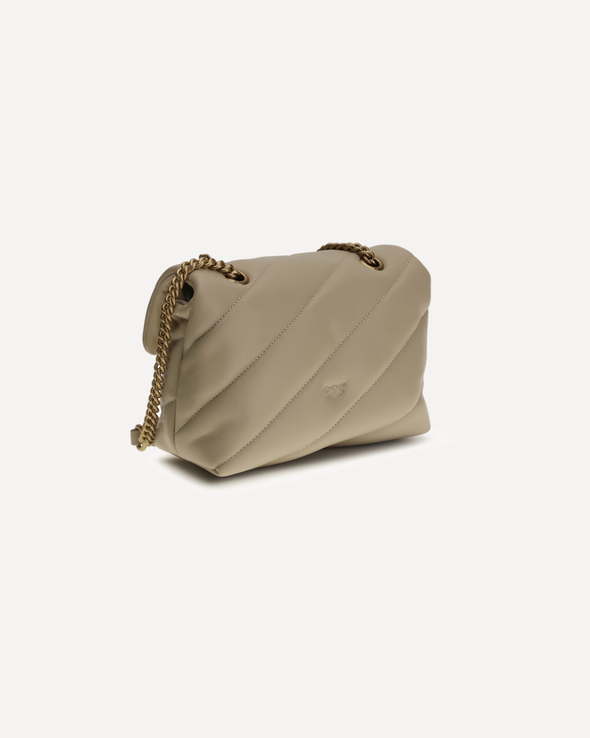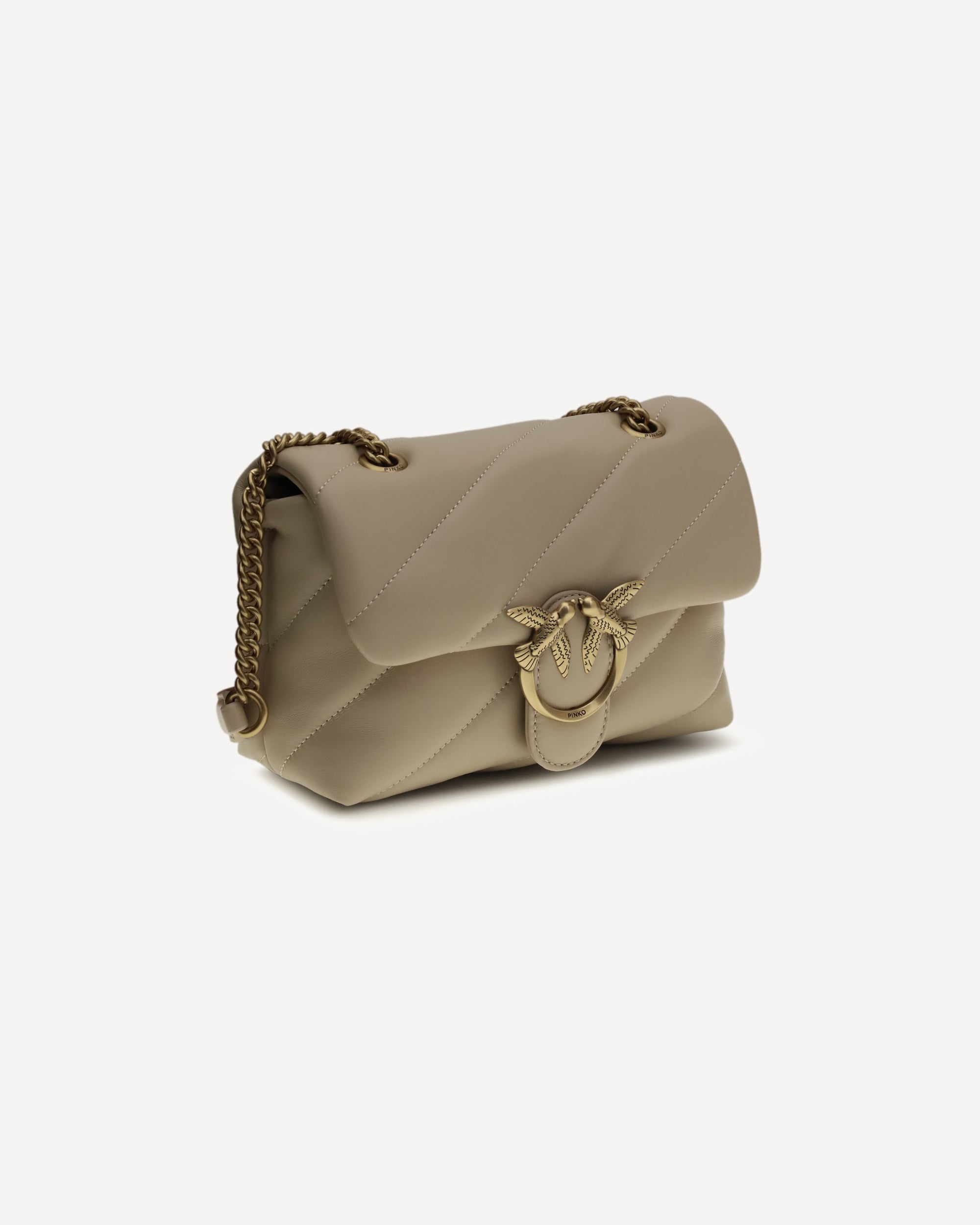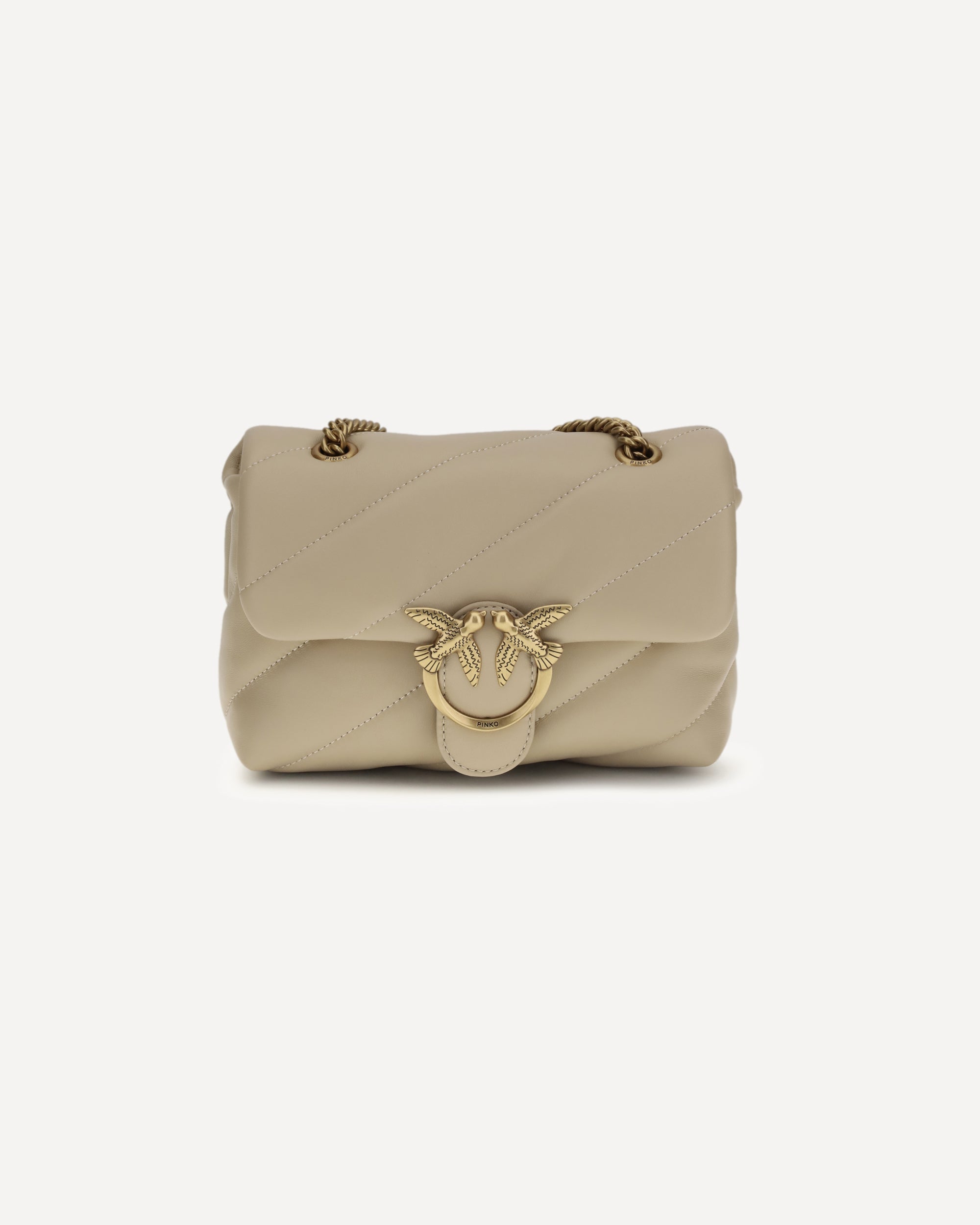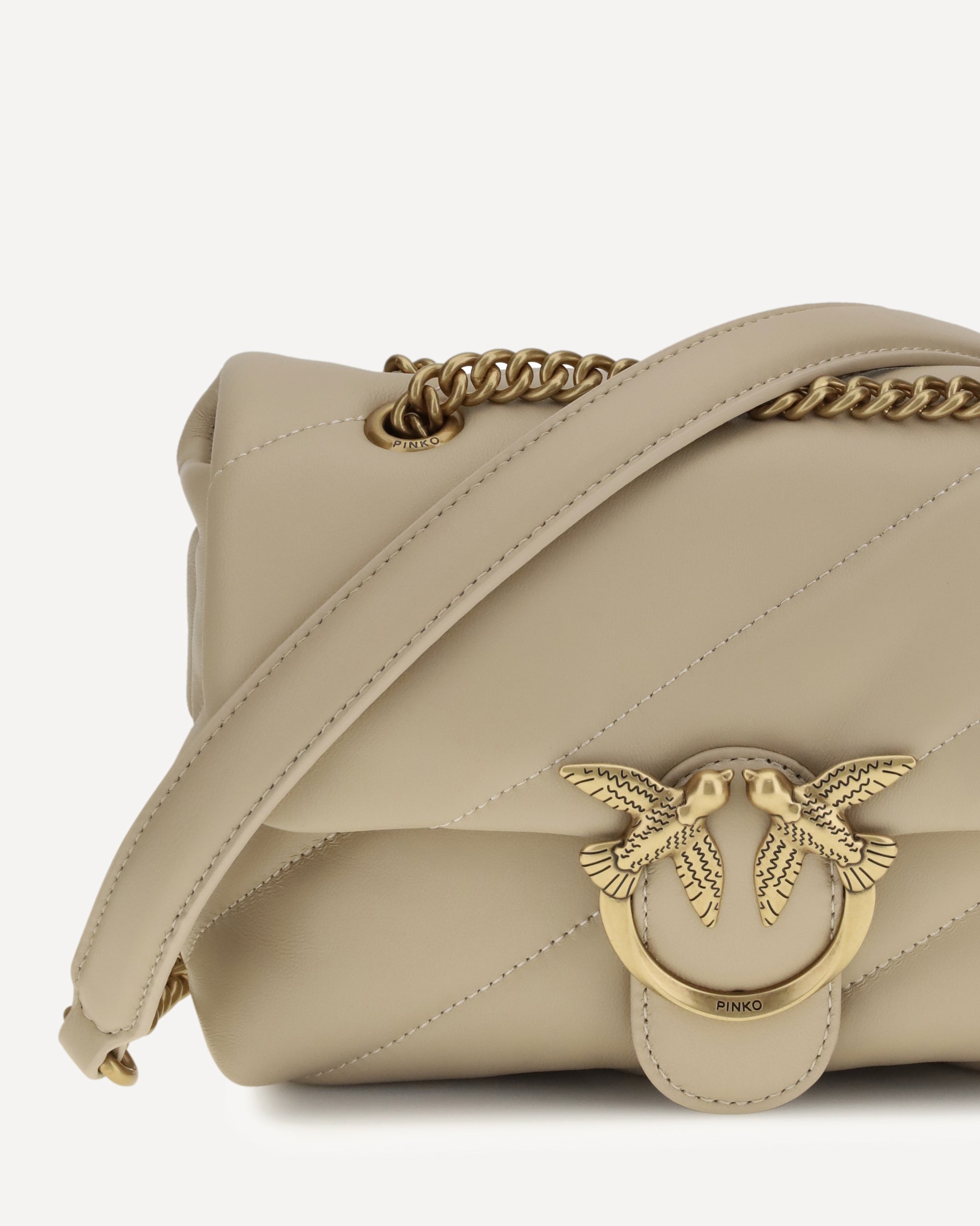 Borsa a Tracolla Love Mini Puff in pelle di Pinko, un accessorio elegante e alla moda. La chiusura frontale con bottone magnetico garantisce praticità e sicurezza, mentre l'iconico logo Love Birds, placcato in oro e applicato in rilievo sul fronte, aggiunge un tocco di lusso. Il design trapuntato e imbottito conferisce alla borsa una texture ricca e sofisticata. All'interno, è presente unico scomparto interno per un'ottima organizzazione. La tracolla a catena scorrevole offre versatilità, permettendo di indossarla a spalla o crossbody. Sul retro, l'iconico monogramma del brand, ricamato tono su tono, aggiunge un dettaglio discreto e raffinato.