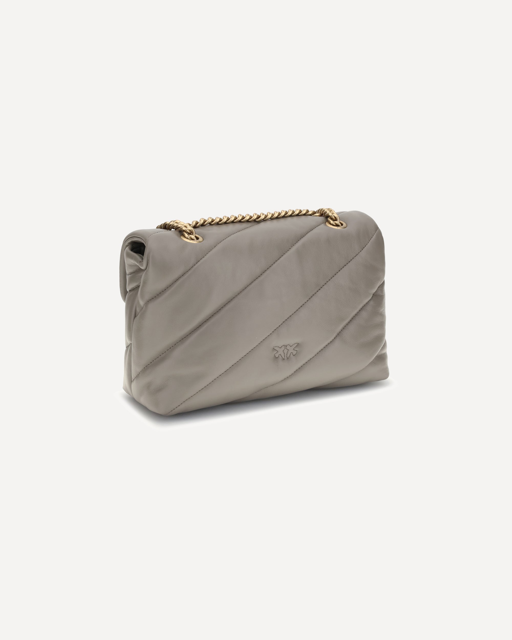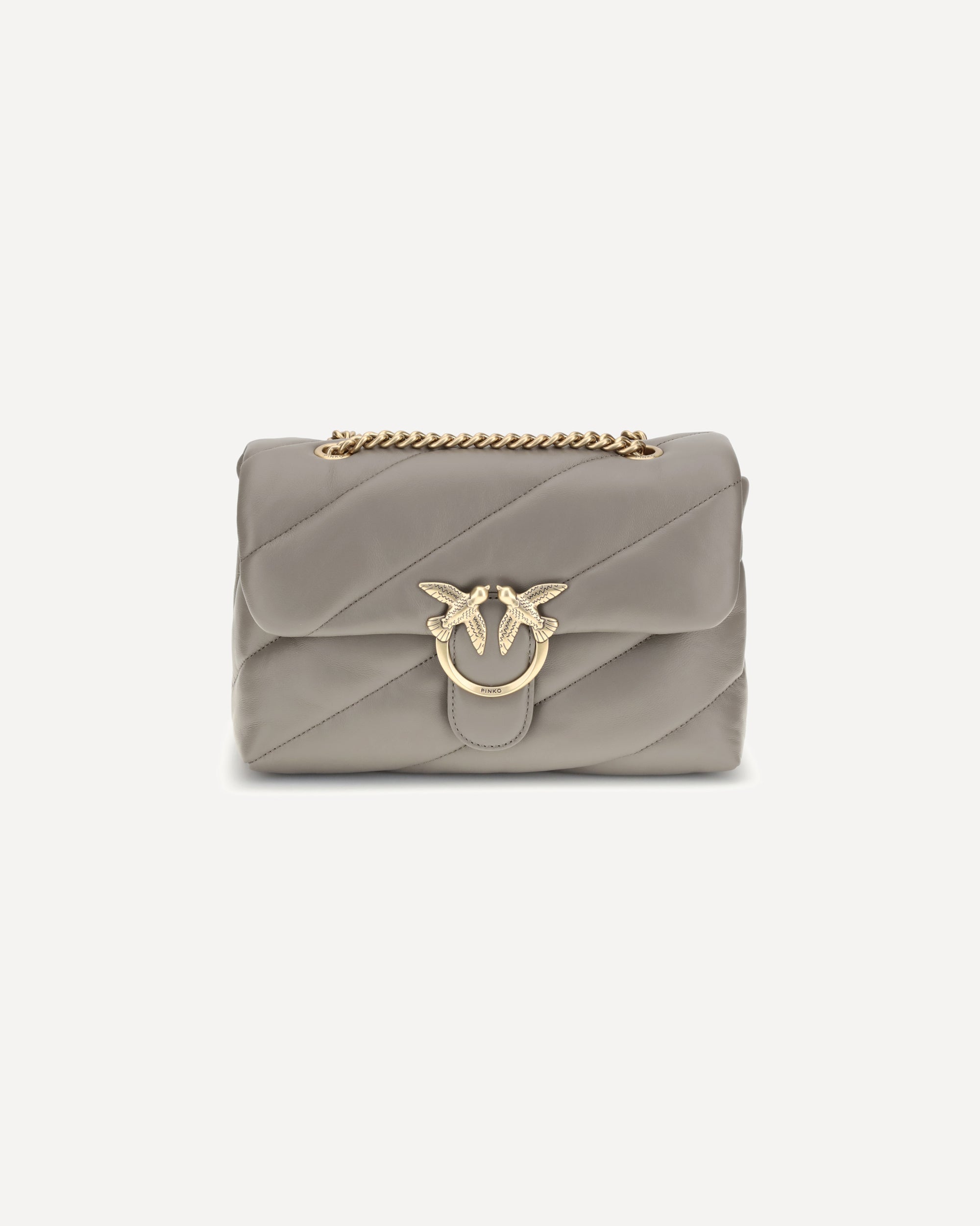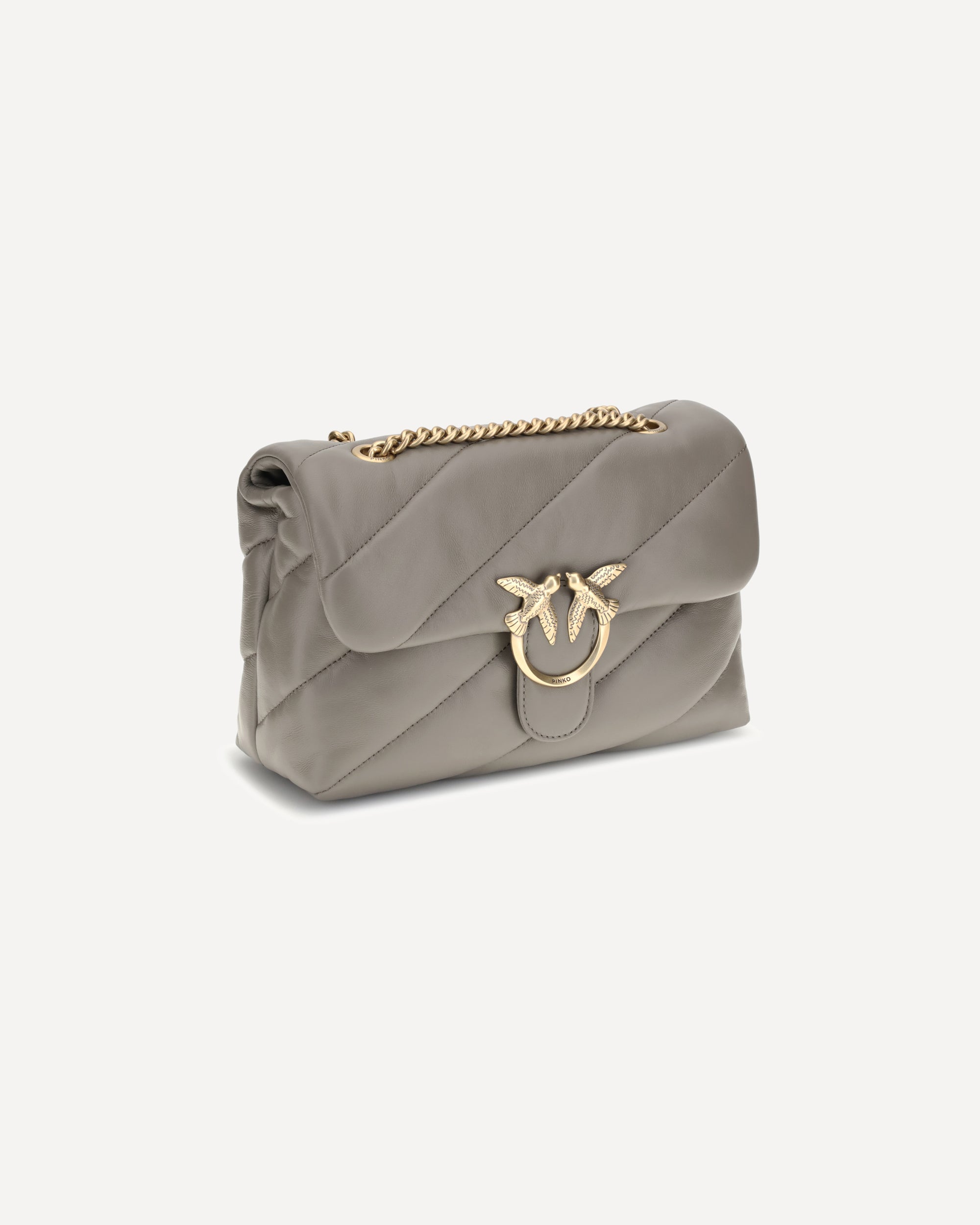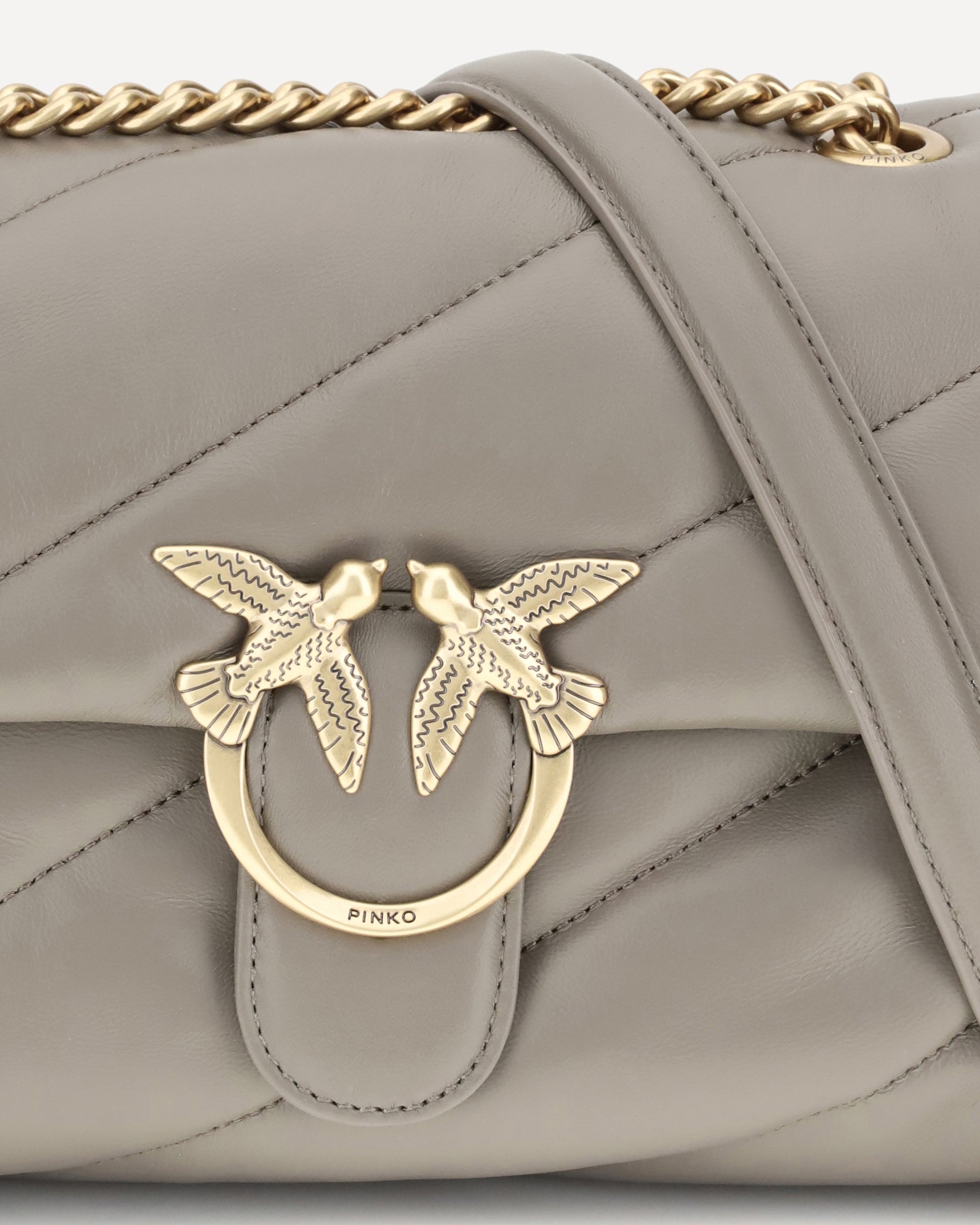Borsa a Tracolla Love Classic in Pelle di Pinko, chiusura frontale con bottone magnetico, iconico logo Love Birds placcato oro e applicato in rilievo sul fronte, design trapuntato e imbottito, doppio scomparto interno, tracolla a catena scorrevole, iconico monogramma brand ricamato tono su tono sul retro.
