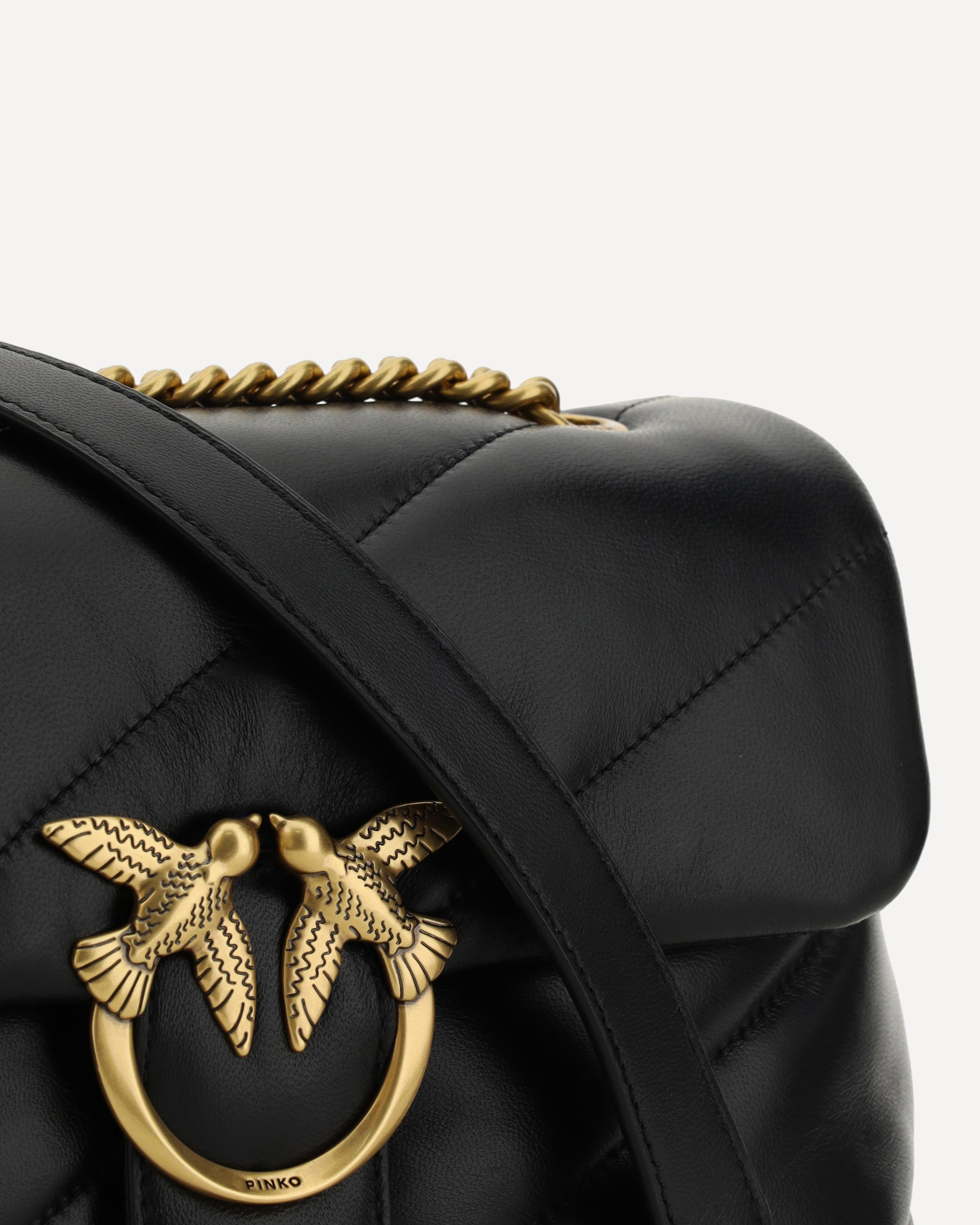 Borsa a Tracolla Love Classic in Pelle di Pinko, chiusura frontale con bottone magnetico, iconico logo Love Birds placcato oro e applicato in rilievo sul fronte, design trapuntato e imbottito, doppio scomparto interno, tracolla a catena scorrevole, iconico monogramma brand ricamato tono su tono sul retro.