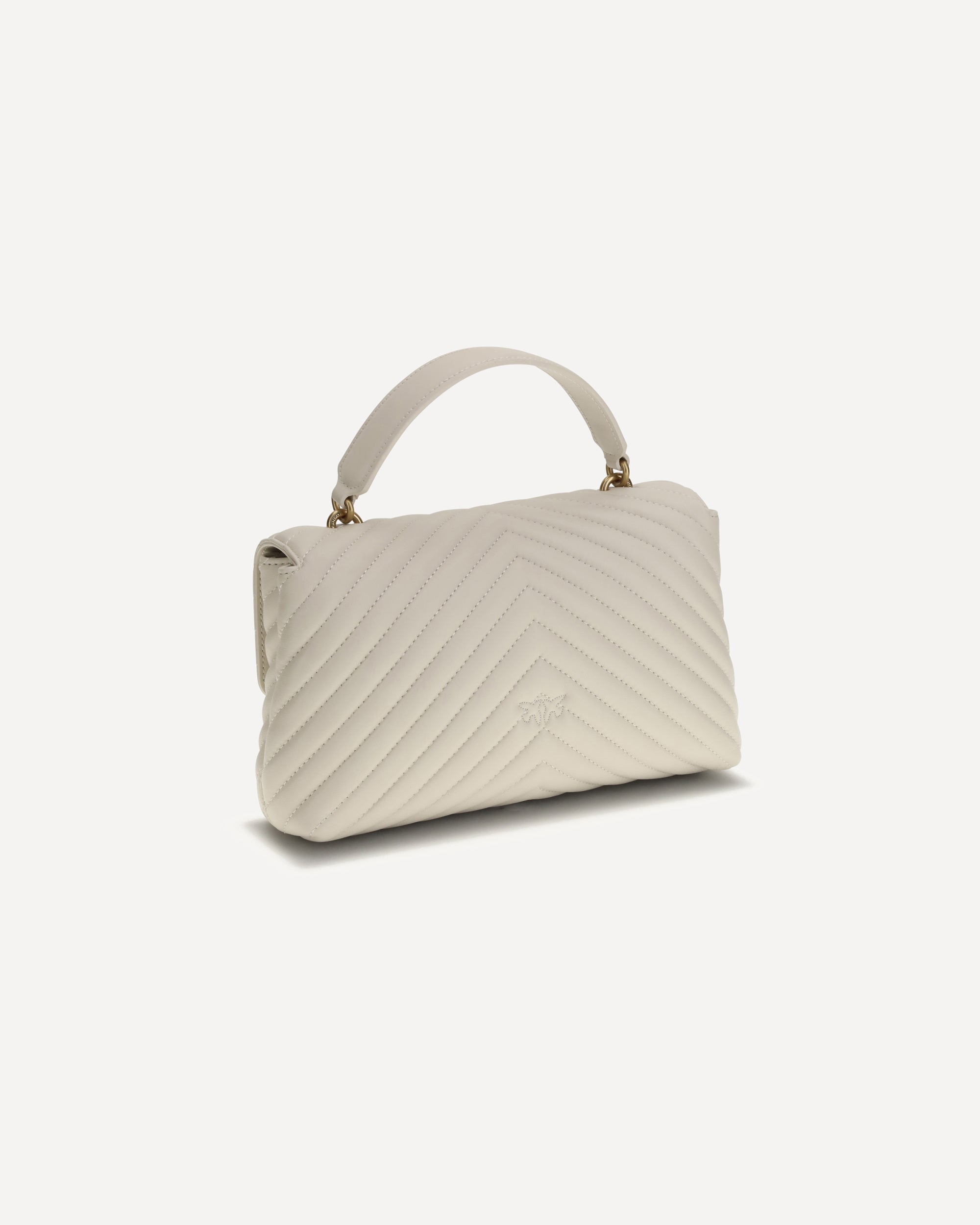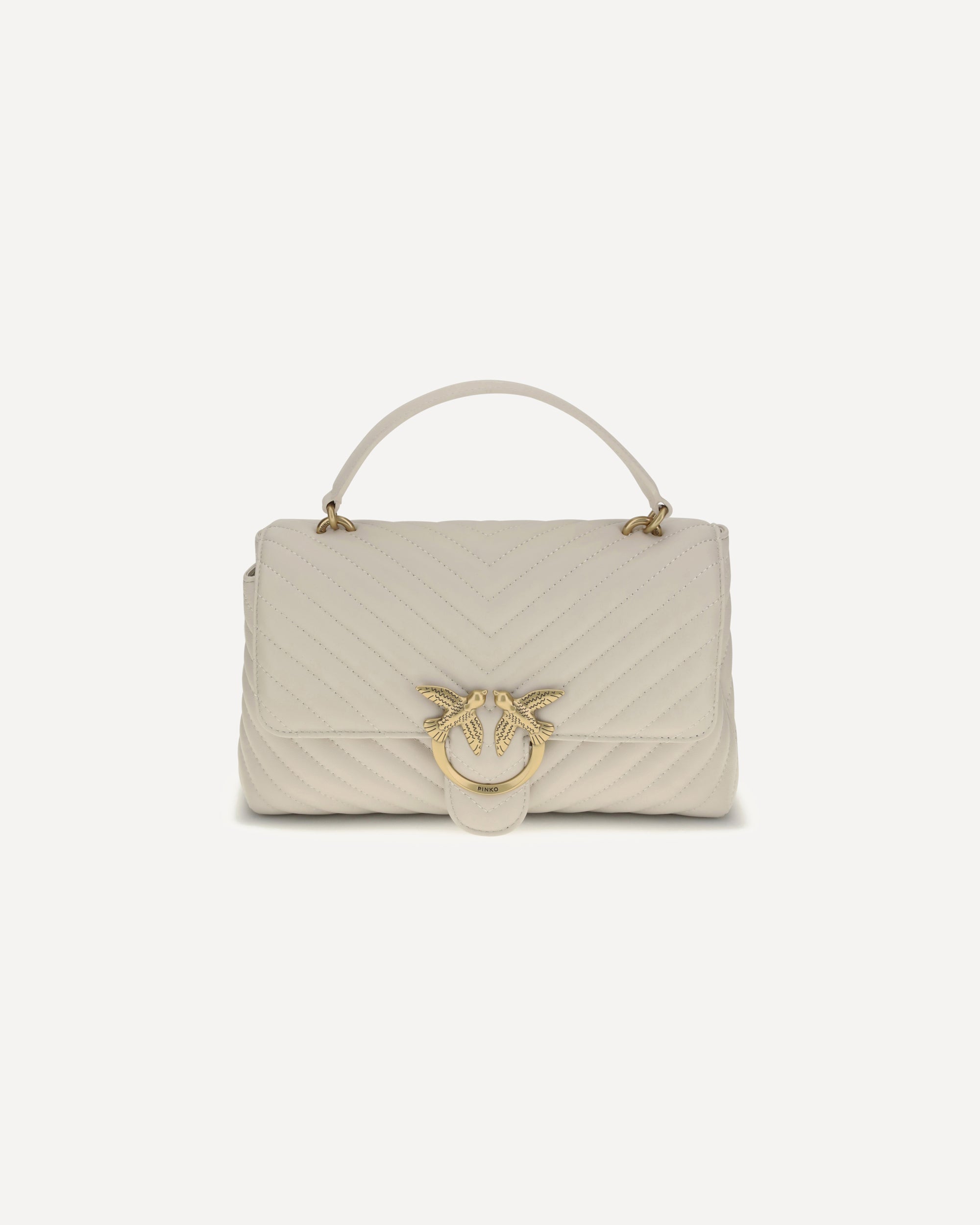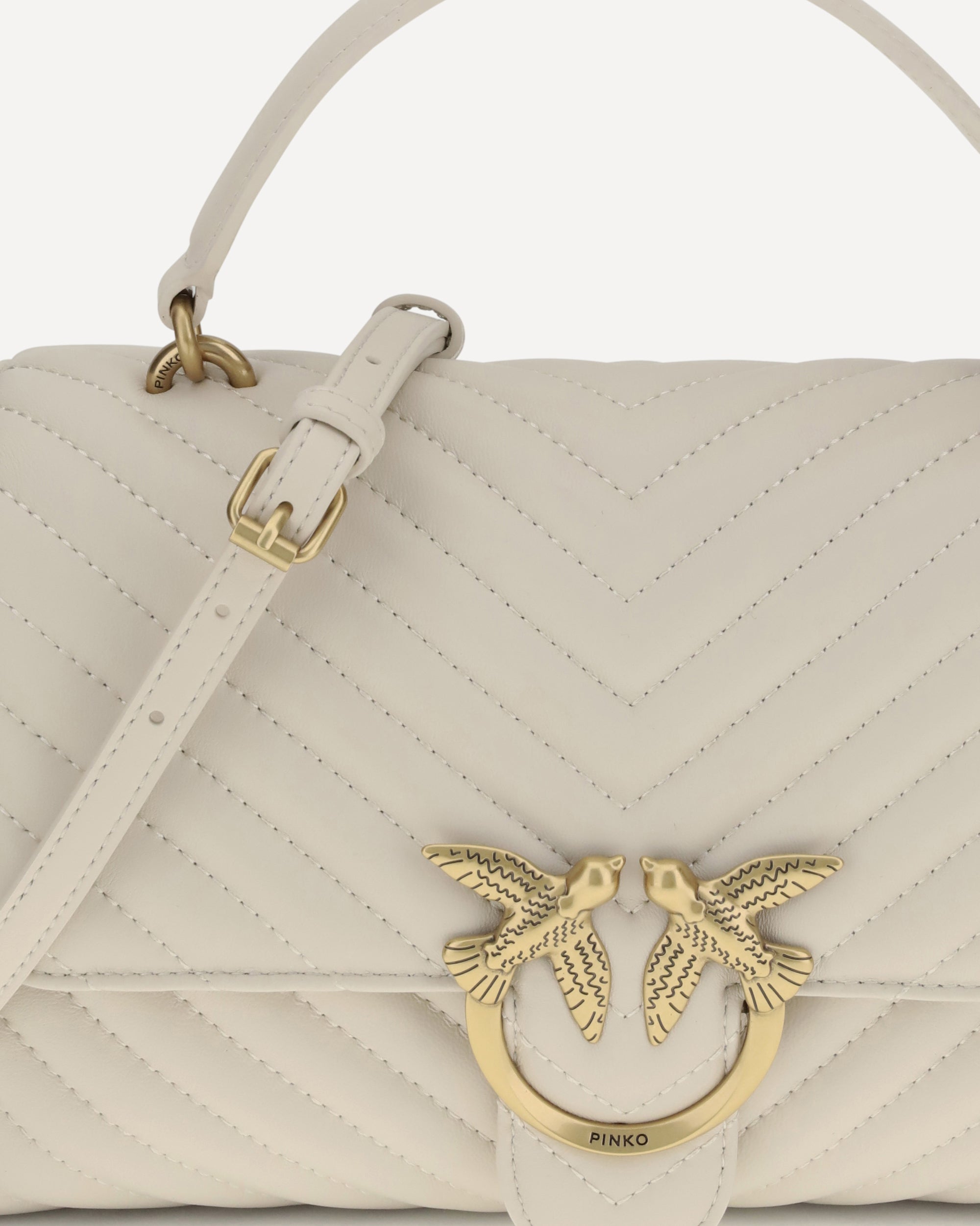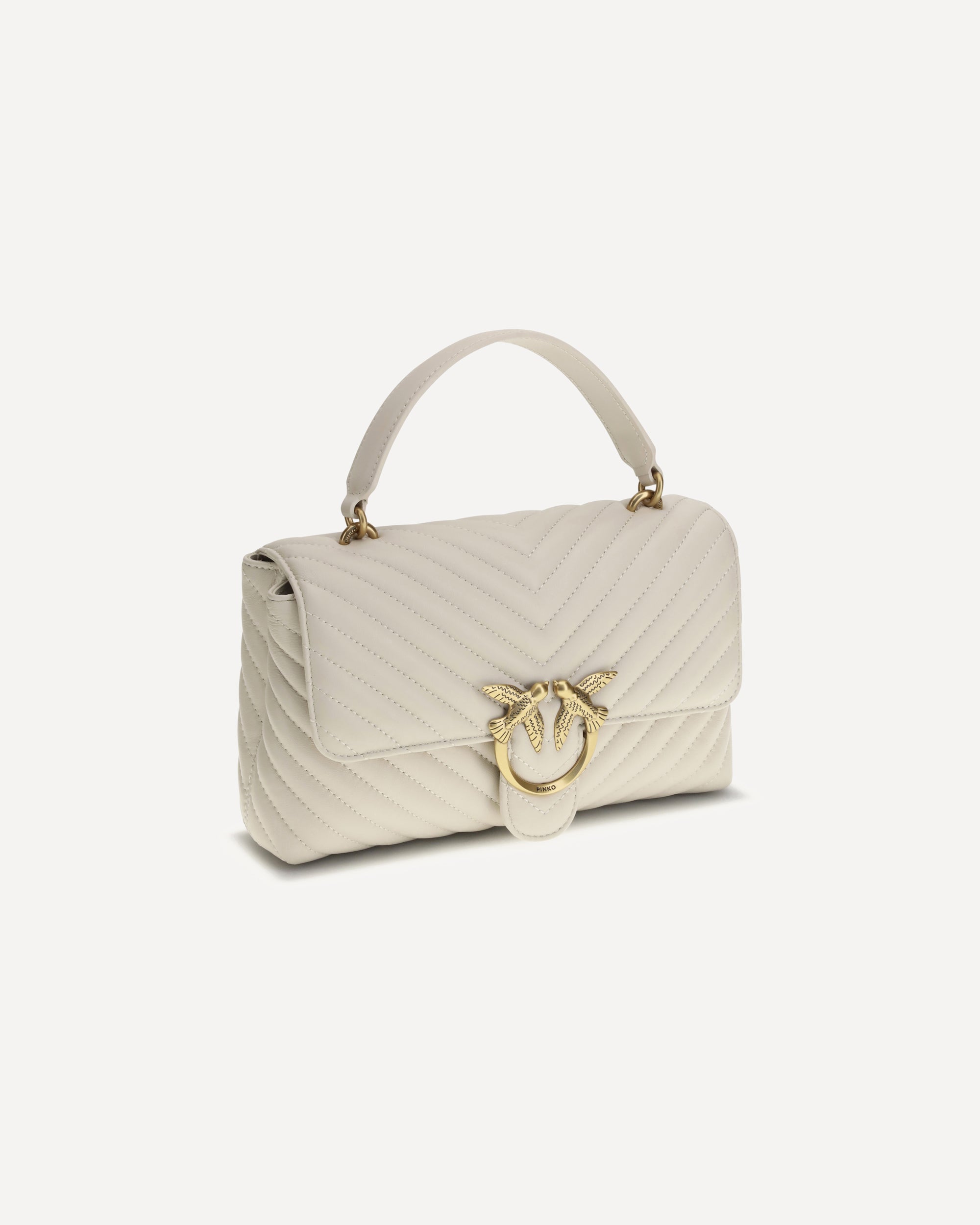 Borsa a Mano Love Lady in Pelle di Pinko, chiusura frontale con bottone magnetico, iconico logo Love Birds placcato oro e applicato in rilievo sul fronte, design trapuntato e imbottito, doppio scomparto interno, tracolla a catena scorrevole, manico rigido piatto nella parte superiore, tasca interna piatta con cerniera, iconico monogramma brand ricamato tono su tono sul retro.