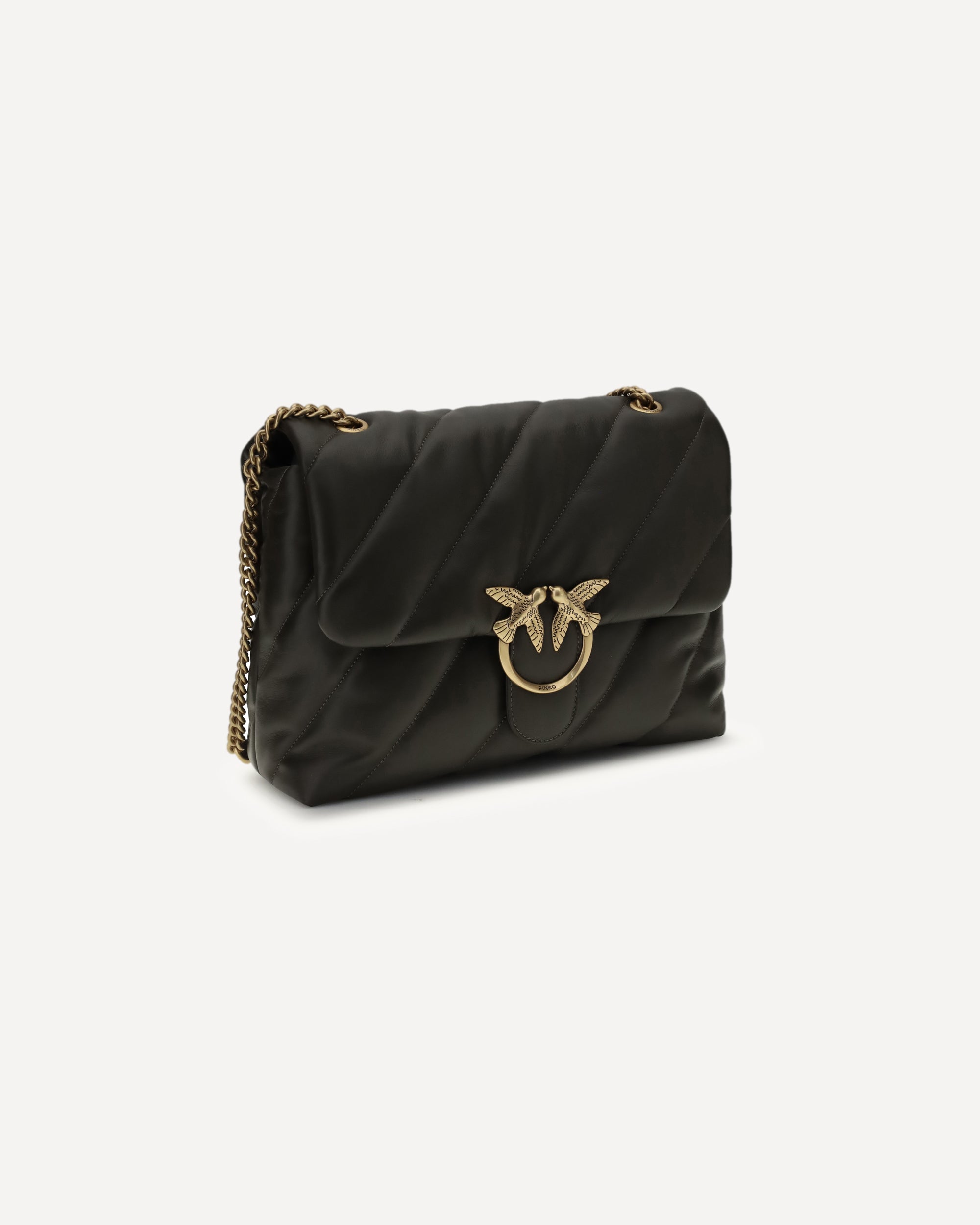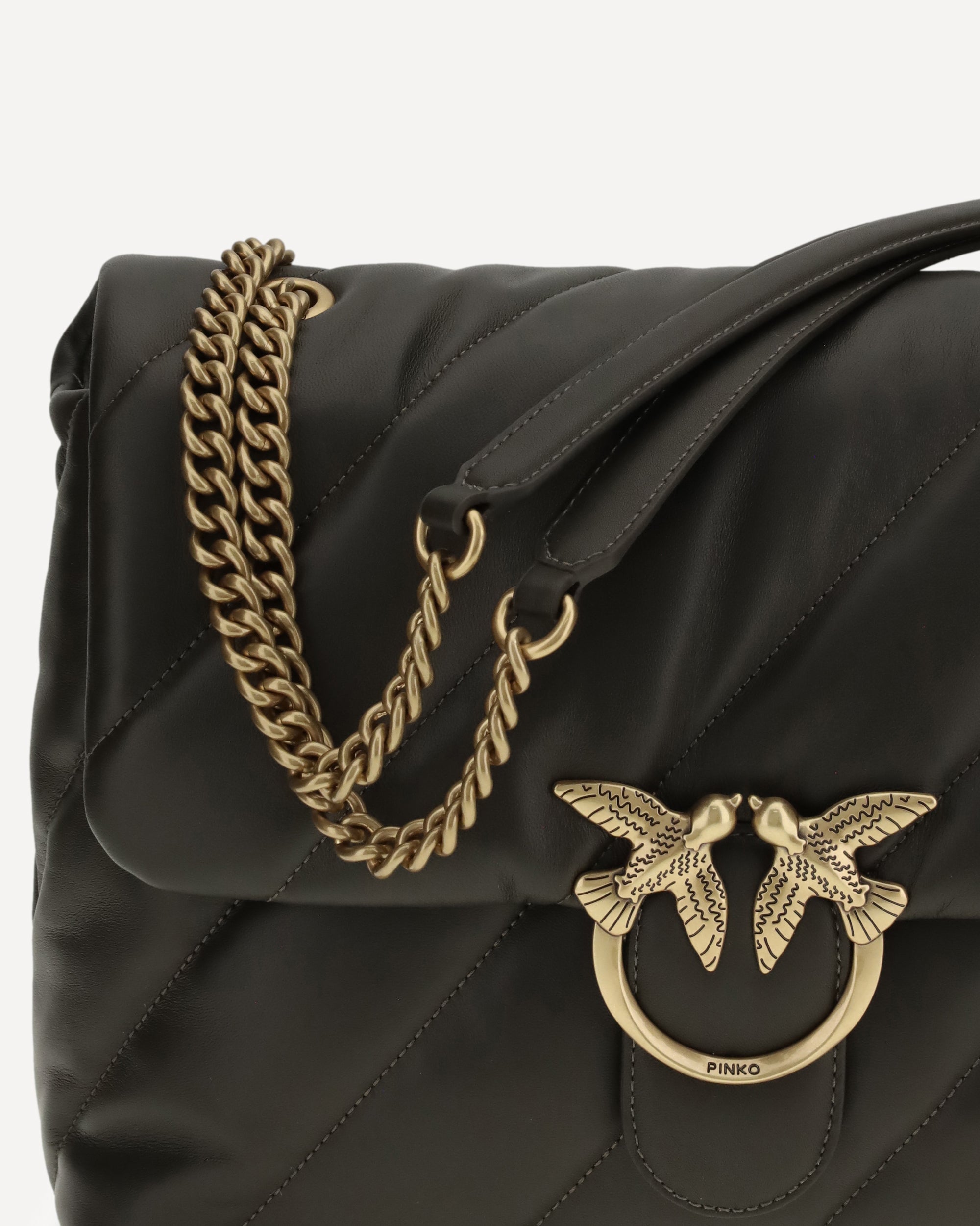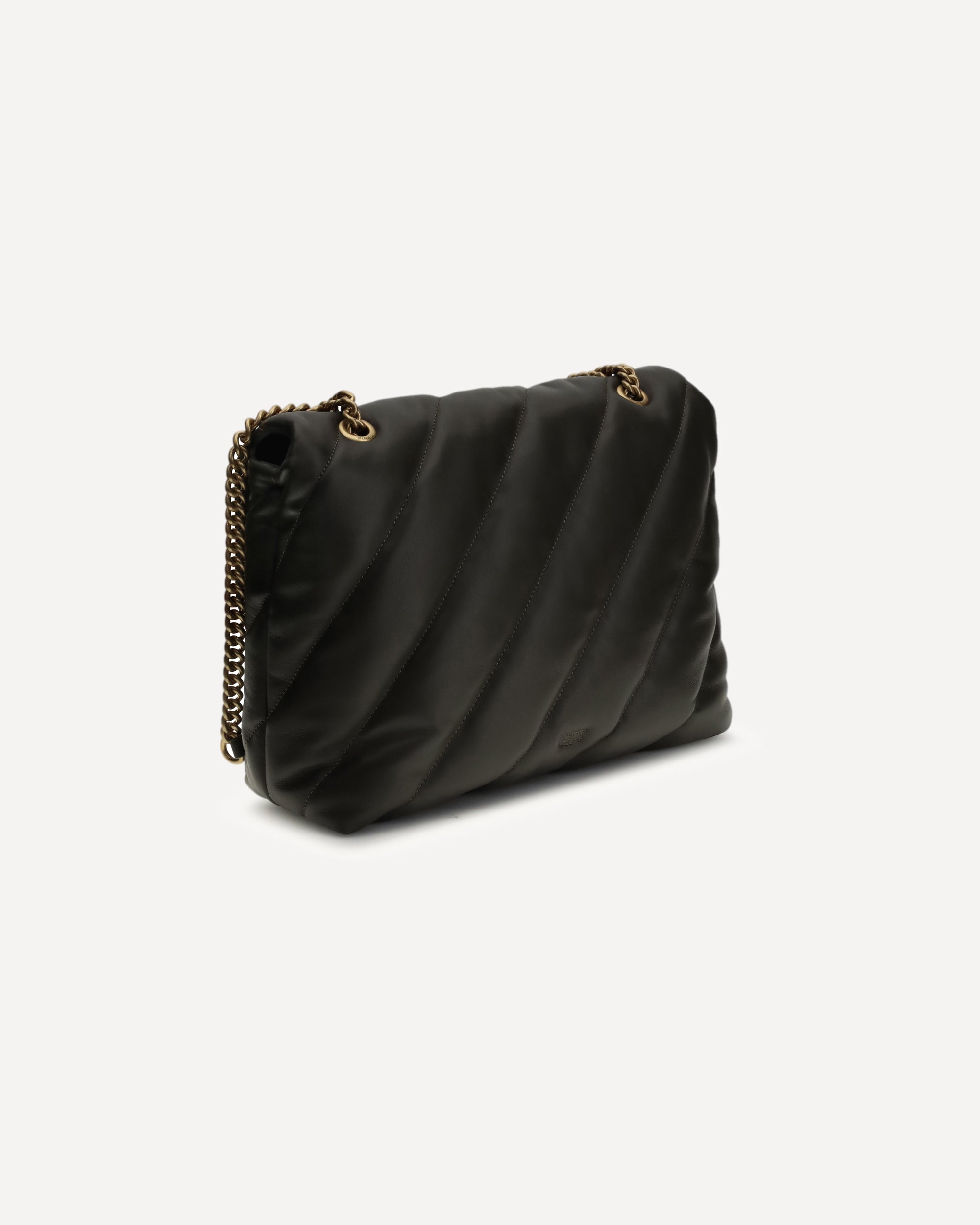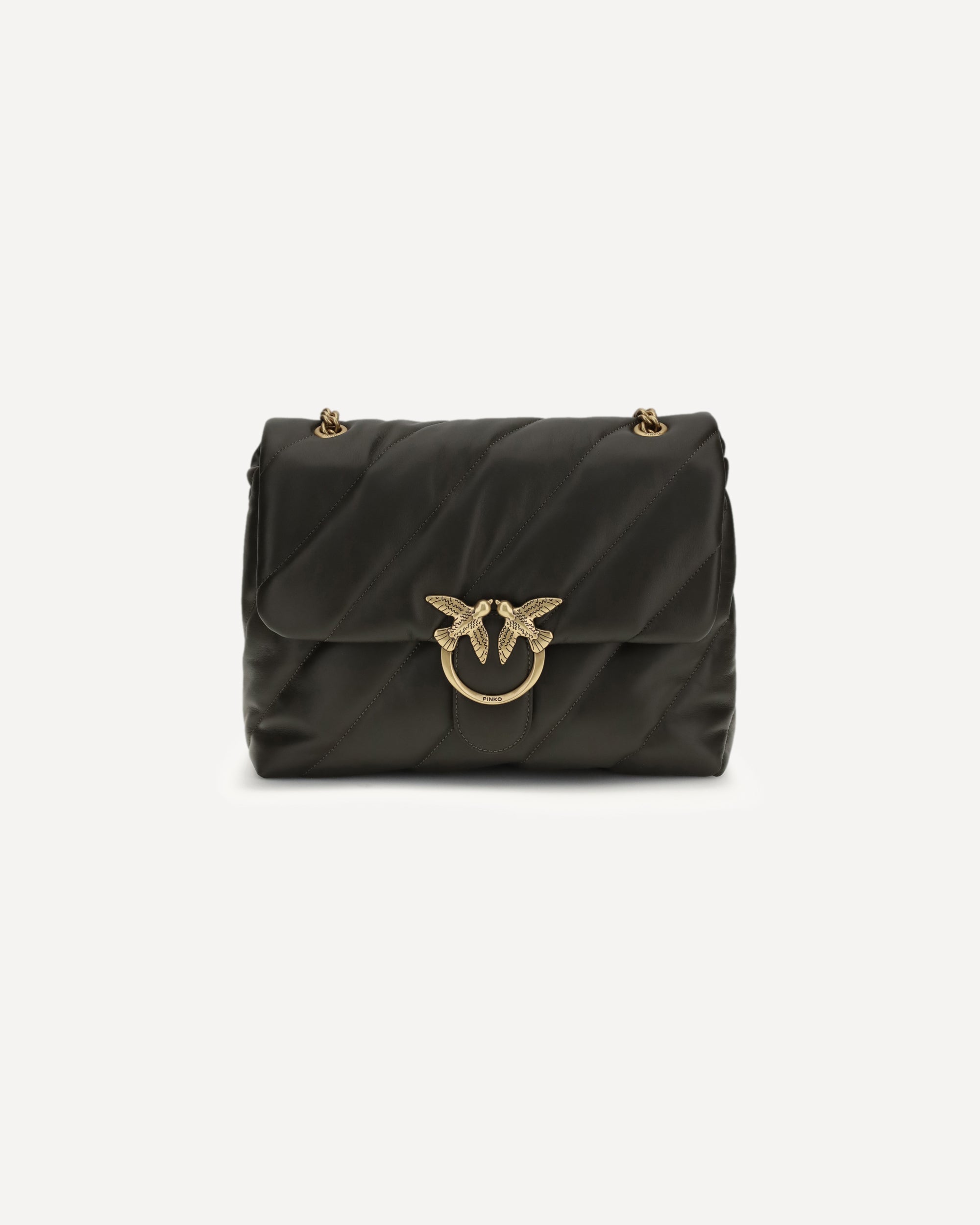 La Borsa a Tracolla Love Puff in pelle di Pinko unisce stile e funzionalità in un design trapuntato e imbottito. La chiusura frontale con bottone magnetico è decorata dall’iconico logo Love Birds placcato oro in rilievo, mentre sul retro spicca il monogramma ricamato tono su tono. L’interno è organizzato in tre scomparti, e la tracolla a catena scorrevole completa il modello, rendendolo elegante e pratico.