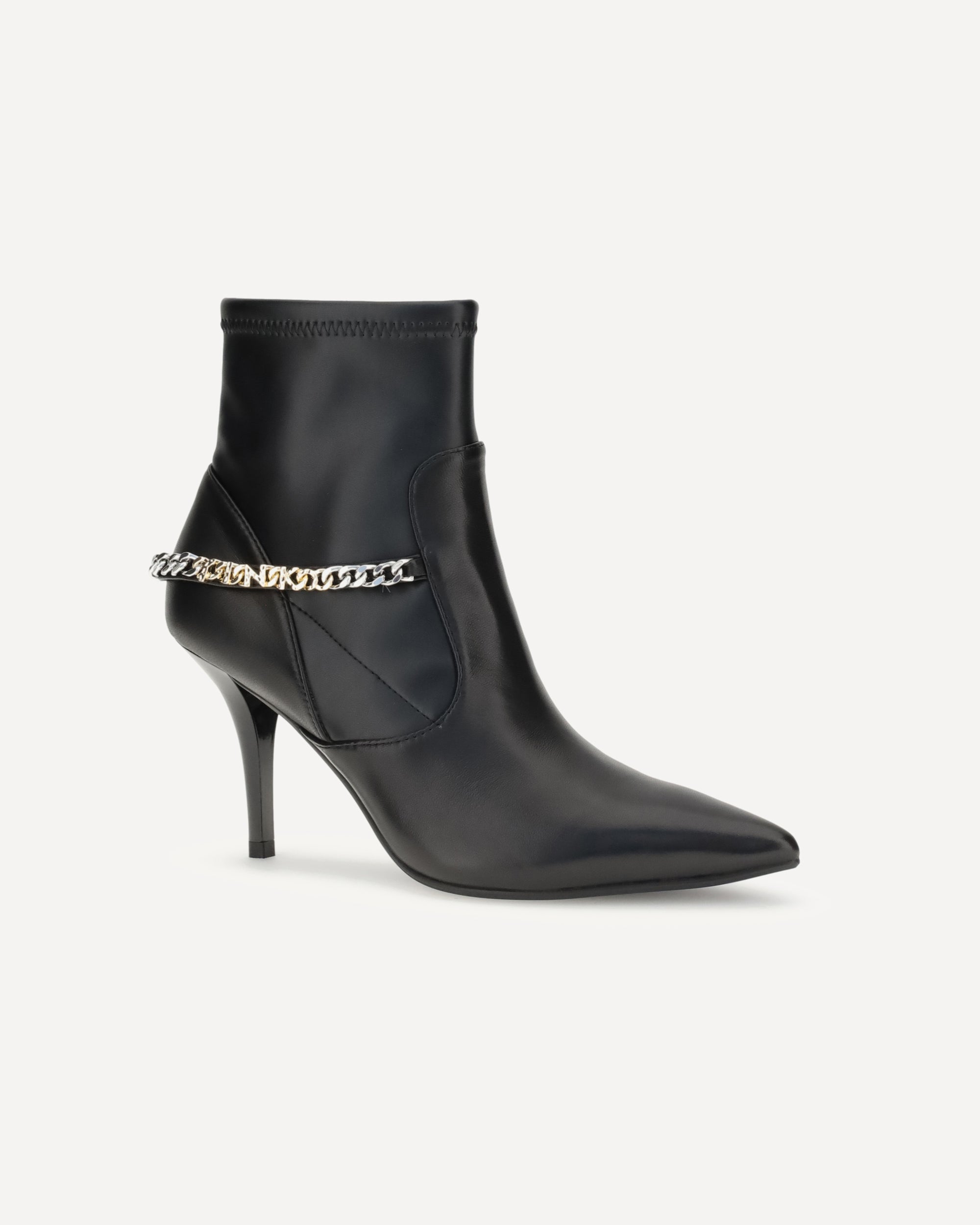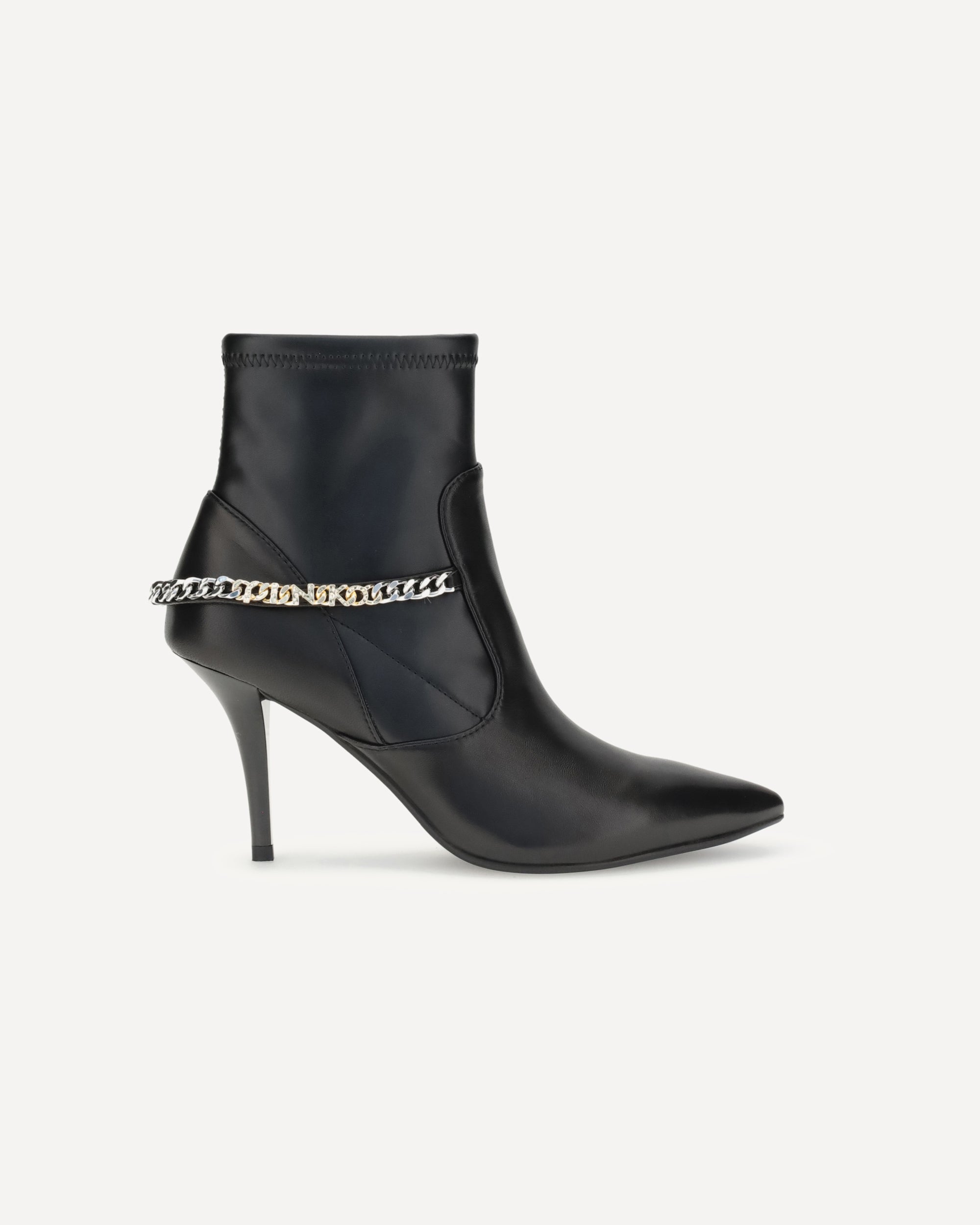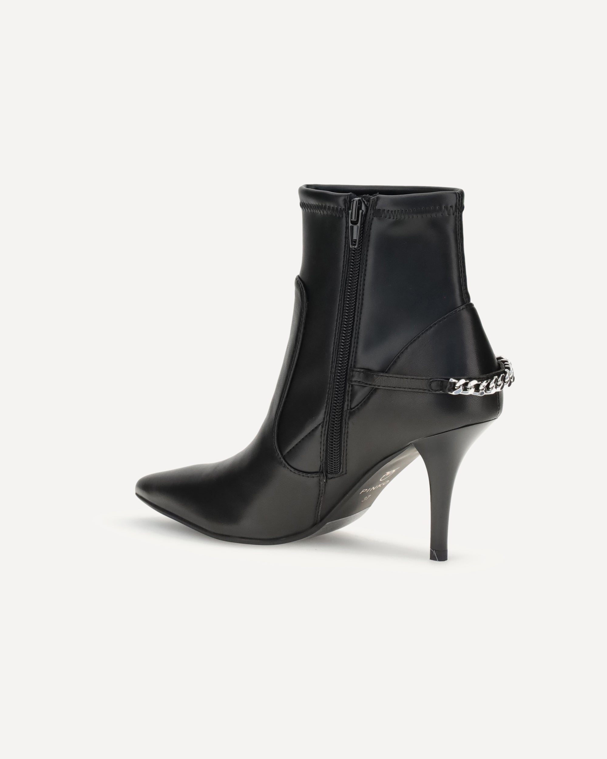 Gli Stivaletti di Pinko sono un perfetto connubio di eleganza e stile contemporaneo. Caratterizzati da un design a calza, avvolgono la gamba con una vestibilità aderente che esalta la silhouette. La punta a mandorla conferisce un tocco raffinato, mentre il tacco a stiletto aggiunge slancio e femminilità alla figura. Sul lato, spicca un dettaglio catena decorato con il logo del brand in strass, che dona luminosità e un accento glamour al modello. Completano il design le zip laterali, che rendono la calzata pratica senza rinunciare all’estetica.