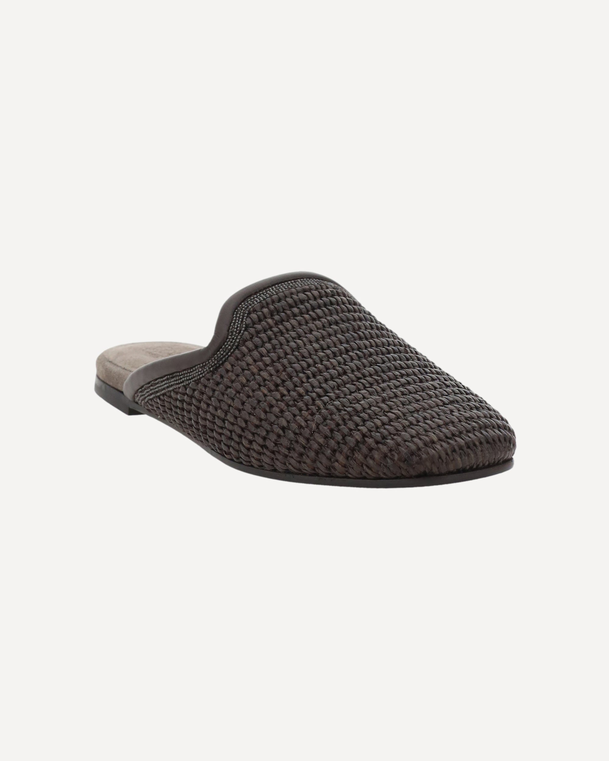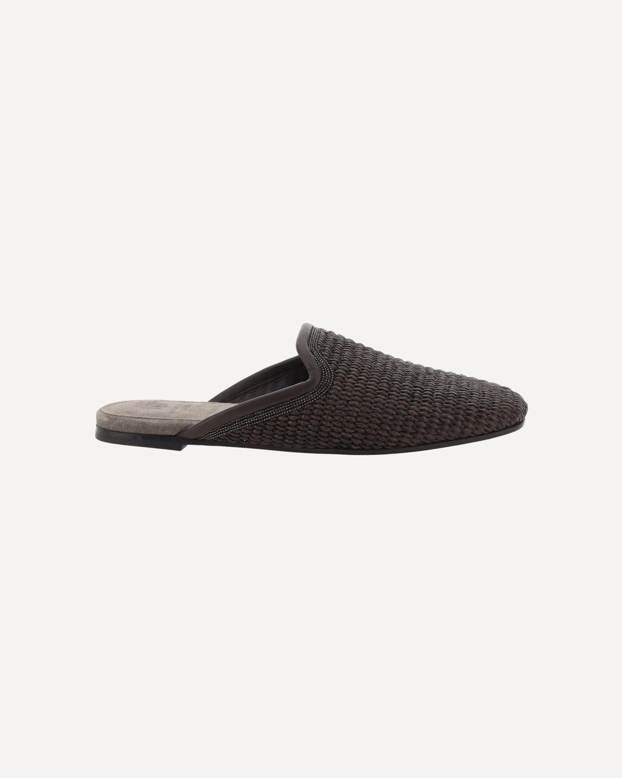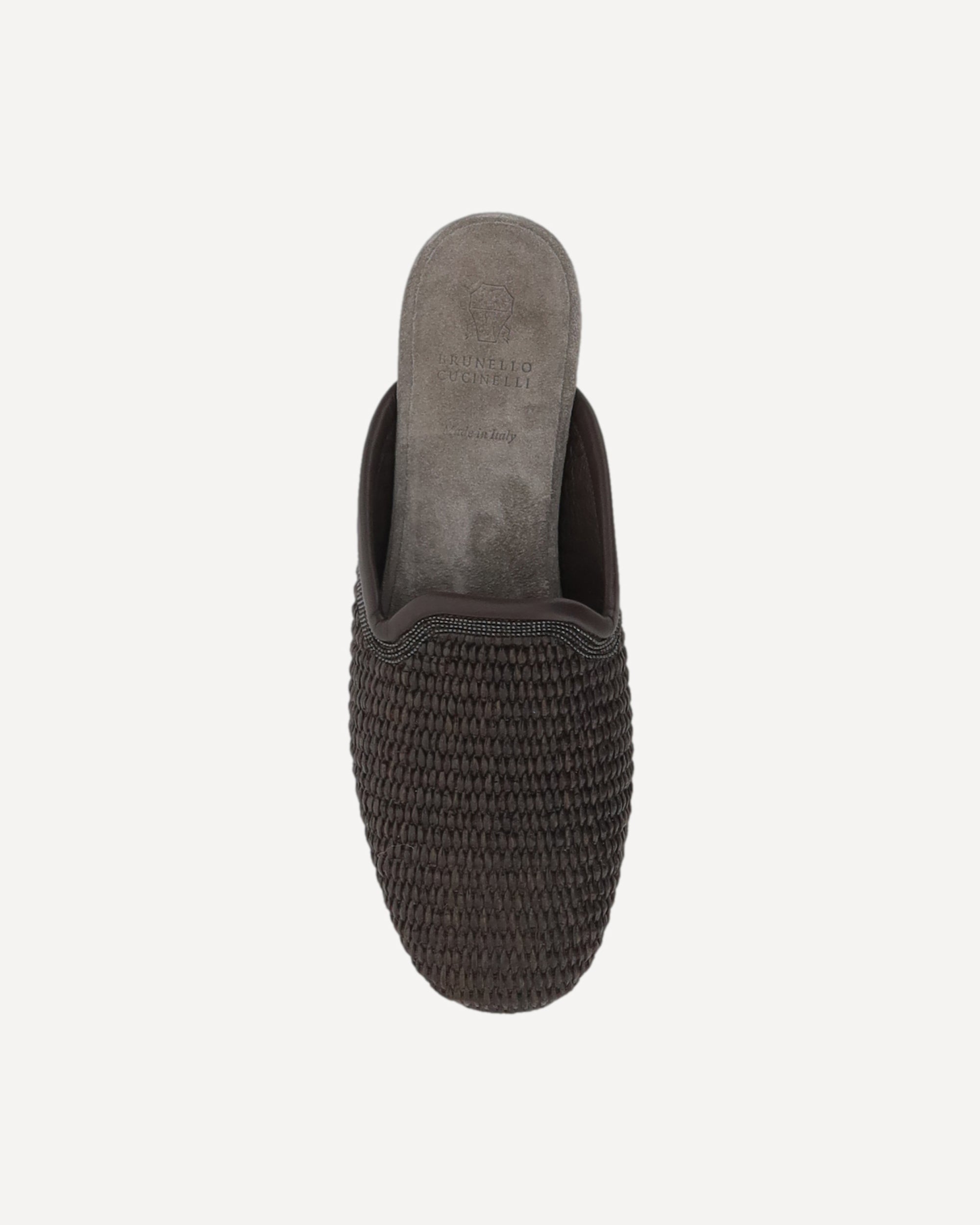 Mules di Brunello Cucinelli, trama a maglia, dettagli in pelle, iconici monili brillanti applicati sul fronte, soletta in pelle scamosciata con iconic monogramma brand stampato a pressione, suola piatta