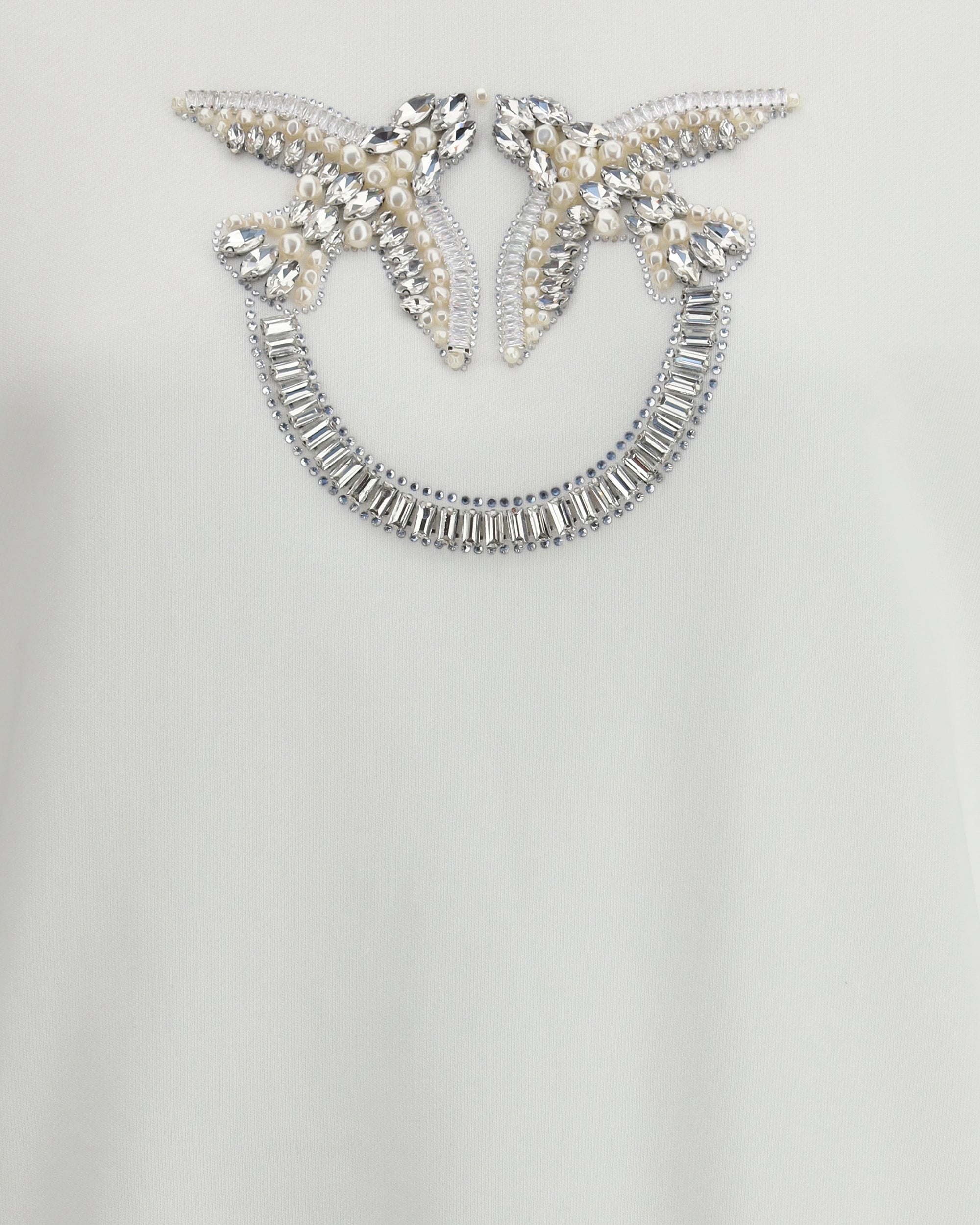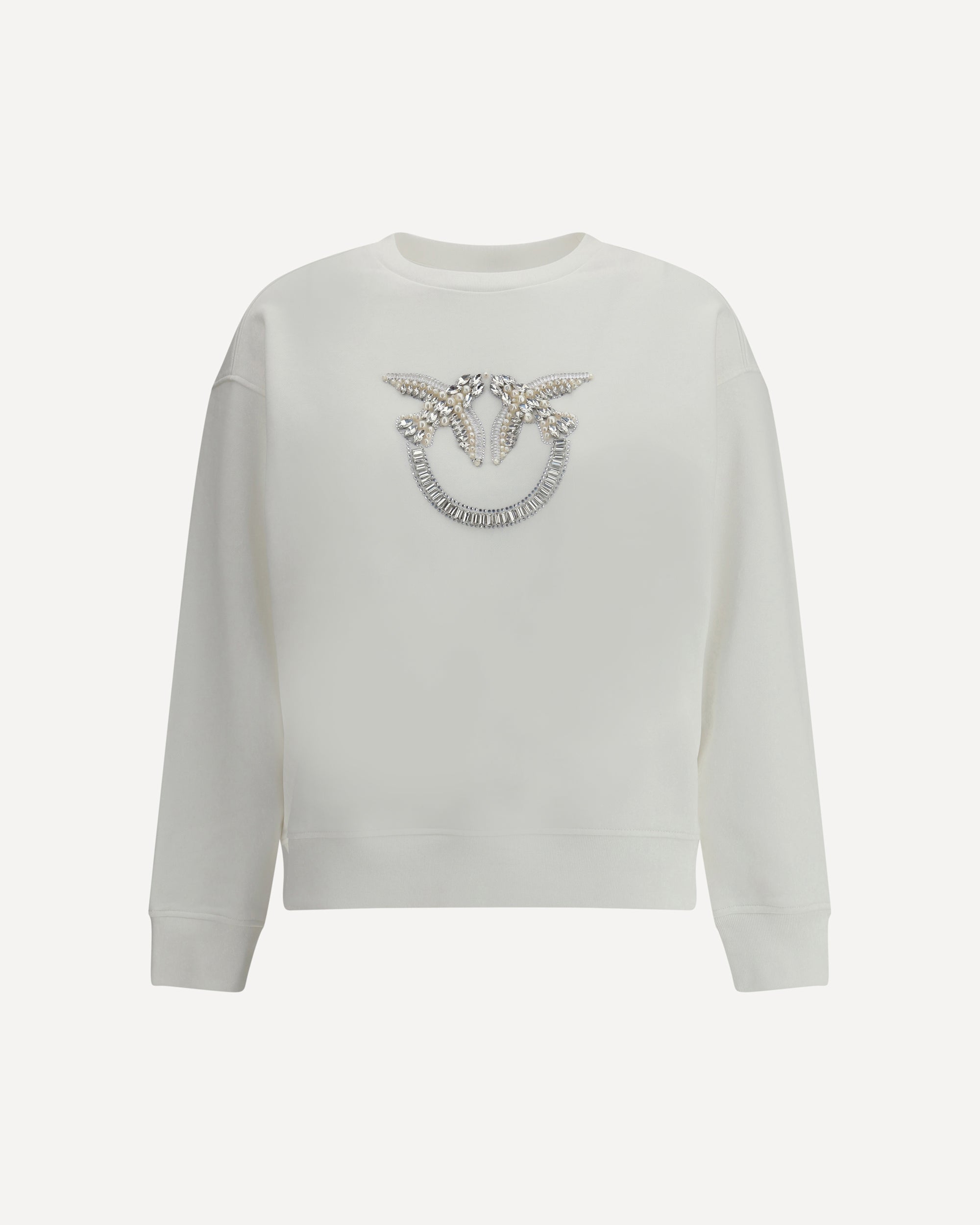 La Felpa con logo ricamato di Pinko unisce comfort e stile con dettagli preziosi. Caratterizzata da girocollo, polsini e orlo a costine, il logo sul fronte è arricchito da perle e strass, che donano al capo un tocco di eleganza e brillantezza.