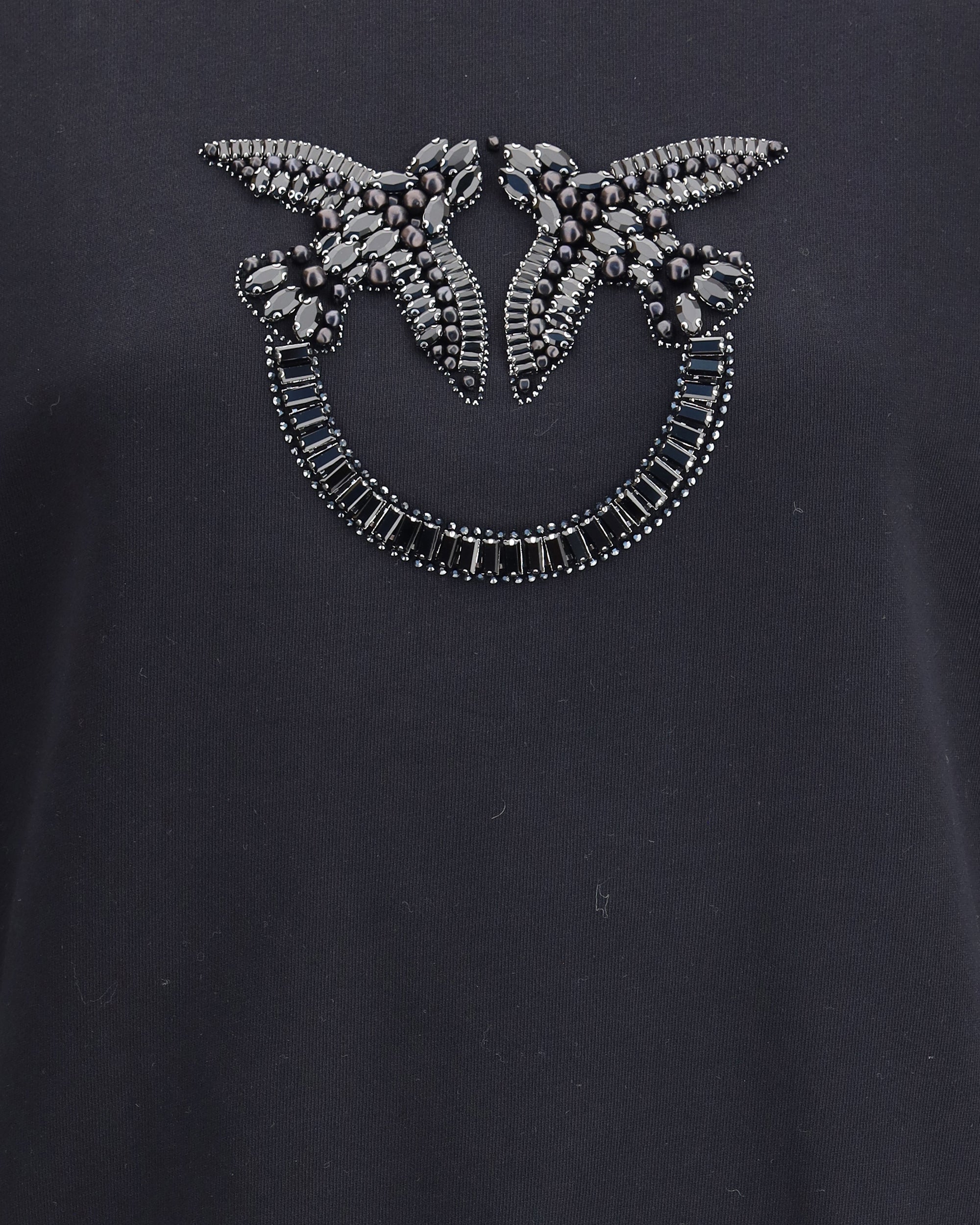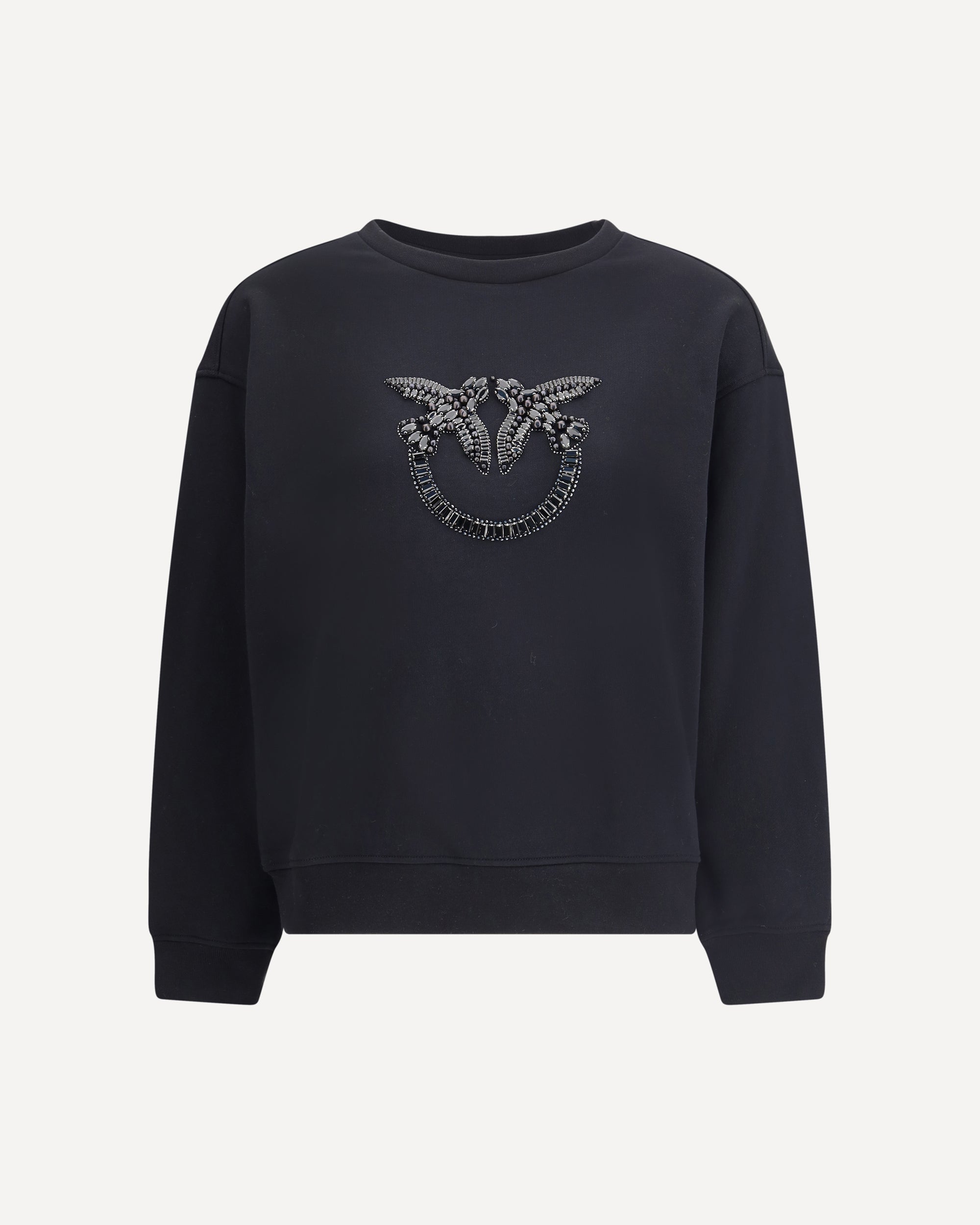 La Felpa con logo ricamato di Pinko unisce comfort e stile con dettagli preziosi. Caratterizzata da girocollo, polsini e orlo a costine, il logo sul fronte è arricchito da perle e strass, che donano al capo un tocco di eleganza e brillantezza.