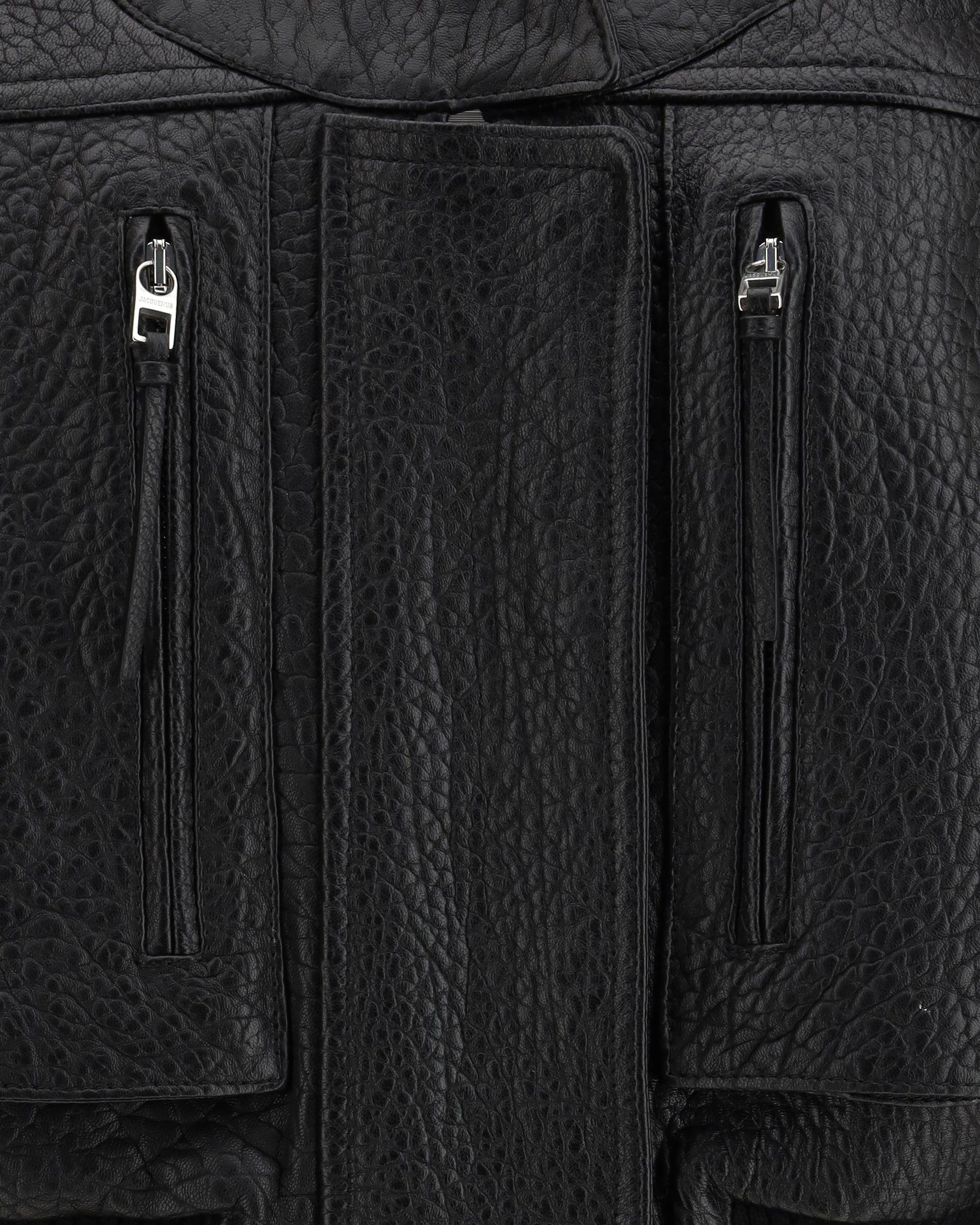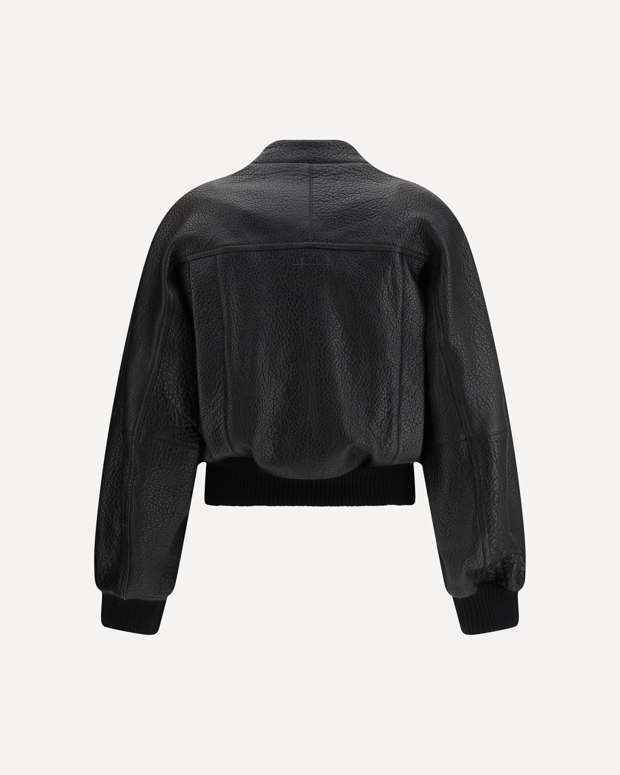 Il Bomber Tore di Jacquemus, realizzato in morbida pelle di agnello martellata, combina artigianalità e design contemporaneo in un capo dallo stile deciso. La chiusura frontale coperta con zip e bottoni automatici, insieme allo scollo rotondo con bottone coperto, conferisce un’eleganza discreta. Le maniche tondeggianti e il taglio leggermente cropped enfatizzano la silhouette oversize, mentre i dettagli come le tasche a soffietto e oblique con zip, il logo Jacquemus goffrato sul retro e il fondo in maglia a coste ne sottolineano la qualità e la cura dei dettagli. Un capo sofisticato e audace che esprime pienamente l’estetica contemporanea della Maison.