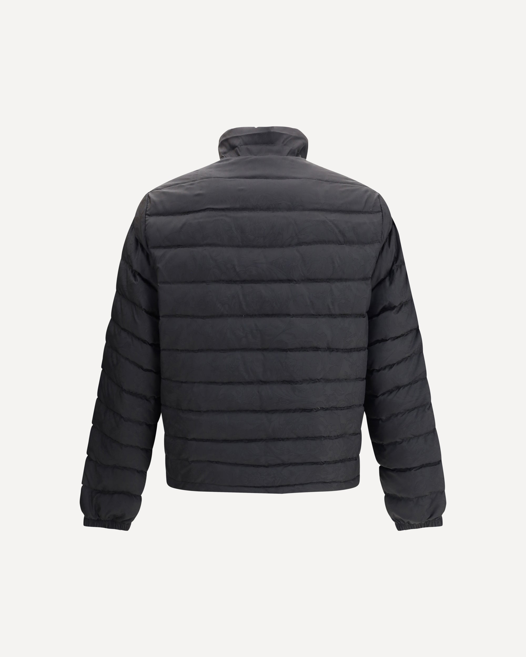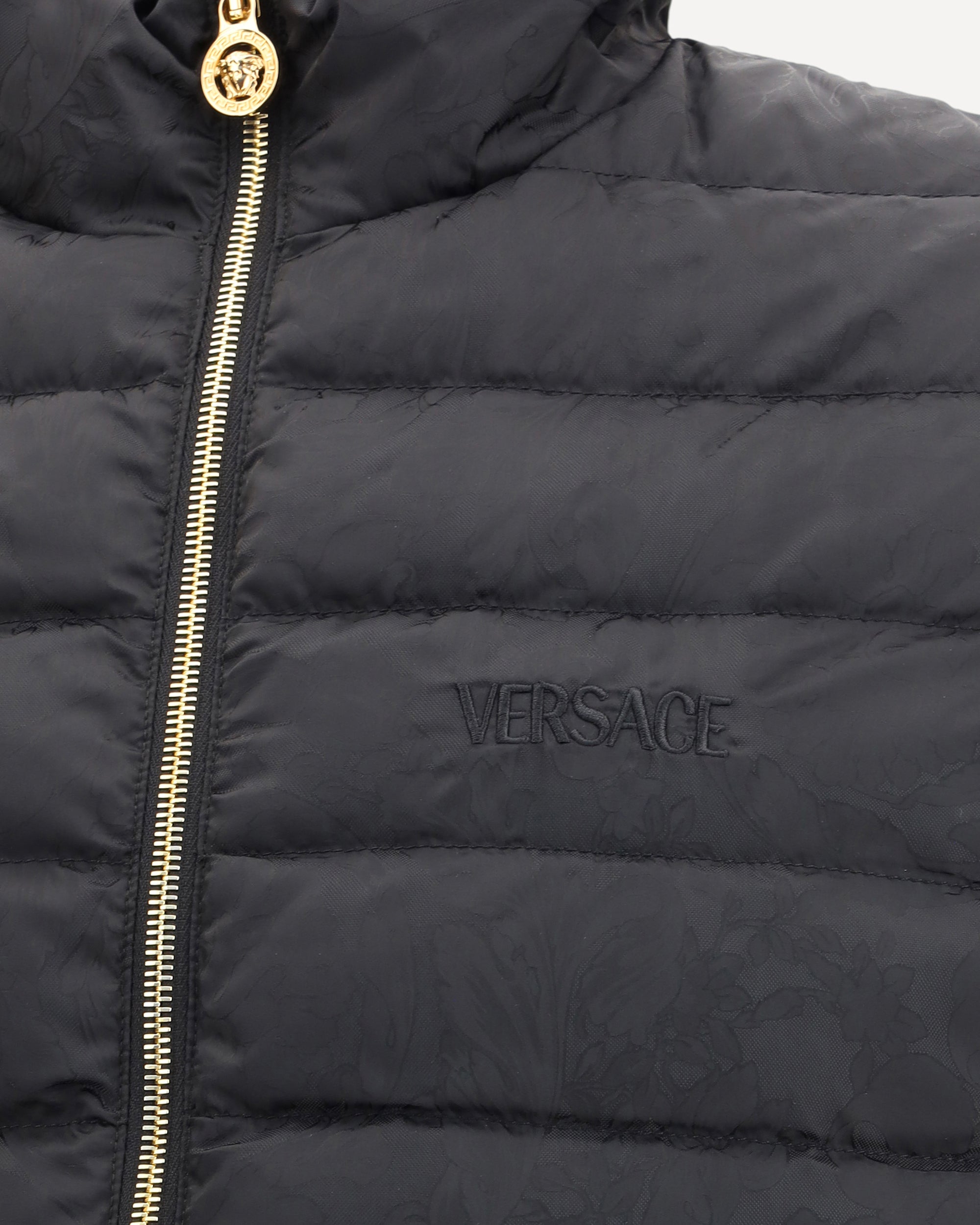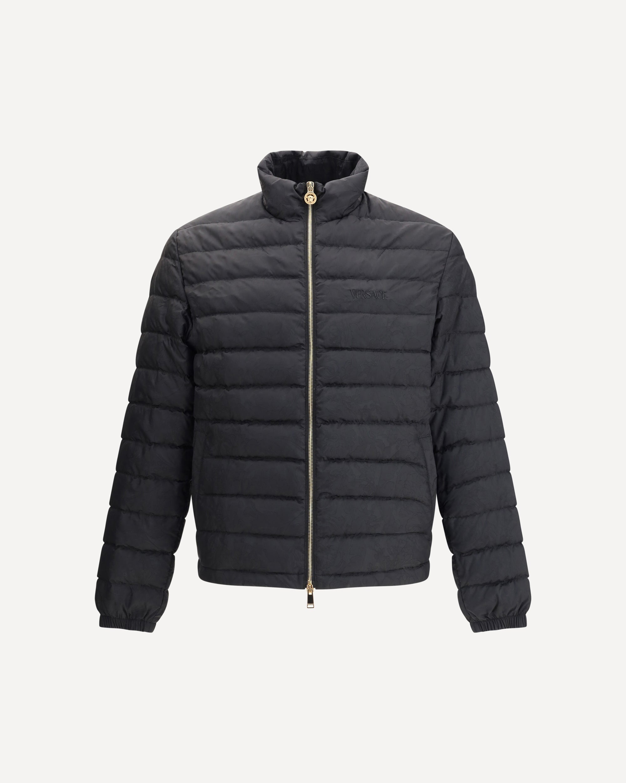Piumino di Versace, caratterizzato da un collo alto e una chiusura frontale con cerniera a doppio cursore per una maggiore praticità e protezione. Dotato di due tasche laterali a filetto con bottone, unisce funzionalità ed eleganza. Il design è impreziosito dall’iconica trama barocca, simbolo distintivo del brand, che dona un tocco audace e sofisticato. Completano il capo l’orlo regolabile con coulisse, che permette di adattare la vestibilità secondo le esigenze.
