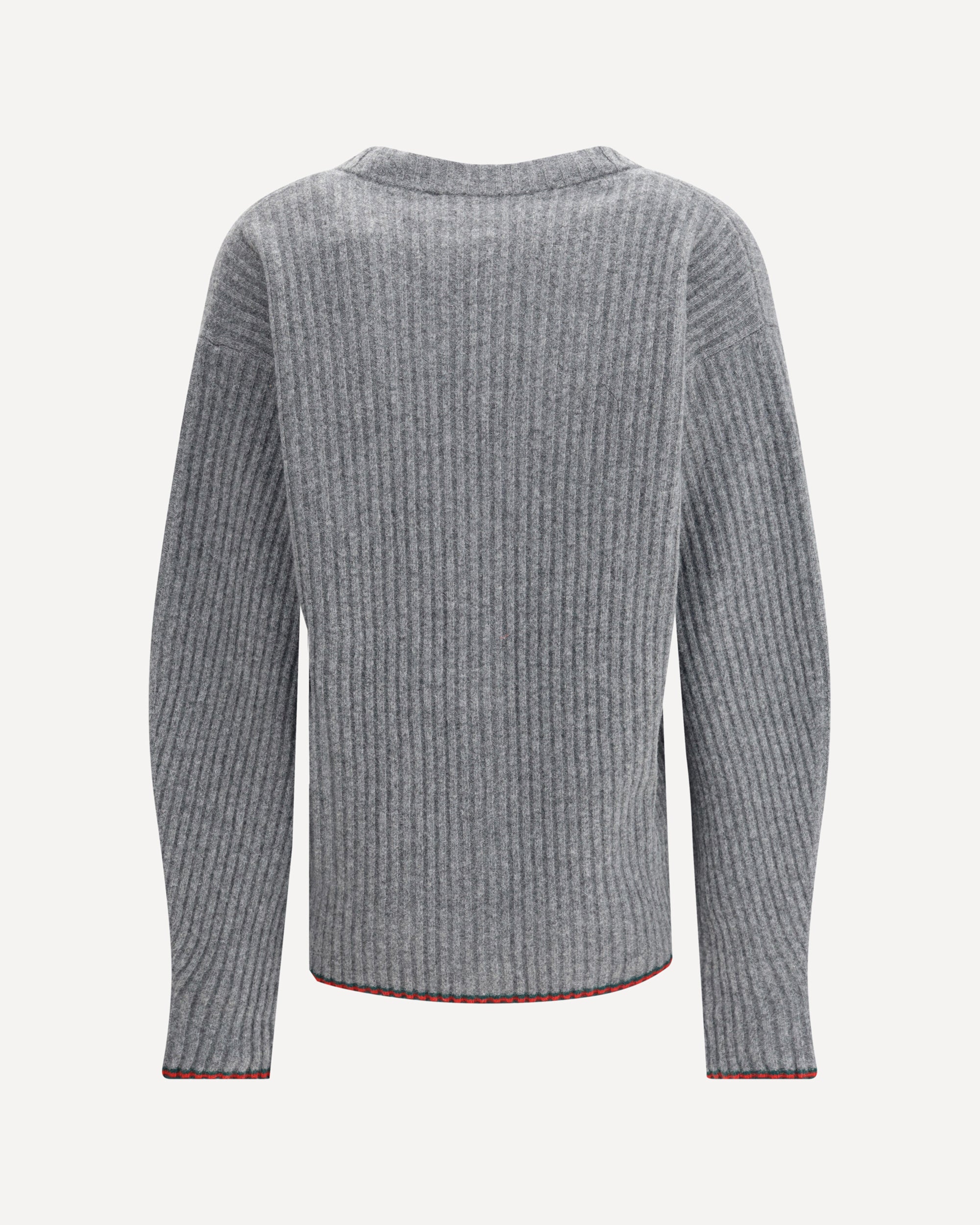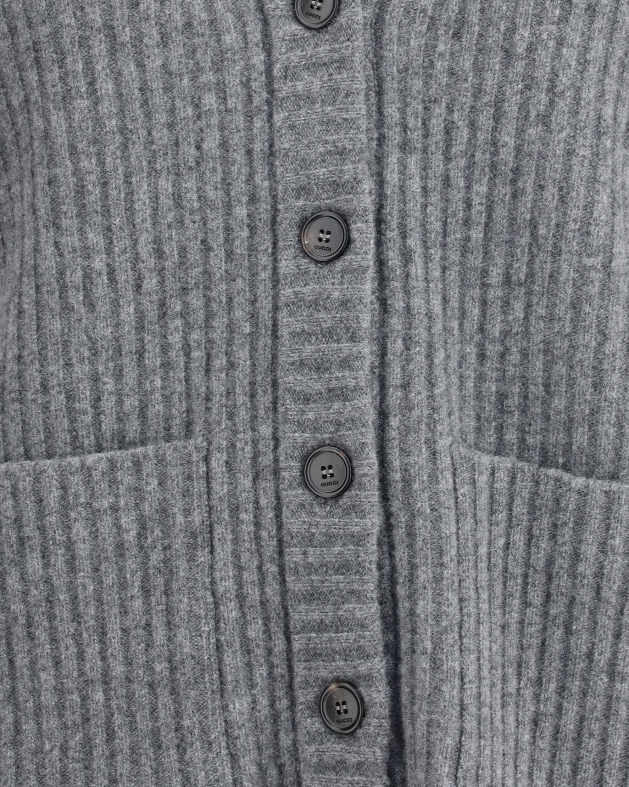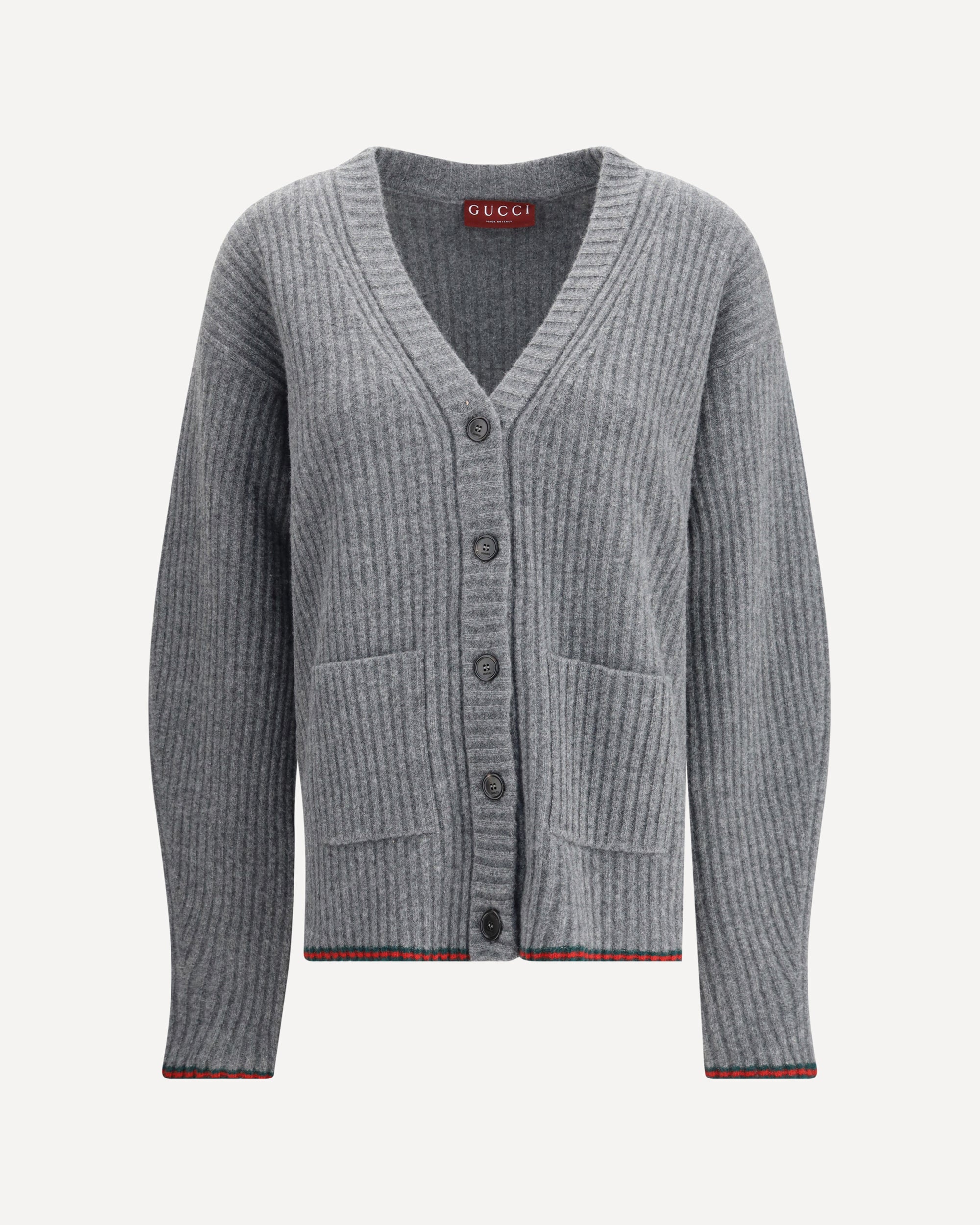 Il Cardigan in Lana di Gucci è un classico intramontabile che si distingue per la lavorazione a coste e lo scollo a V dal carattere raffinato. Le spalle scese e le maniche lunghe creano una linea morbida e rilassata, mentre il dettaglio del trim Web nei toni iconici verde e rosso rifinisce polsini e orlo, sottolineando l’identità della maison. La chiusura frontale con bottoni completa un capo versatile, capace di fondere eleganza e quotidianità.