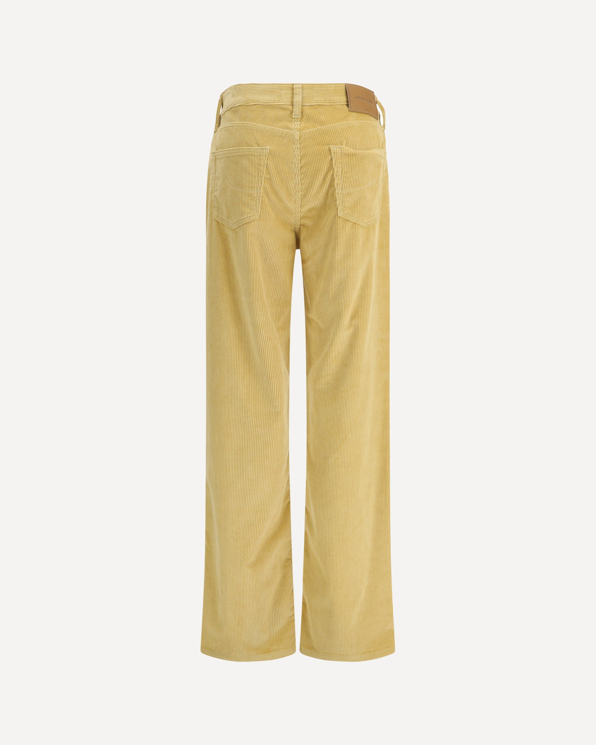Il Pantalone Hailey unisce la praticità del modello a cinque tasche con l’eleganza rilassata del velluto a coste di puro cotone, tinto in capo per un effetto caldo e naturale. La gamba ampia e la vestibilità straight fit esprimono uno stile disinvolto e contemporaneo, mentre i dettagli sartoriali raccontano la cura artigianale: la salpa in pelle tabacco con logo impresso, il bottone a chiodo con finitura oro antico e l’etichetta a loop sul taschino. L’interno rivela un ricamo con il nome del pantalone e una citazione del fondatore, a testimonianza di un design che intreccia comfort, identità e carattere autentico.