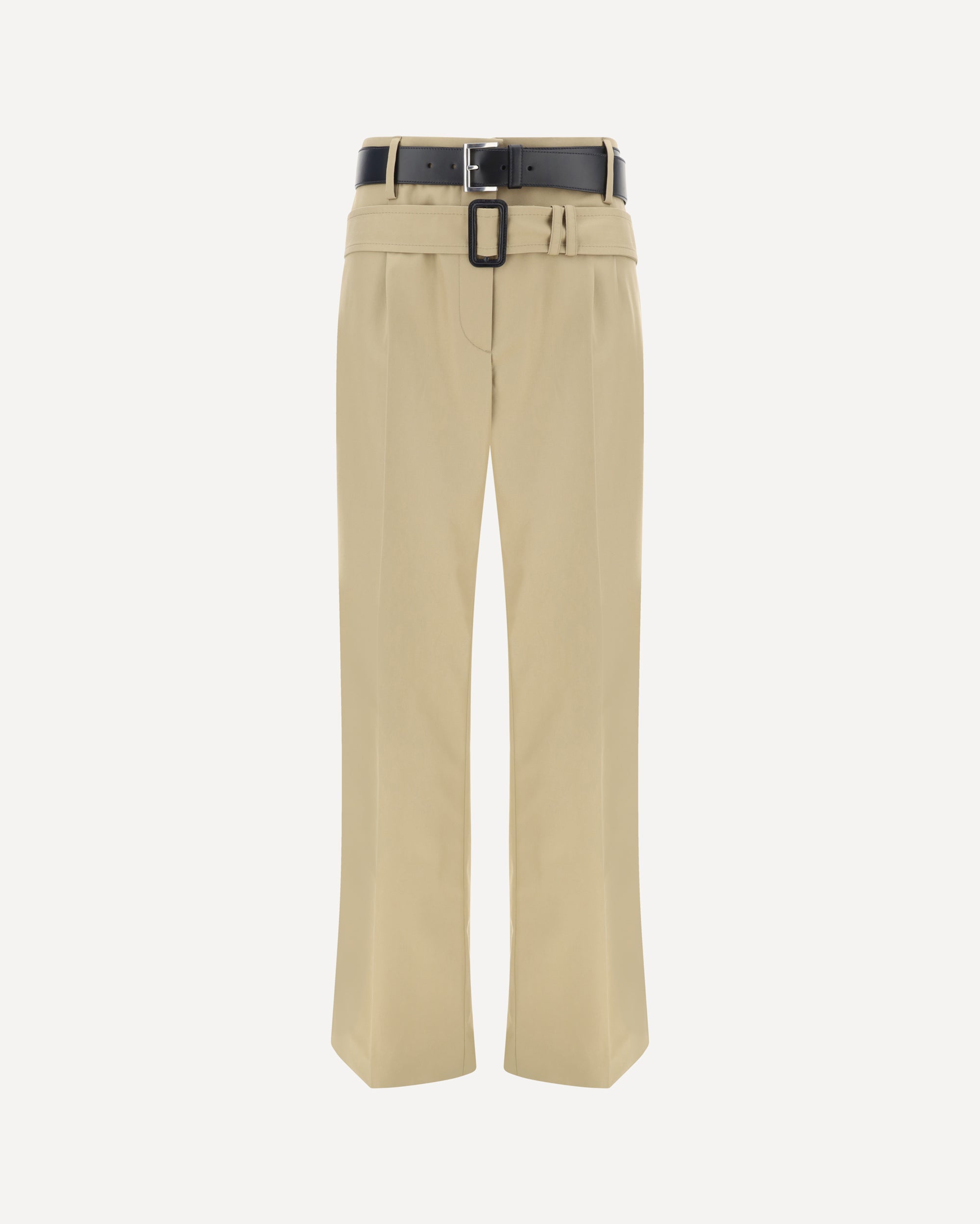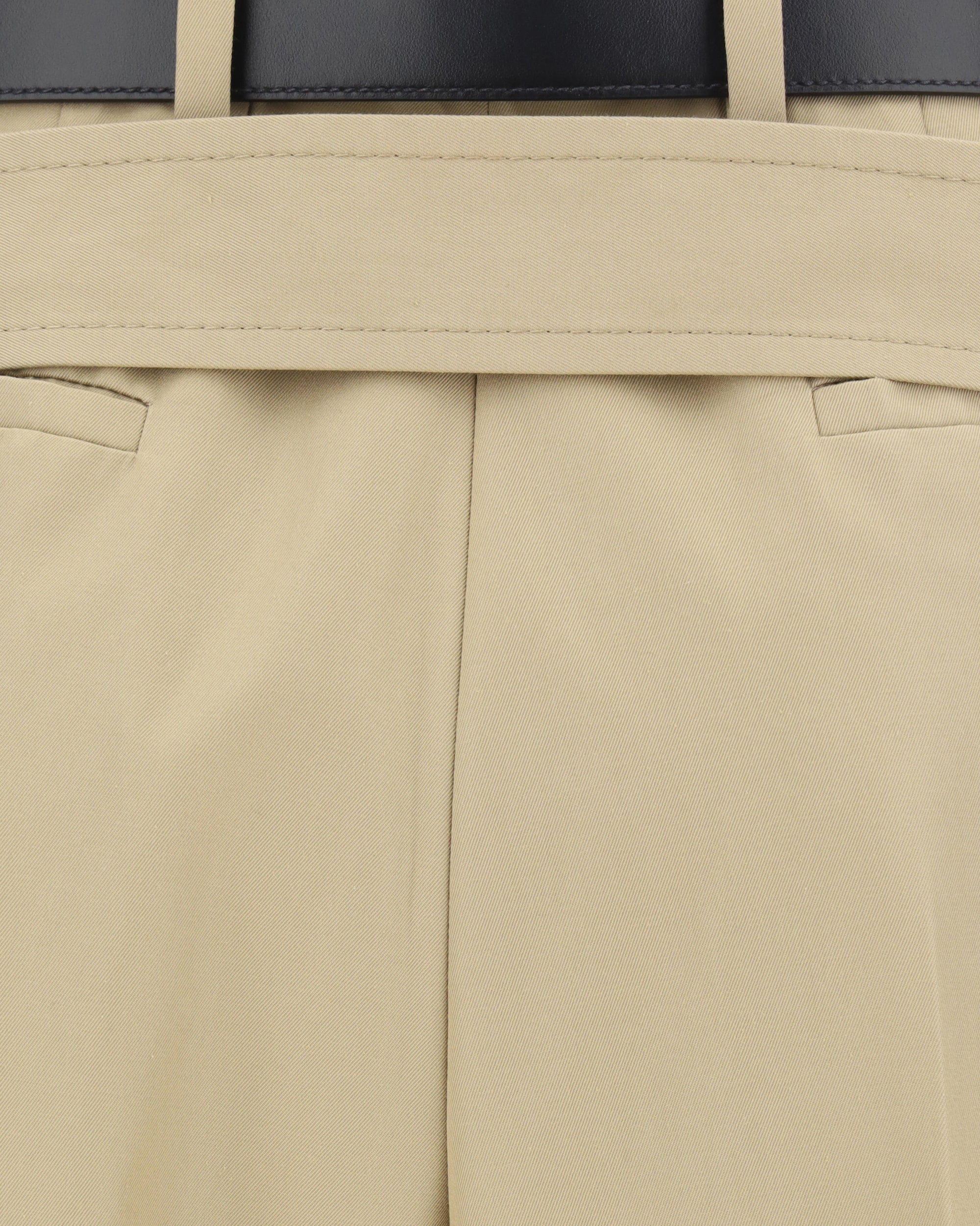 Pantaloni in Cotone di Prada, chiusura frontale con bottone e cerniera, due tasche all'americana laterali, due tasche a filetto sul retro, passanti per cintura girovita, cintura in pelle applicata regolabile e removibile, vestibilità regular.