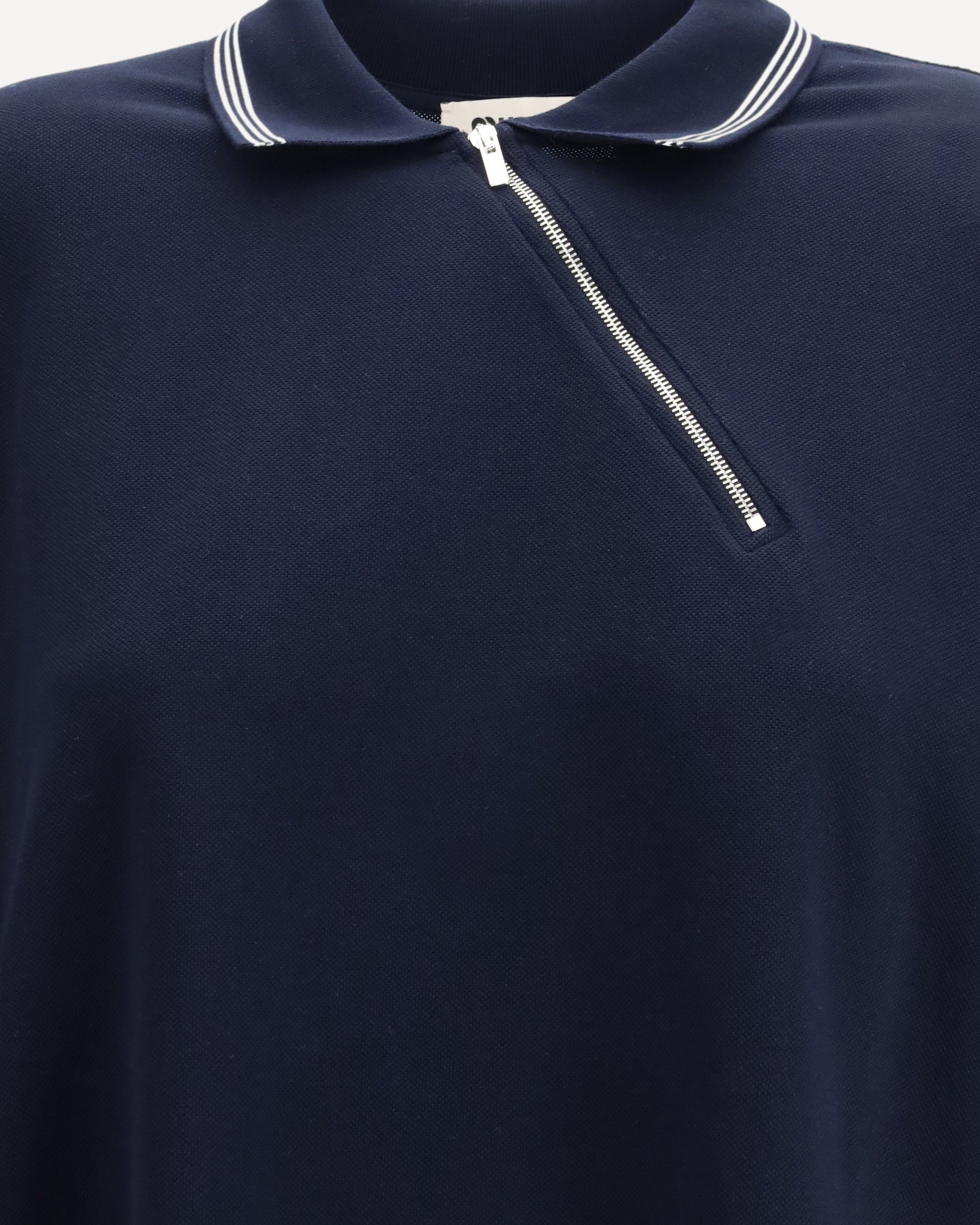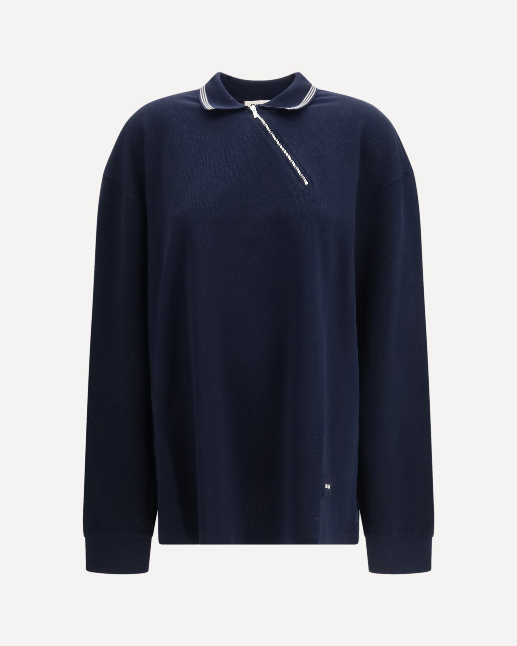 La Polo a maniche lunghe reinterpreta un grande classico del guardaroba con un linguaggio contemporaneo e sofisticato. La linea pulita è arricchita da una chiusura laterale con zip, dettaglio inaspettato che introduce un gioco di volumi e suggerisce una femminilità in continua evoluzione. Il collo a costine con logo intarsiato e motivo a righe aggiunge un accento grafico distintivo, mentre la spalla inglese contribuisce a definire una silhouette strutturata ma fluida. Un capo essenziale rivisitato con carattere moderno ed elegante.
