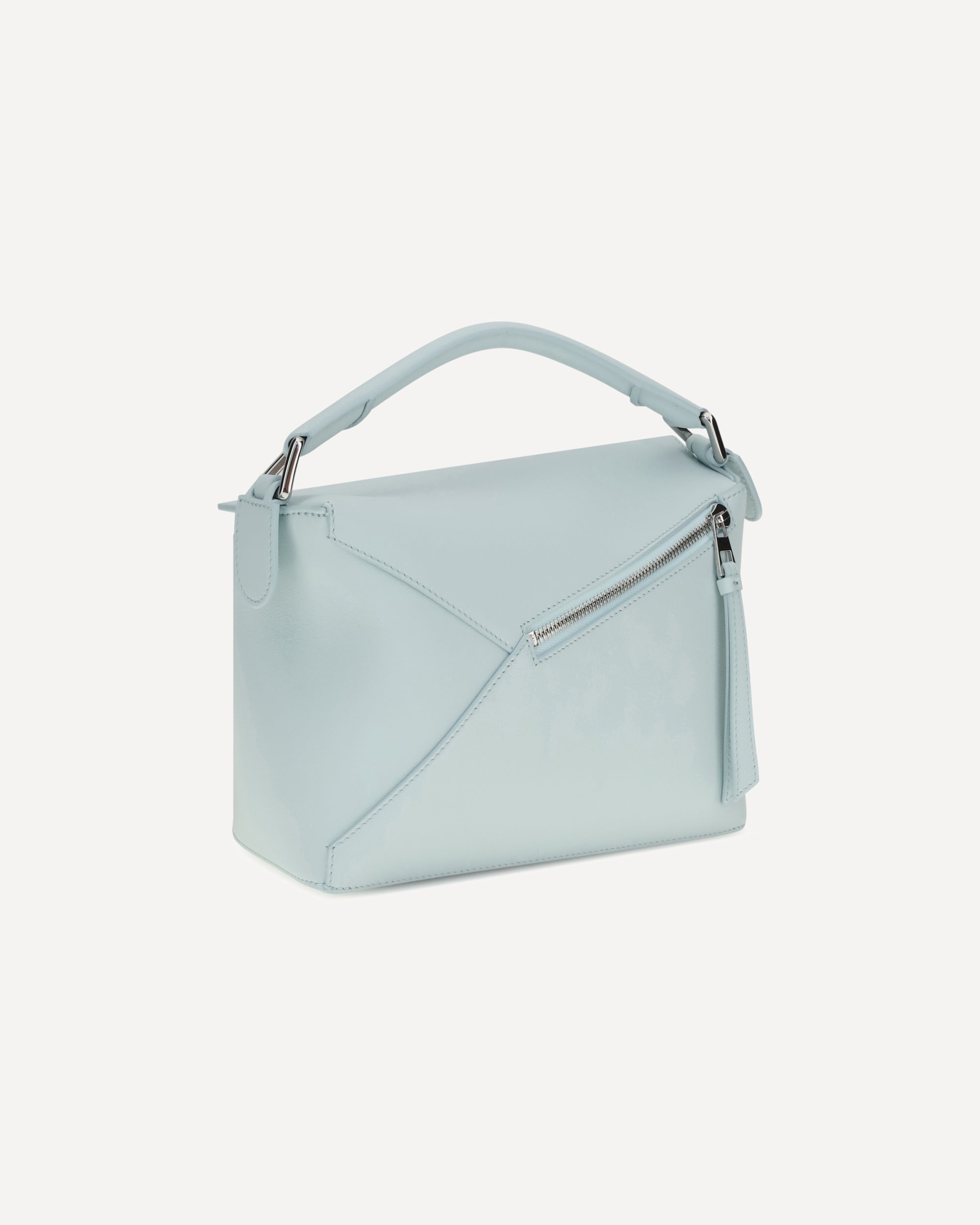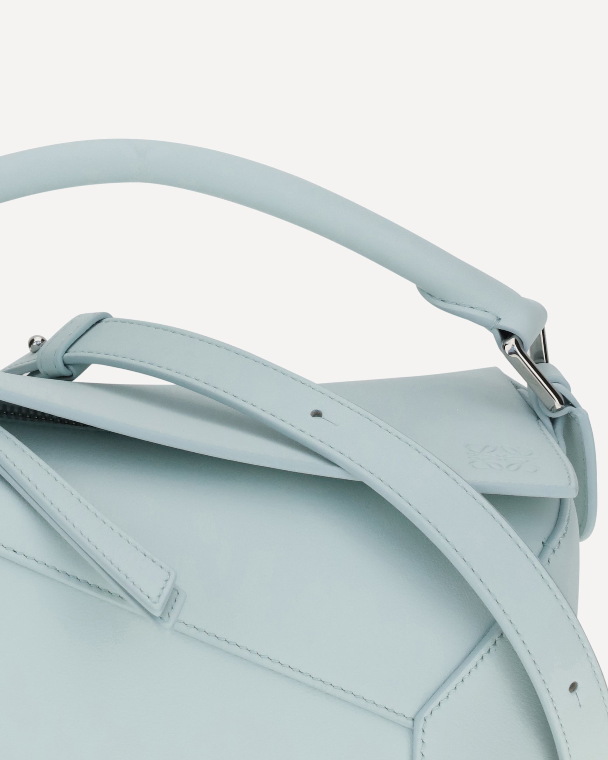 La Borsa a Mano Puzzle piccola in pelle martellata di Loewe si distingue per il design a pannelli geometrici e il manico rigido che ne esalta la struttura. Dotata di tracolla removibile, presenta una chiusura superiore con patta coprente e cerniera, impreziosita dall’iconico logo stampato a pressione sulla patta. All’interno un unico scomparto e una tasca a filetto sul retro completano questa borsa elegante e funzionale.