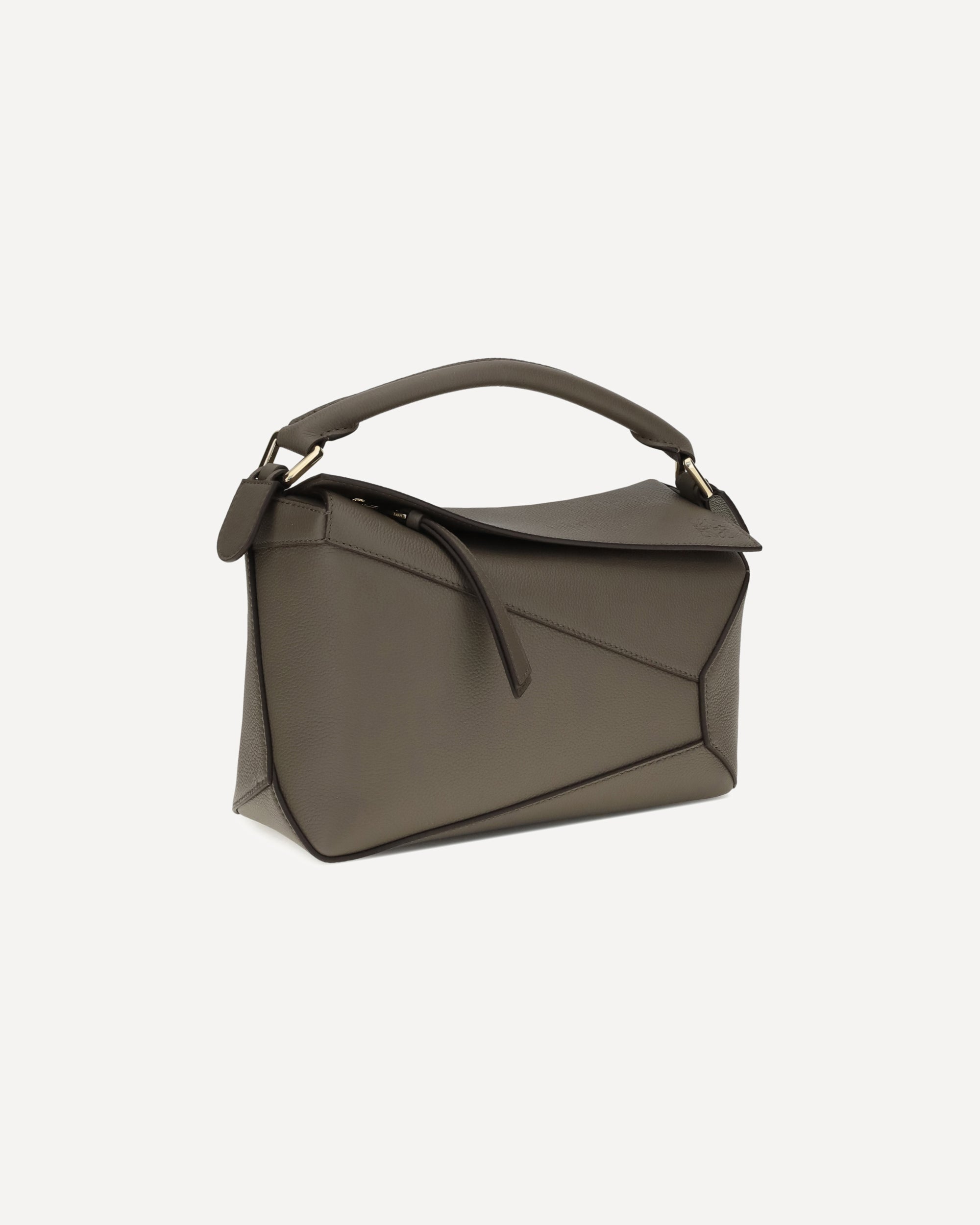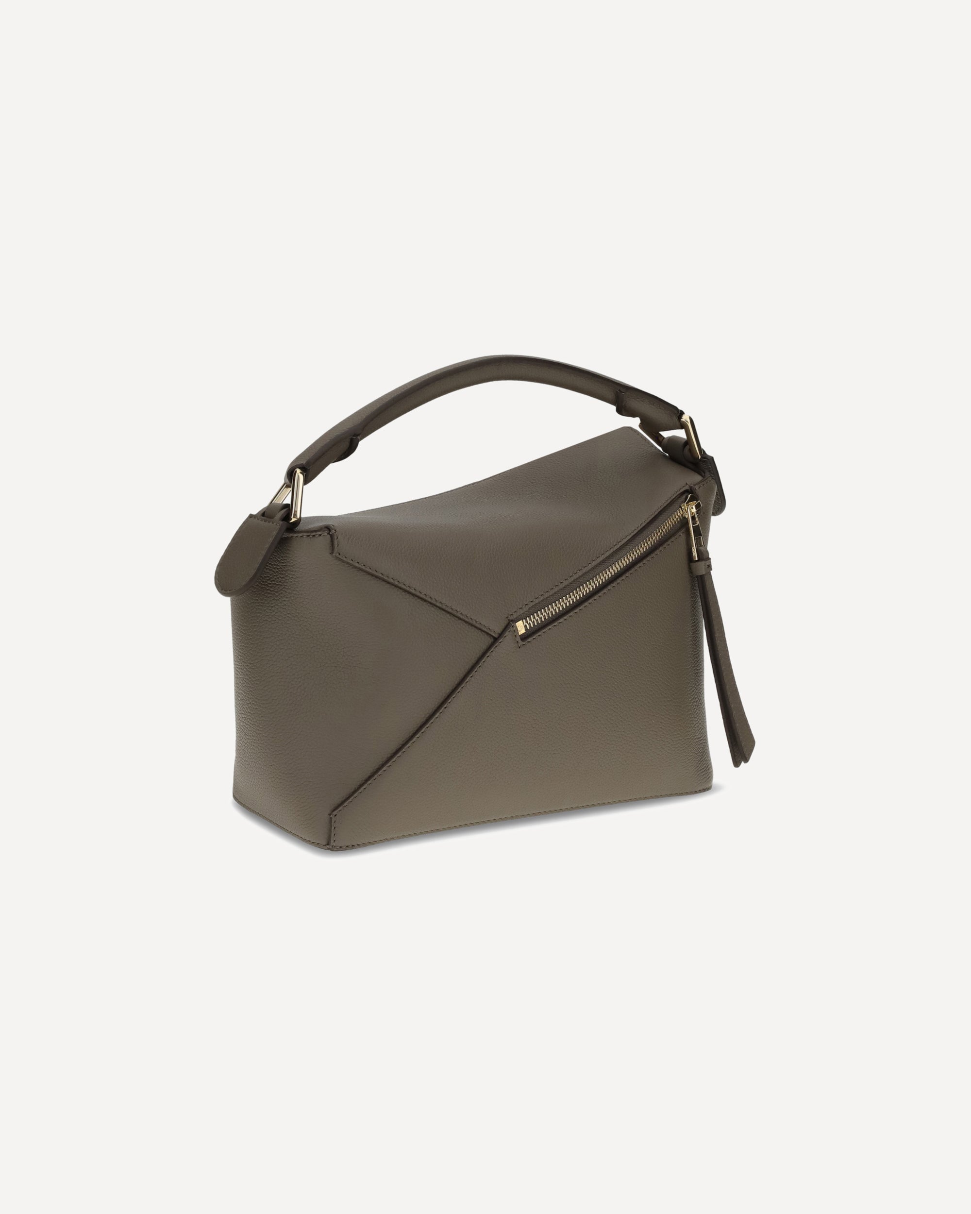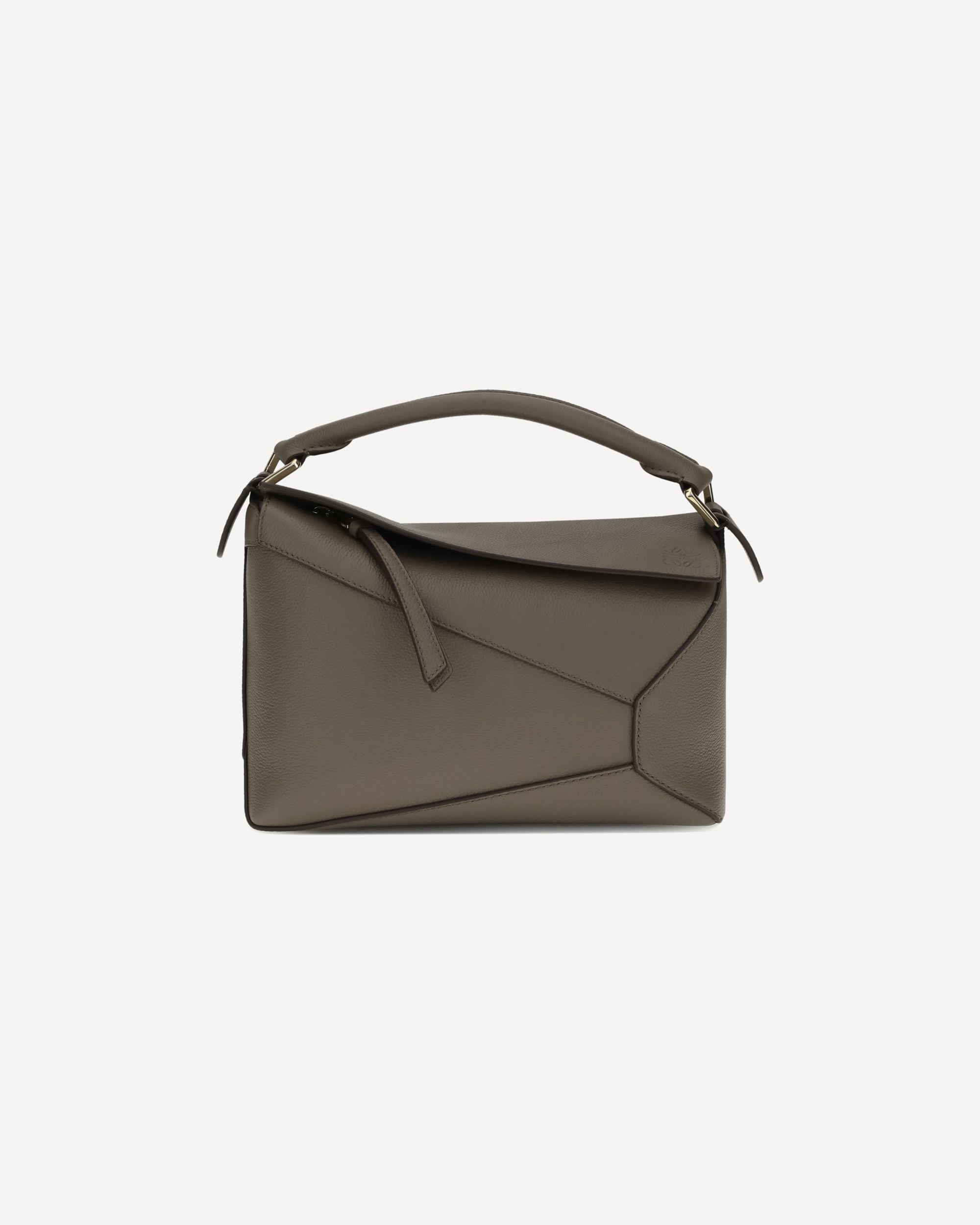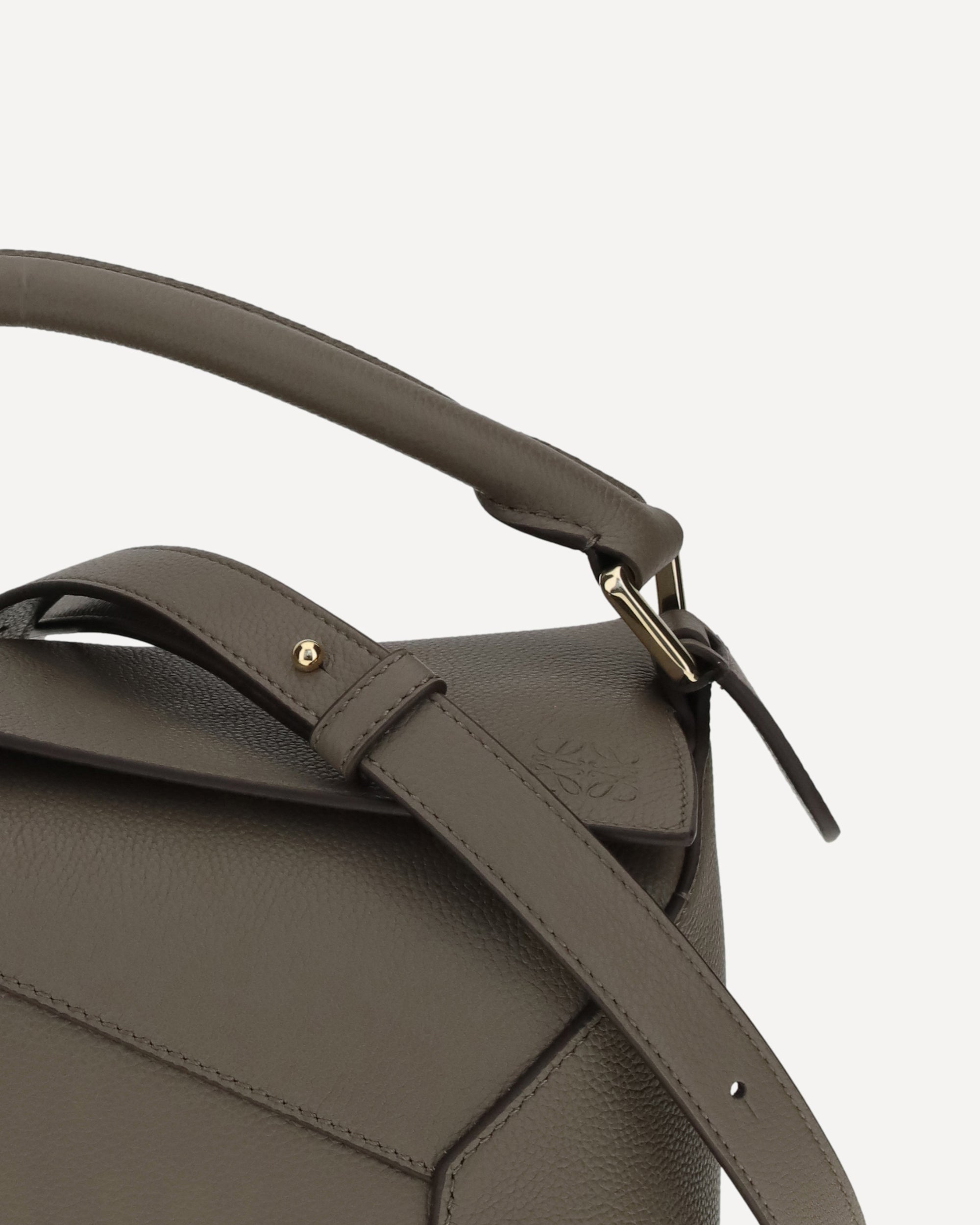 La Borsa a Mano Puzzle piccola in pelle martellata di Loewe si distingue per il design a pannelli geometrici e il manico rigido che ne esalta la struttura. Dotata di tracolla removibile, presenta una chiusura superiore con patta coprente e cerniera, impreziosita dall’iconico logo stampato a pressione sulla patta. All’interno un unico scomparto e una tasca a filetto sul retro completano questa borsa elegante e funzionale.