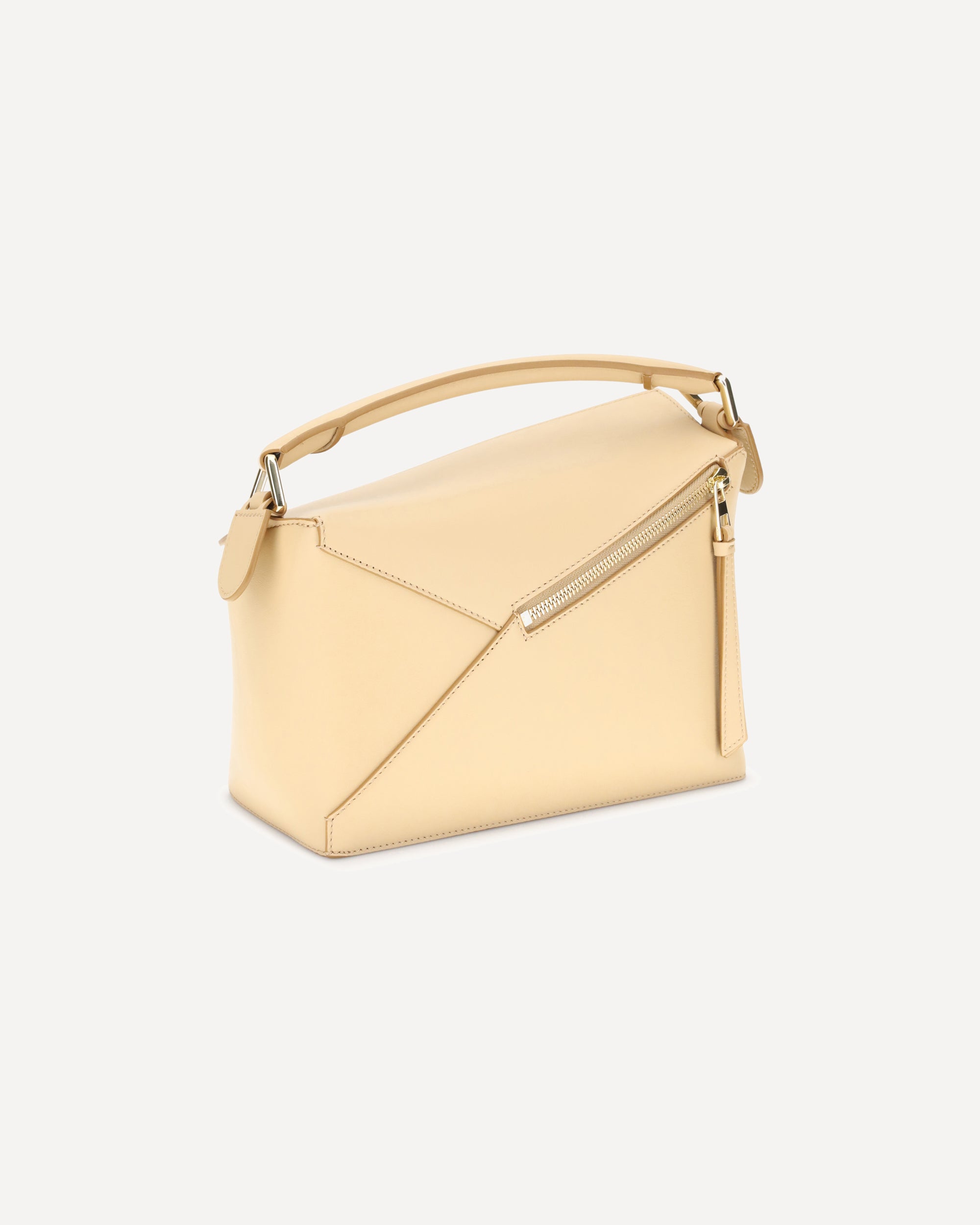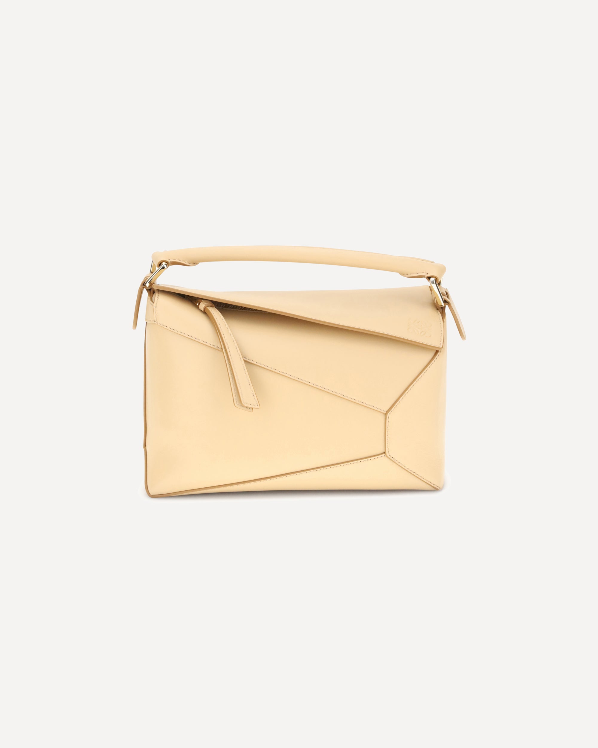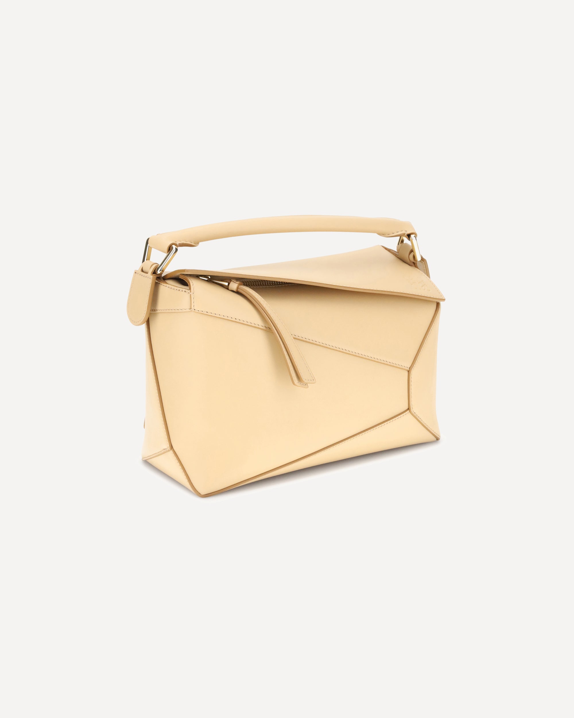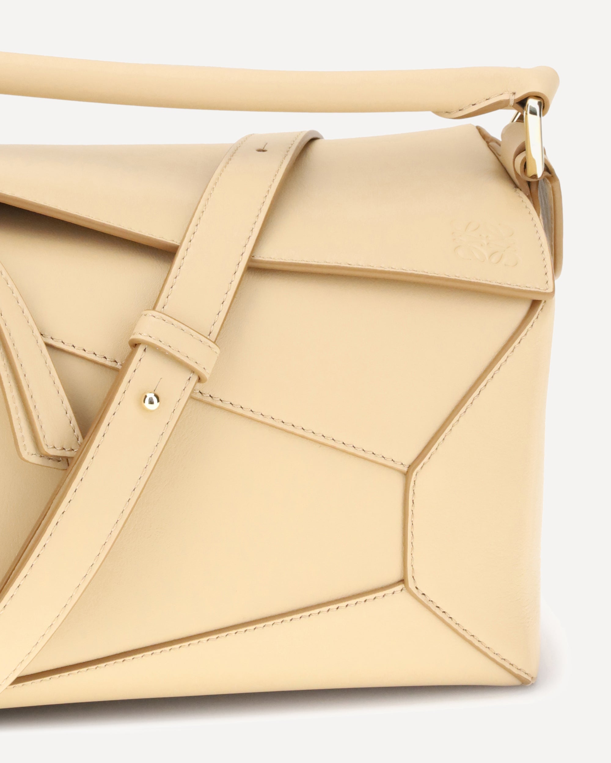 La Borsa a Mano Puzzle piccola in pelle martellata di Loewe si distingue per il design a pannelli geometrici e il manico rigido che ne esalta la struttura. Dotata di tracolla removibile, presenta una chiusura superiore con patta coprente e cerniera, impreziosita dall’iconico logo stampato a pressione sulla patta. All’interno un unico scomparto e una tasca a filetto sul retro completano questa borsa elegante e funzionale.