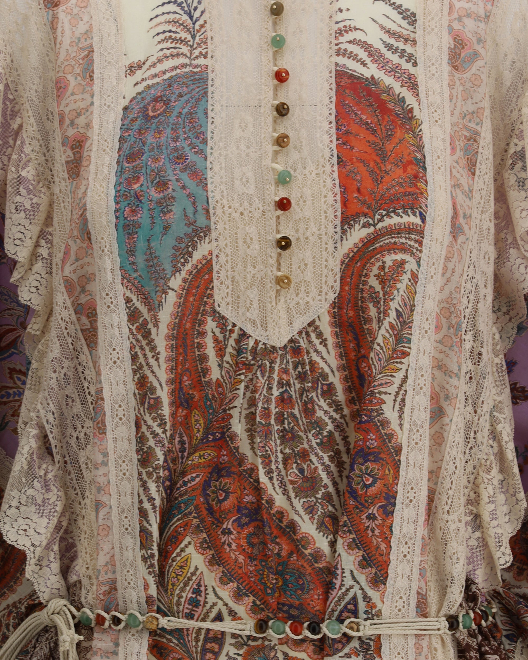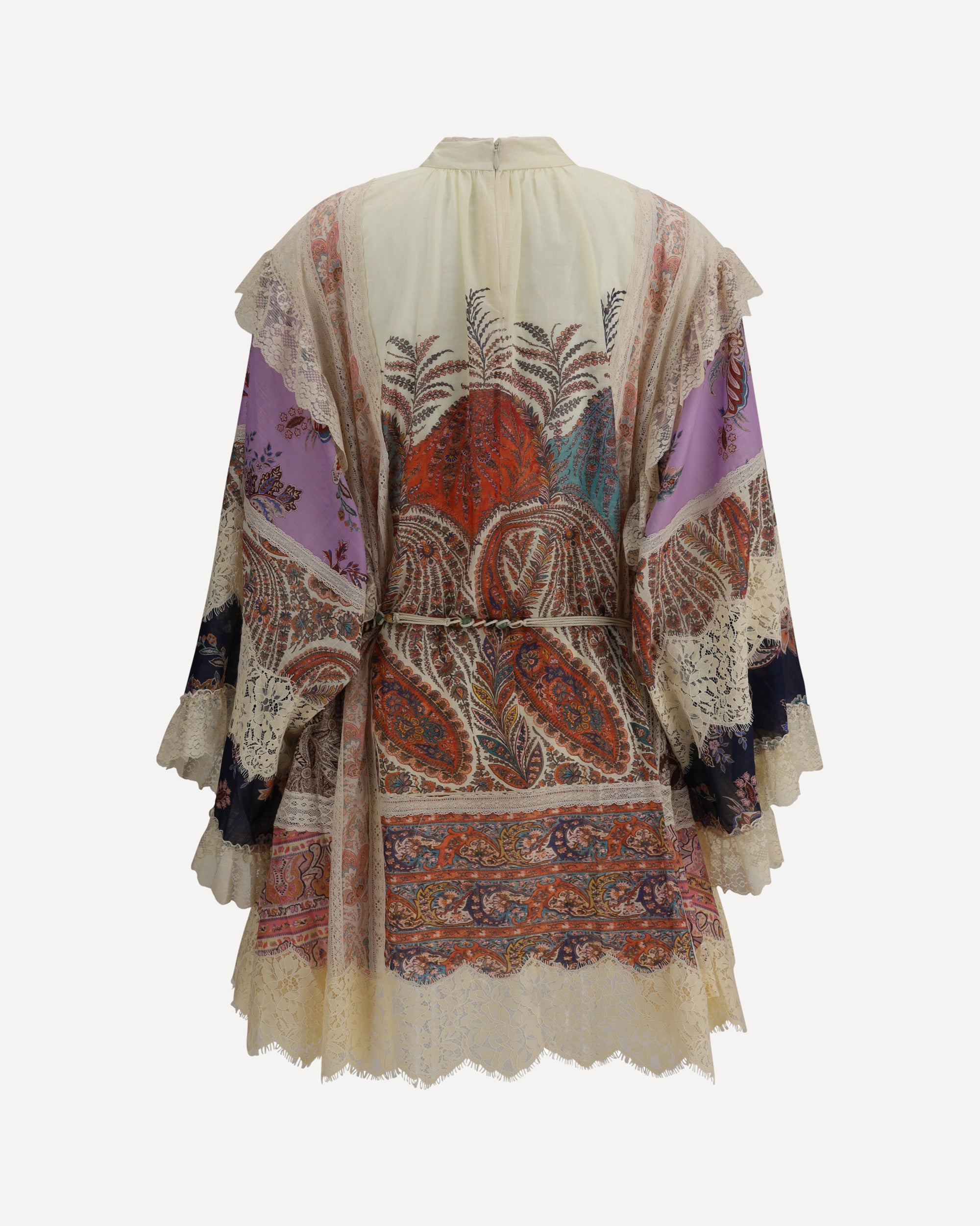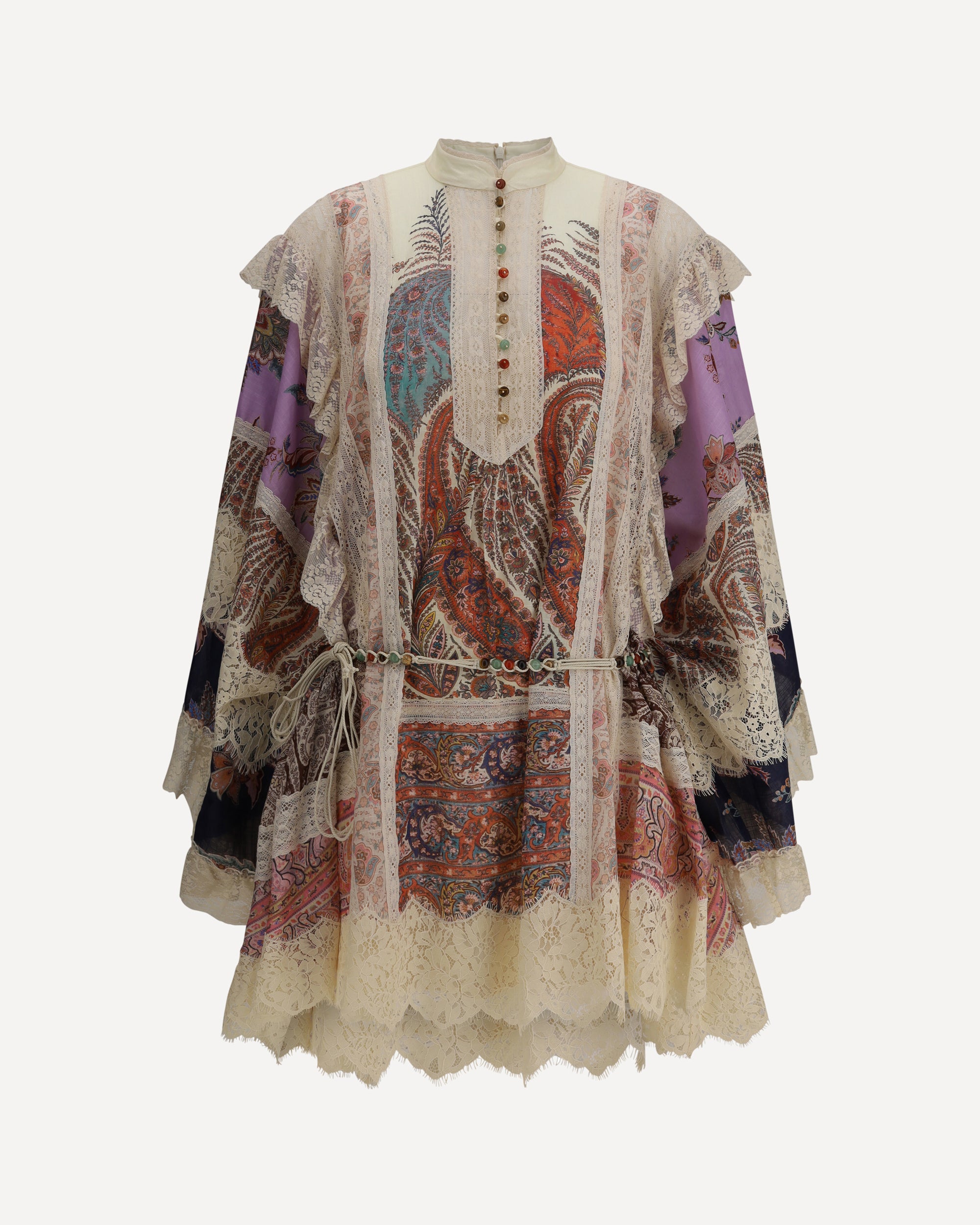 L'Abito corto Rhiannon di Zimmerman è una creazione elegante e sofisticata che incarna la fusione tra romanticismo e raffinatezza. Il design si caratterizza per le maniche lunghe e ampie, che aggiungono una nota di drammaticità, e il collo alto che conferisce un'aria di classe. La cintura da annodare, arricchita da perline, sottolinea la vita con un dettaglio prezioso, mentre l'orlo asimmetrico smerlato e le finiture in pizzo aggiungono un tocco delicato e femminile. Le asole a cordoncino con bottoni impreziositi da pietre sul davanti donano un elemento decorativo che cattura l'attenzione. La chiusura con cerniera invisibile sulla parte superiore della schiena e la sottoveste separata completano l'abito con funzionalità e comfort