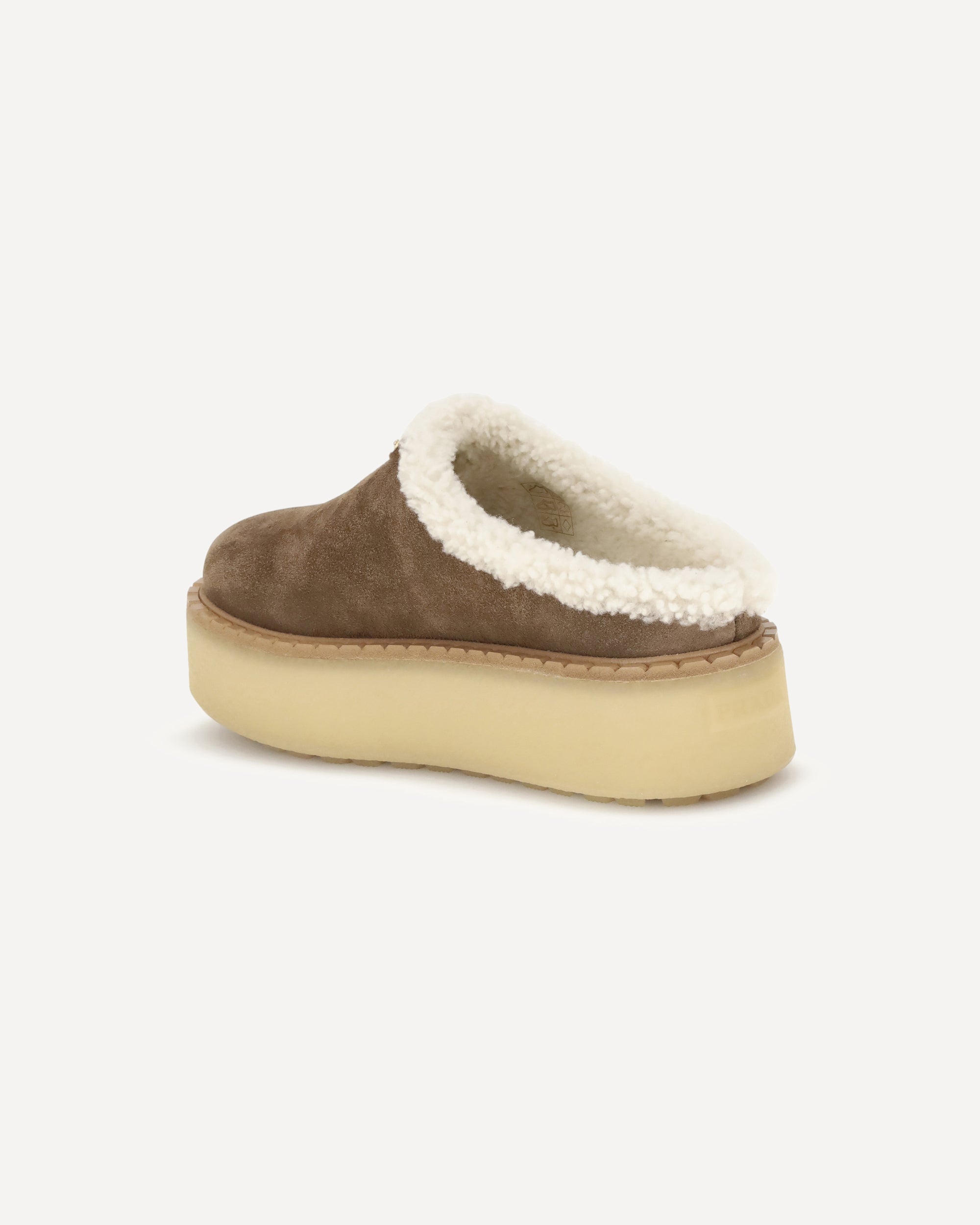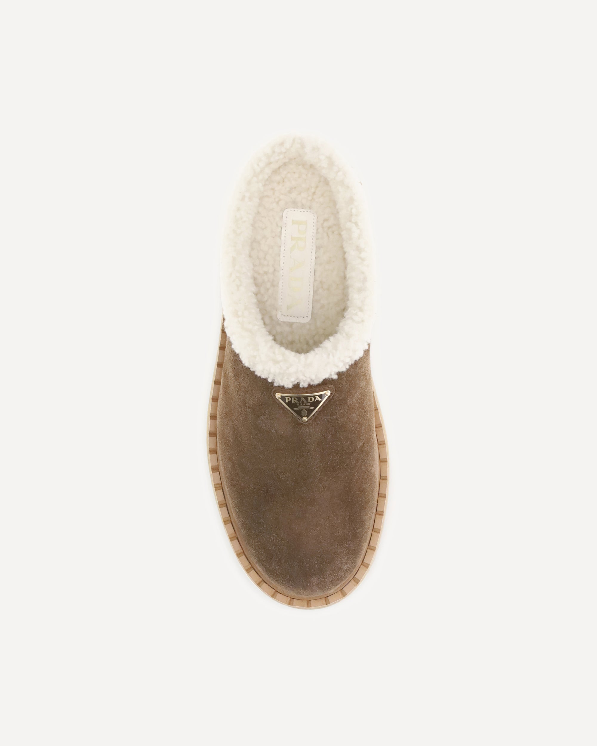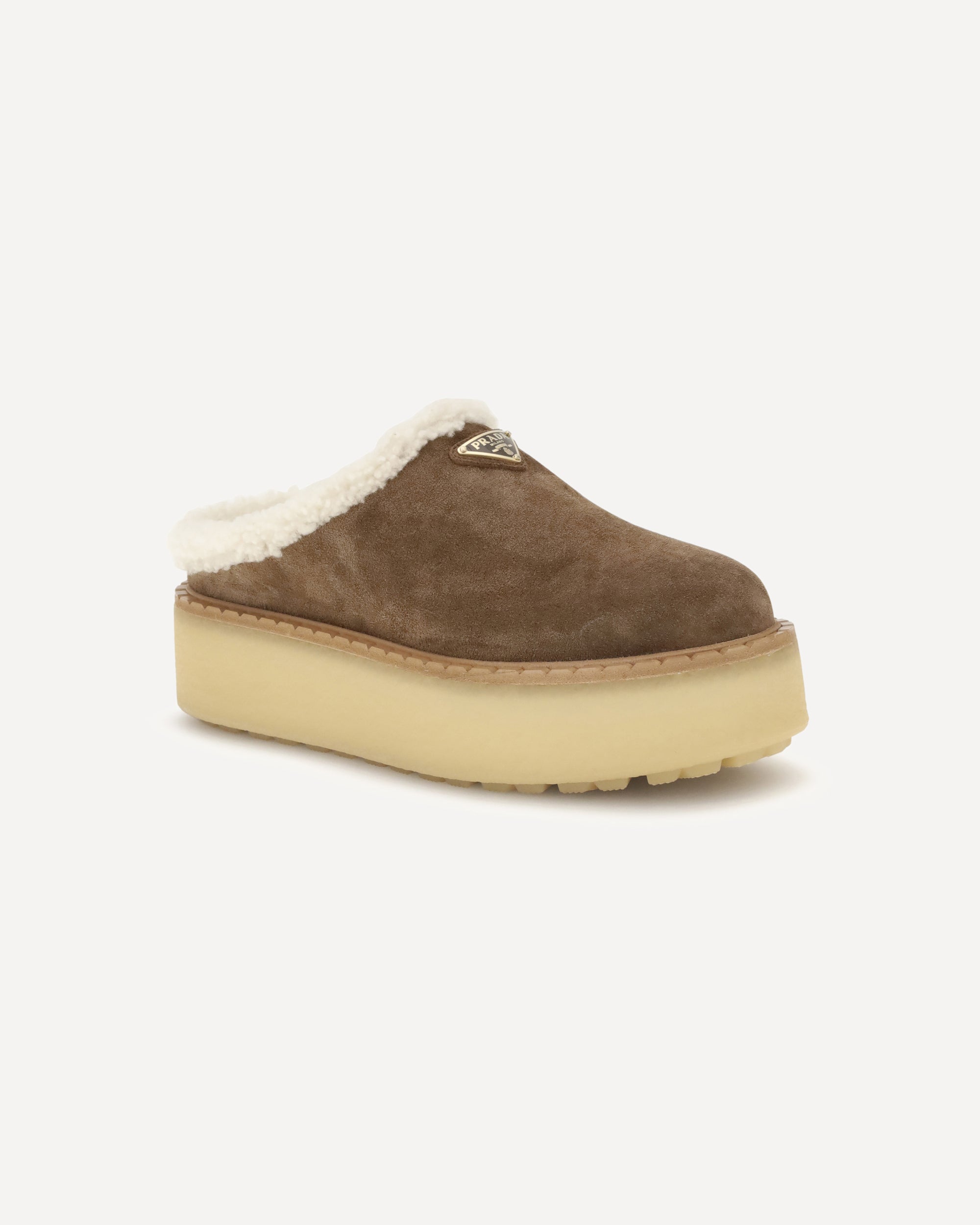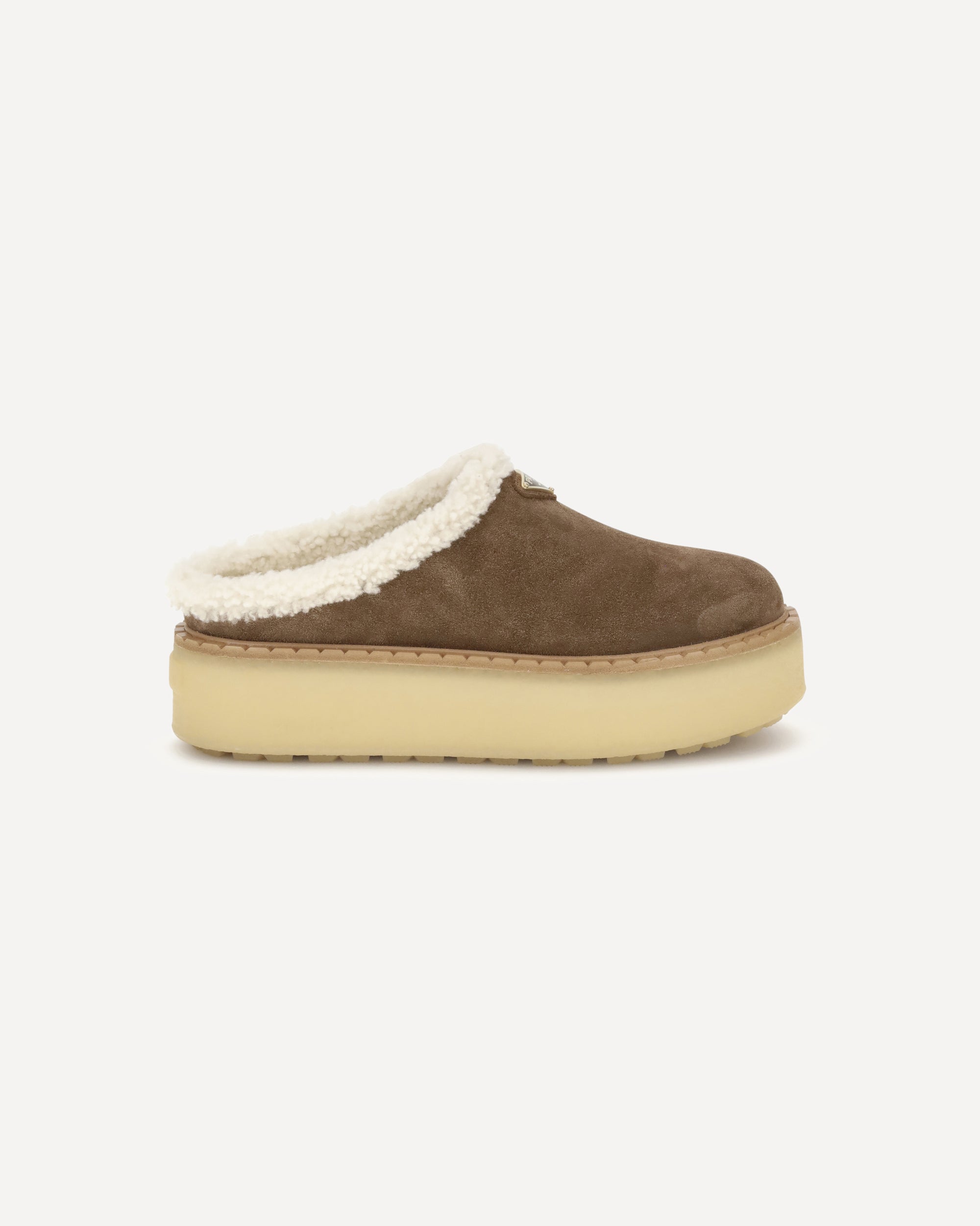 Le Mules platform di Prada combinano comfort e stile in un design audace e sofisticato. Realizzate in pelle scamosciata con punta tonda, sono foderate internamente in morbido shearling per una calzata avvolgente. La suola platform dona un tocco moderno, mentre l’iconica placca triangolare sul fronte firma il modello con un dettaglio distintivo.