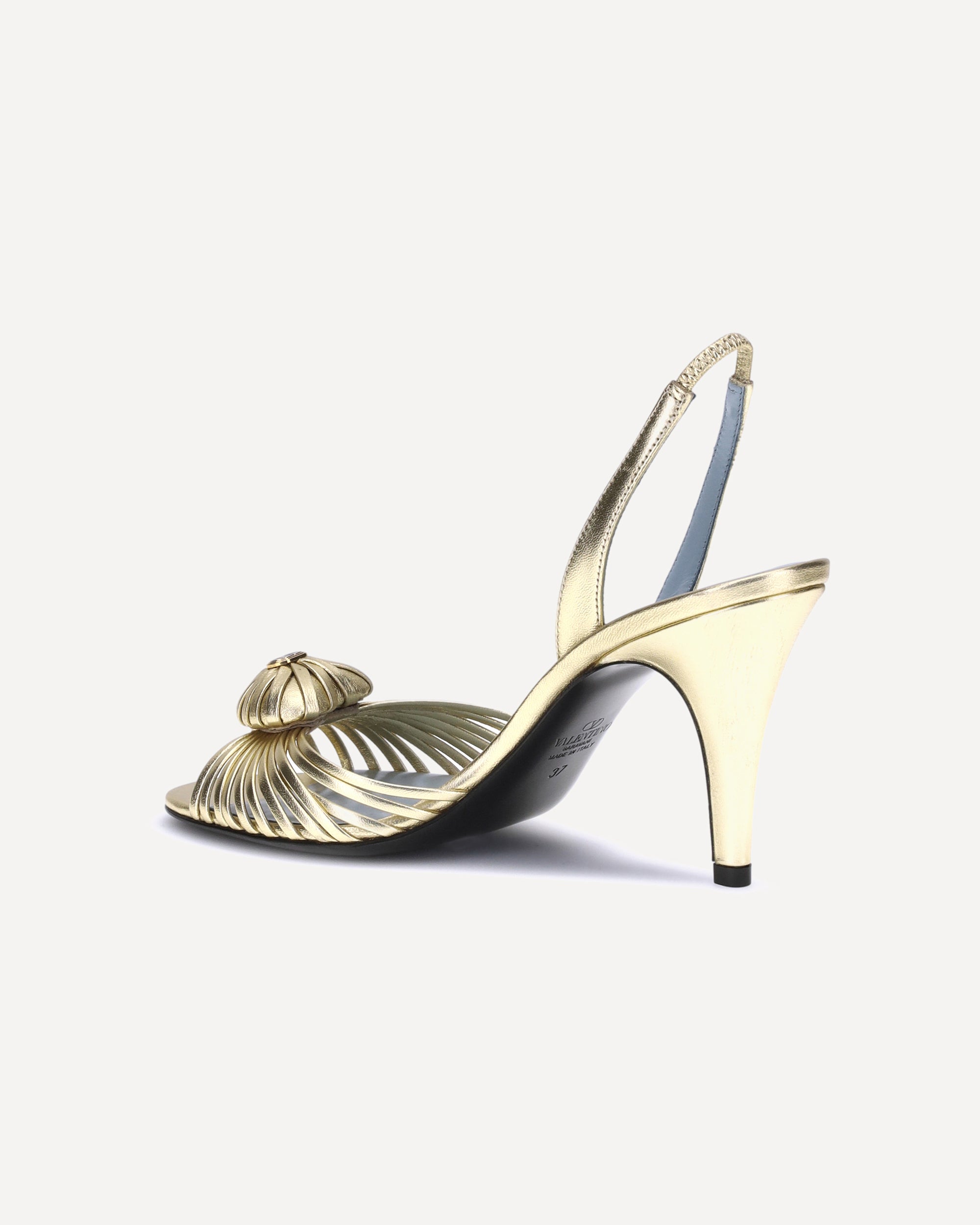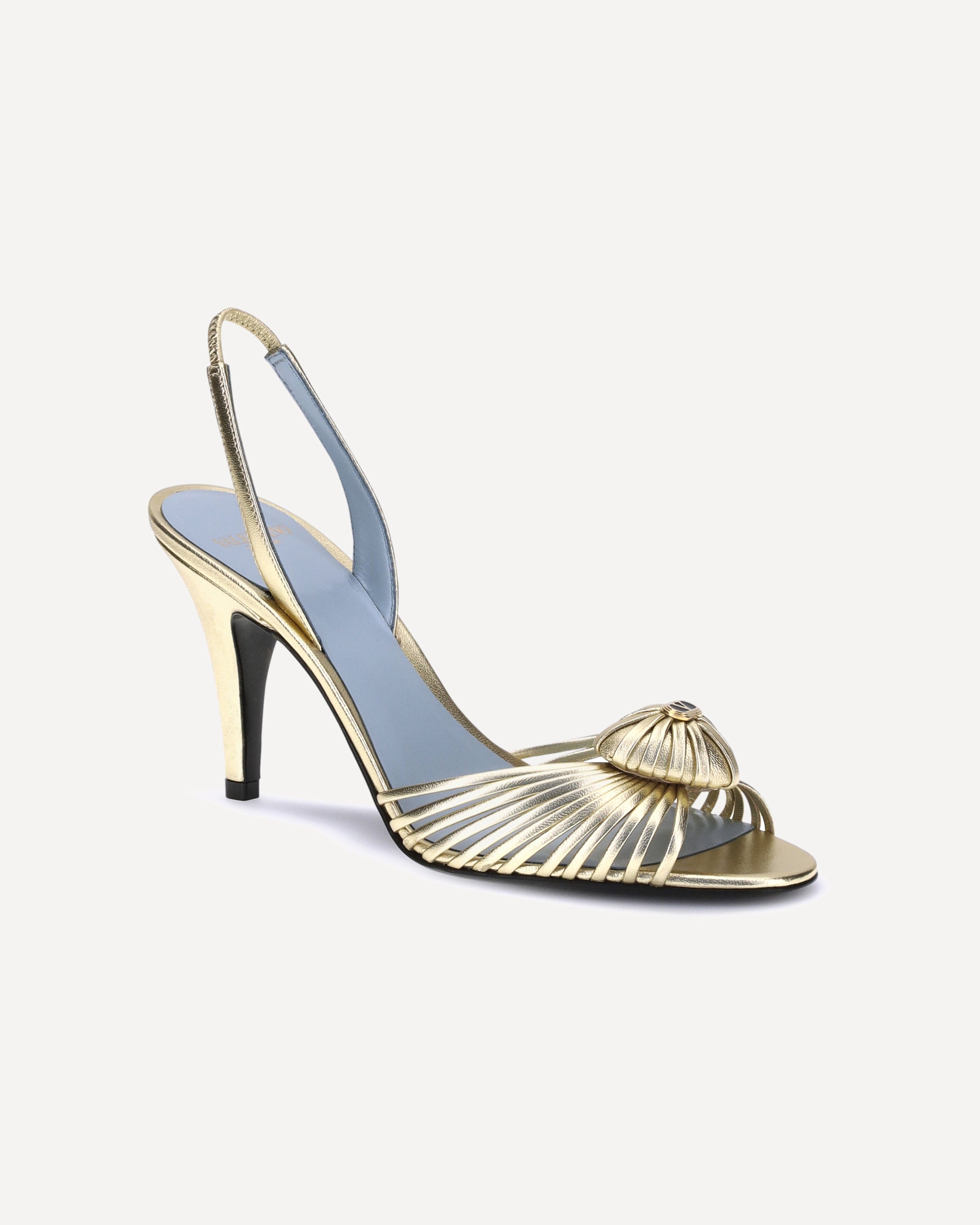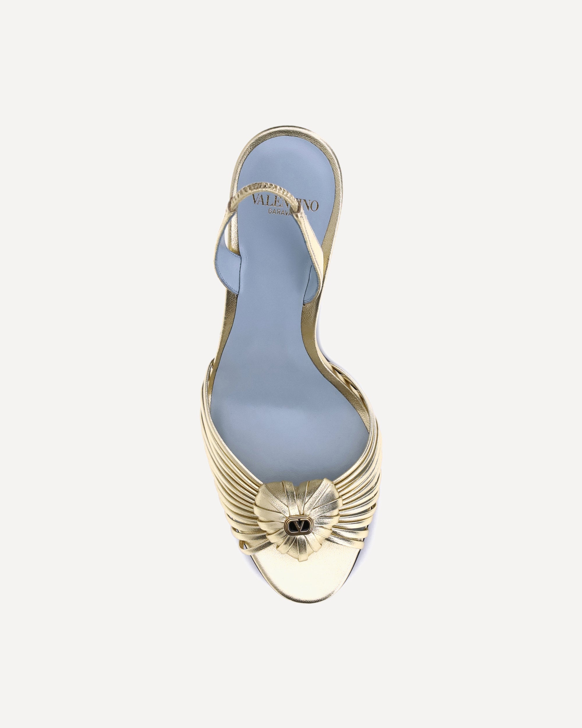 I Sandali Royal di Valentino Garavani sono realizzati in vitello laminato, unendo lucentezza e raffinatezza. Il dettaglio distintivo è il cuore tridimensionale in pelle con il VLogo Signature sul fronte, che dona un tocco romantico e iconico. Il modello slingback garantisce comfort e stabilità, mentre la soletta logata completa il design con eleganza.