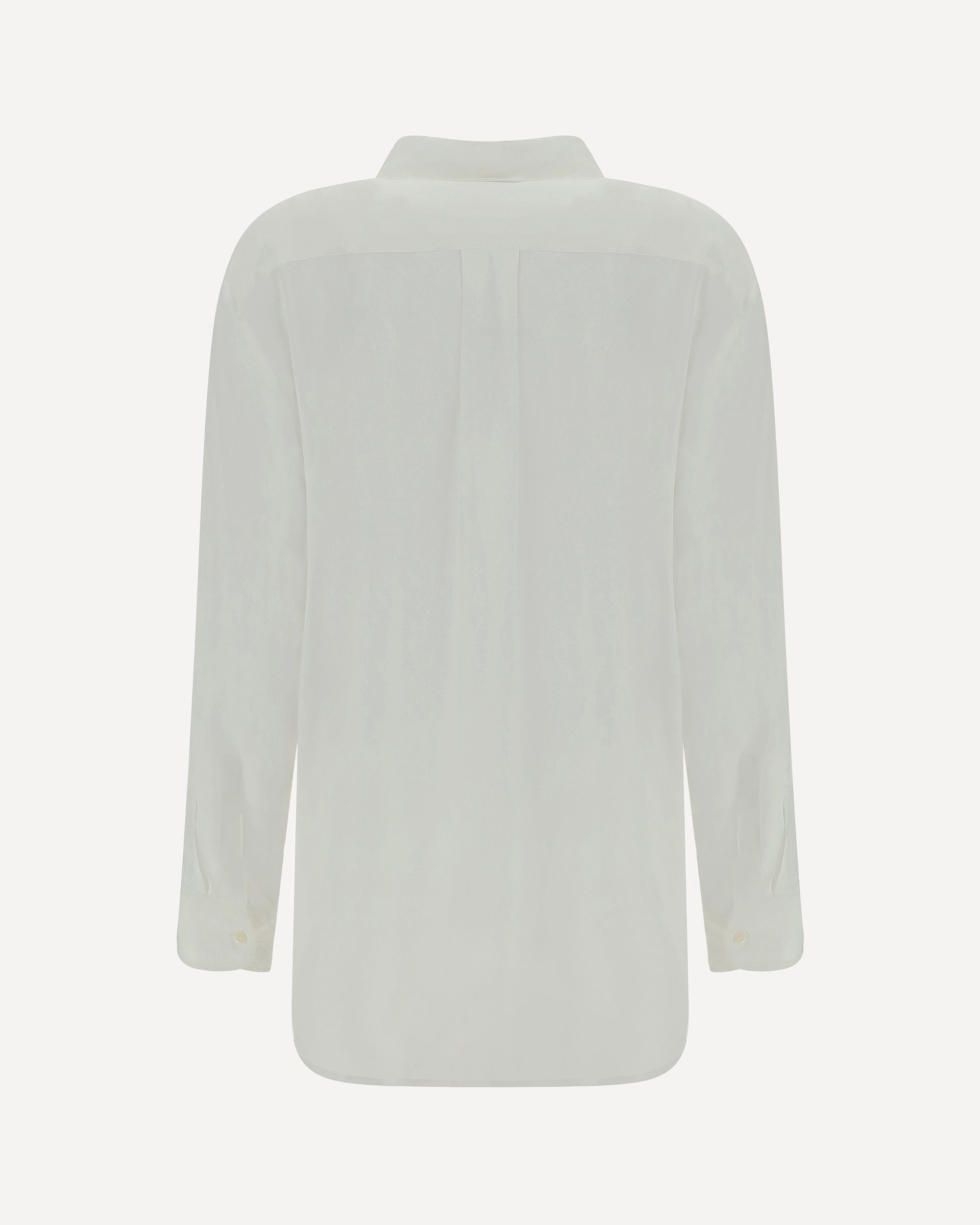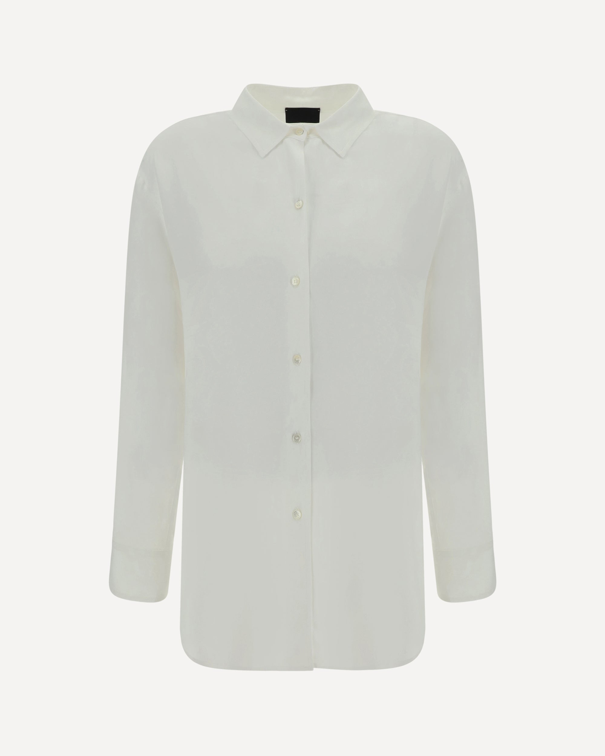Camicia di F. IT, colletto classico, chiusura frontale con bottoni, polsini regolabili con bottoncino, fantasia monocromo, vestibilità oversize.