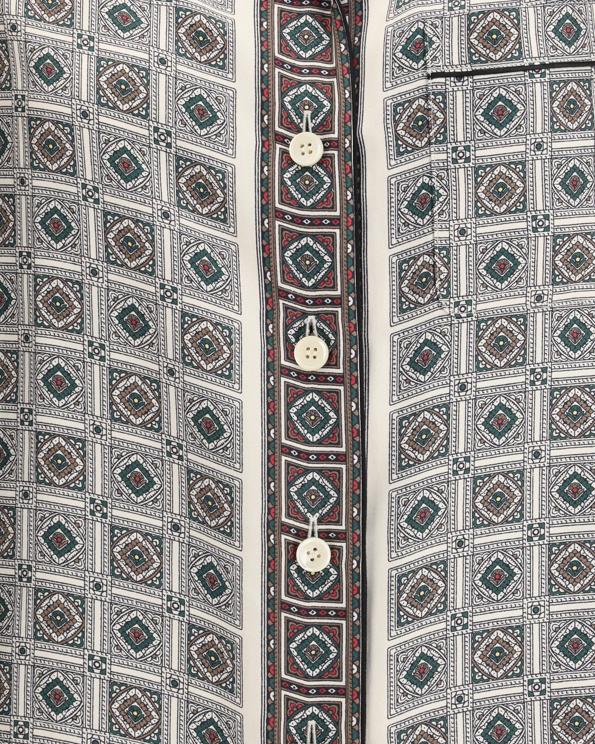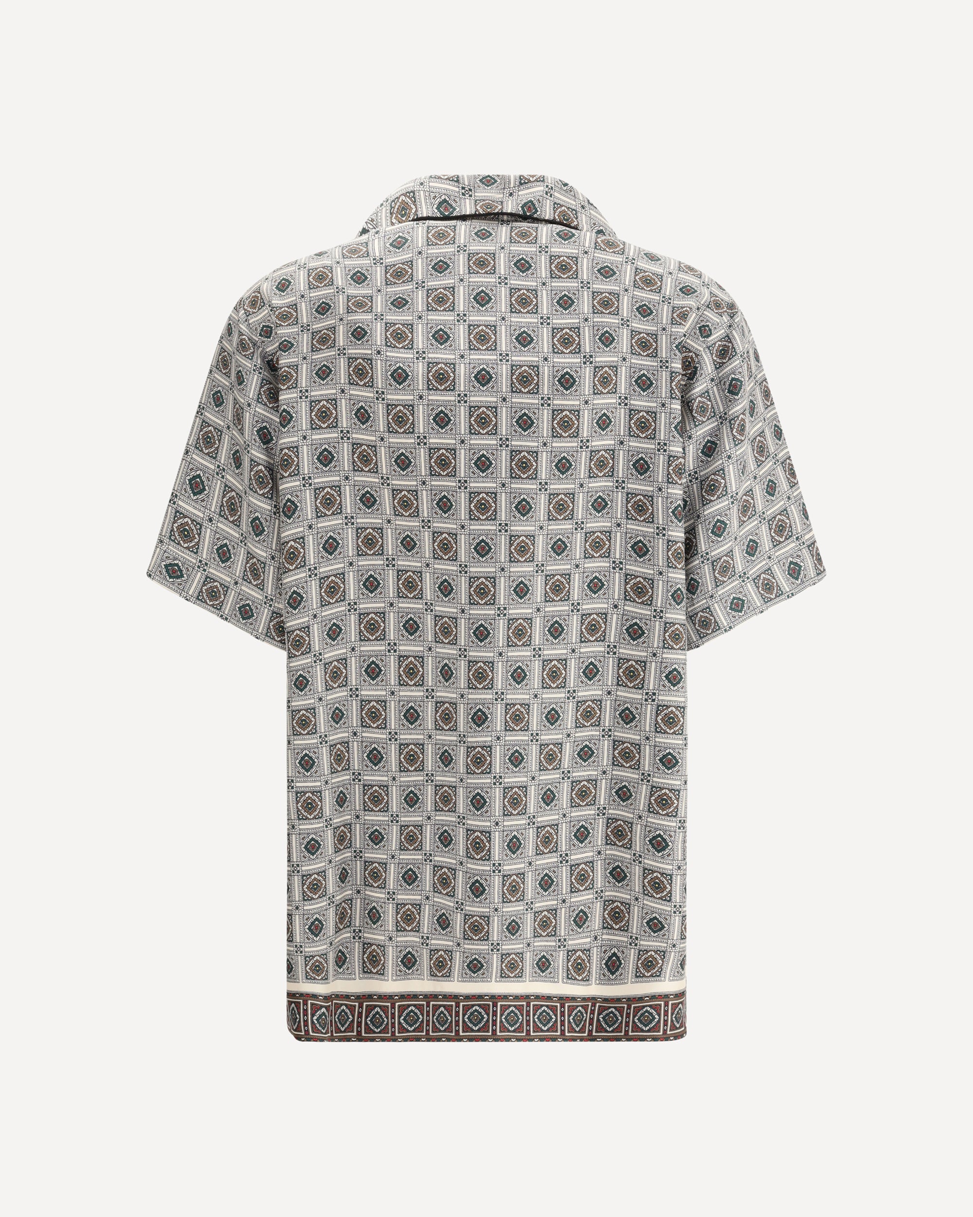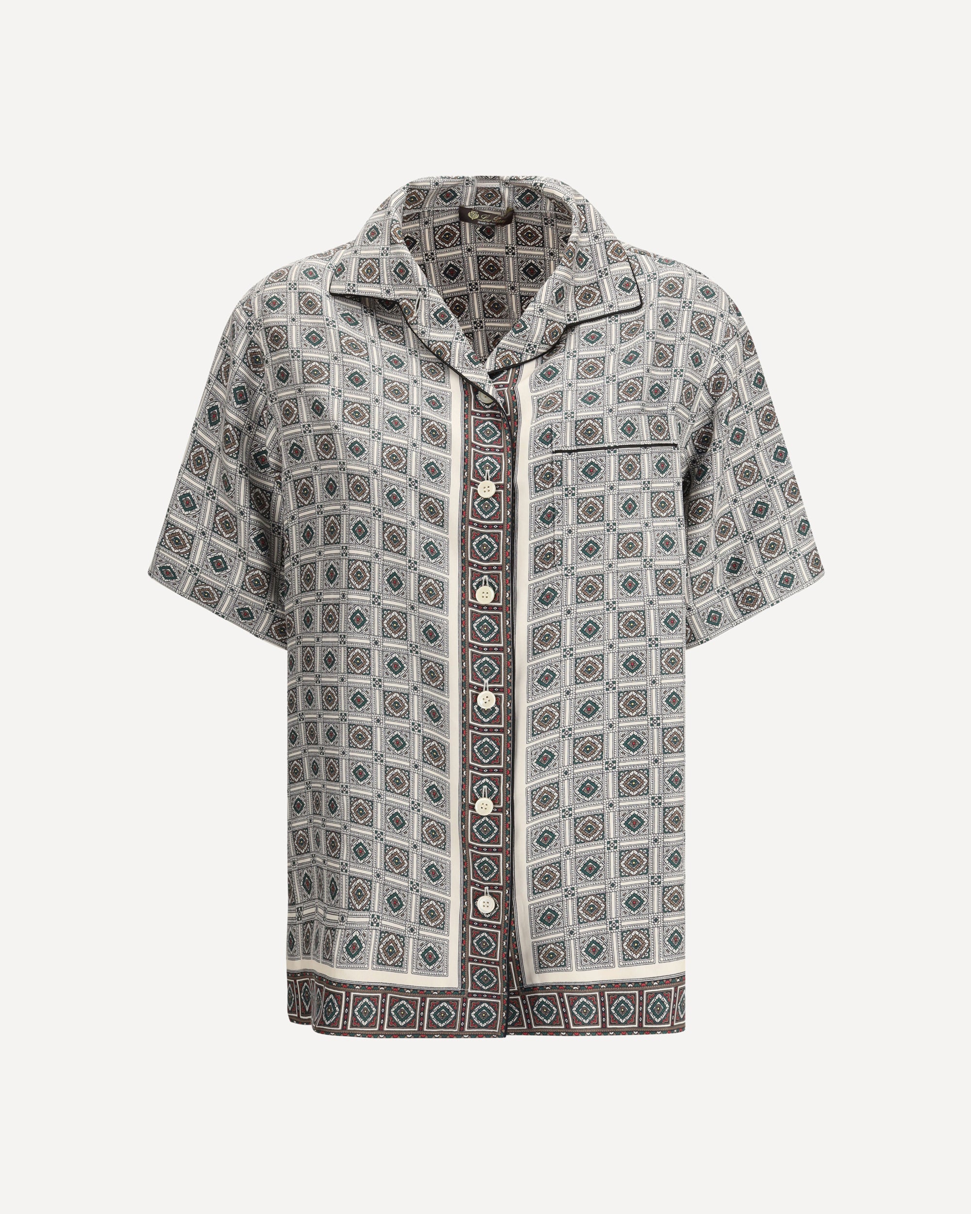 La Camicia in seta di Loro Piana è un capo elegante e ricercato, valorizzato da una raffinata stampa floreale a piastrelle. Realizzata in seta pregiata, presenta un collo ampio, maniche corte e una tasca portadocumenti che unisce funzionalità e stile. La chiusura con bottoni in madreperla aggiunge un tocco di lusso discreto, mentre i profili a contrasto definiscono il design con eleganza. Perfetta per un look estivo sofisticato.