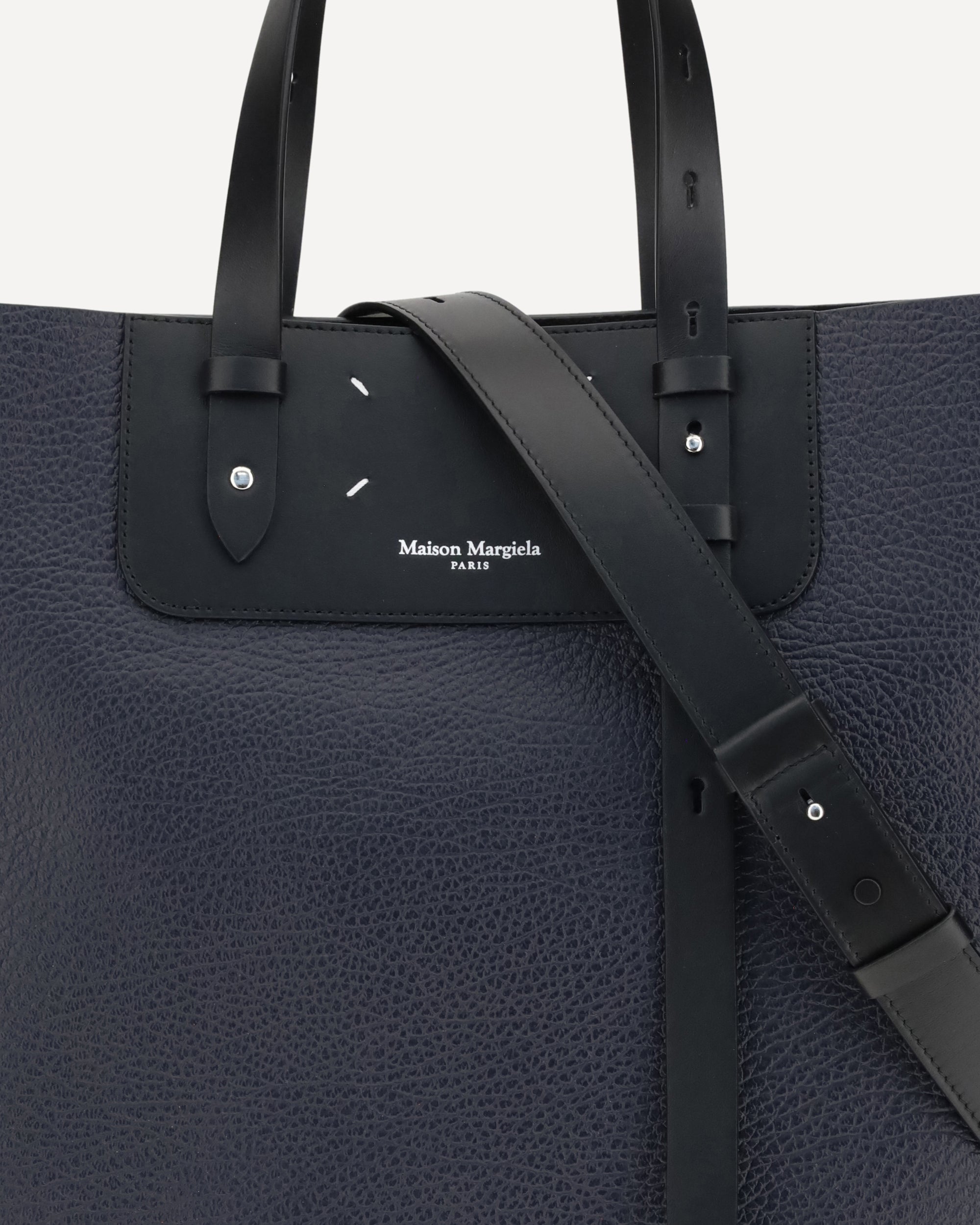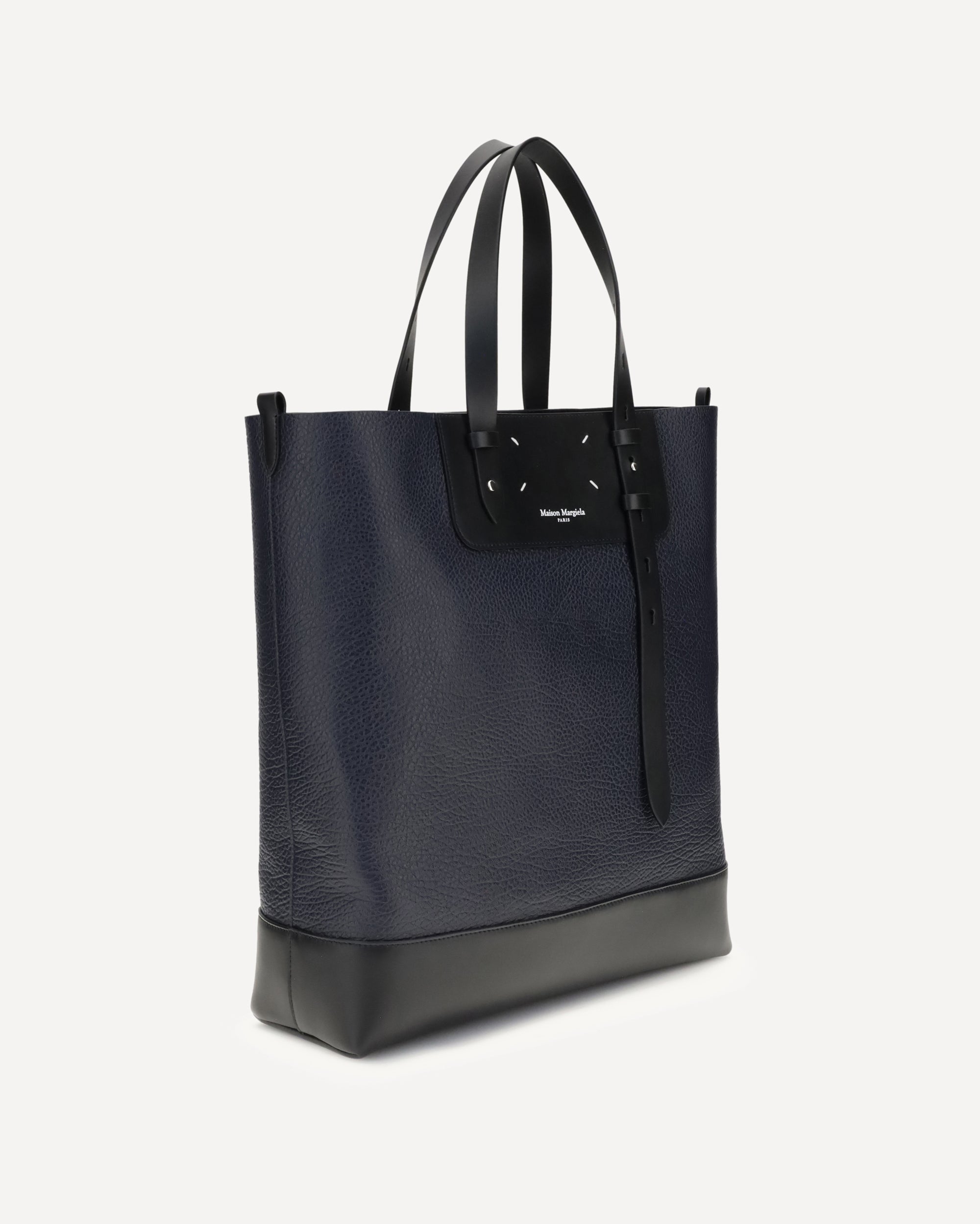 La Borsa Tote Vertical di Maison Margiela è una shopping bag elegante e strutturata, realizzata in pelle martellata con inserti in pelle liscia sul fondo e sulla parte superiore. È impreziosita dal logo stampato a contrasto e dall’iconica cucitura a contrasto sul davanti. Dotata di due manici regolabili e di una tracolla in pelle regolabile e amovibile, è completamente foderata per un tocco di raffinatezza funzionale.
