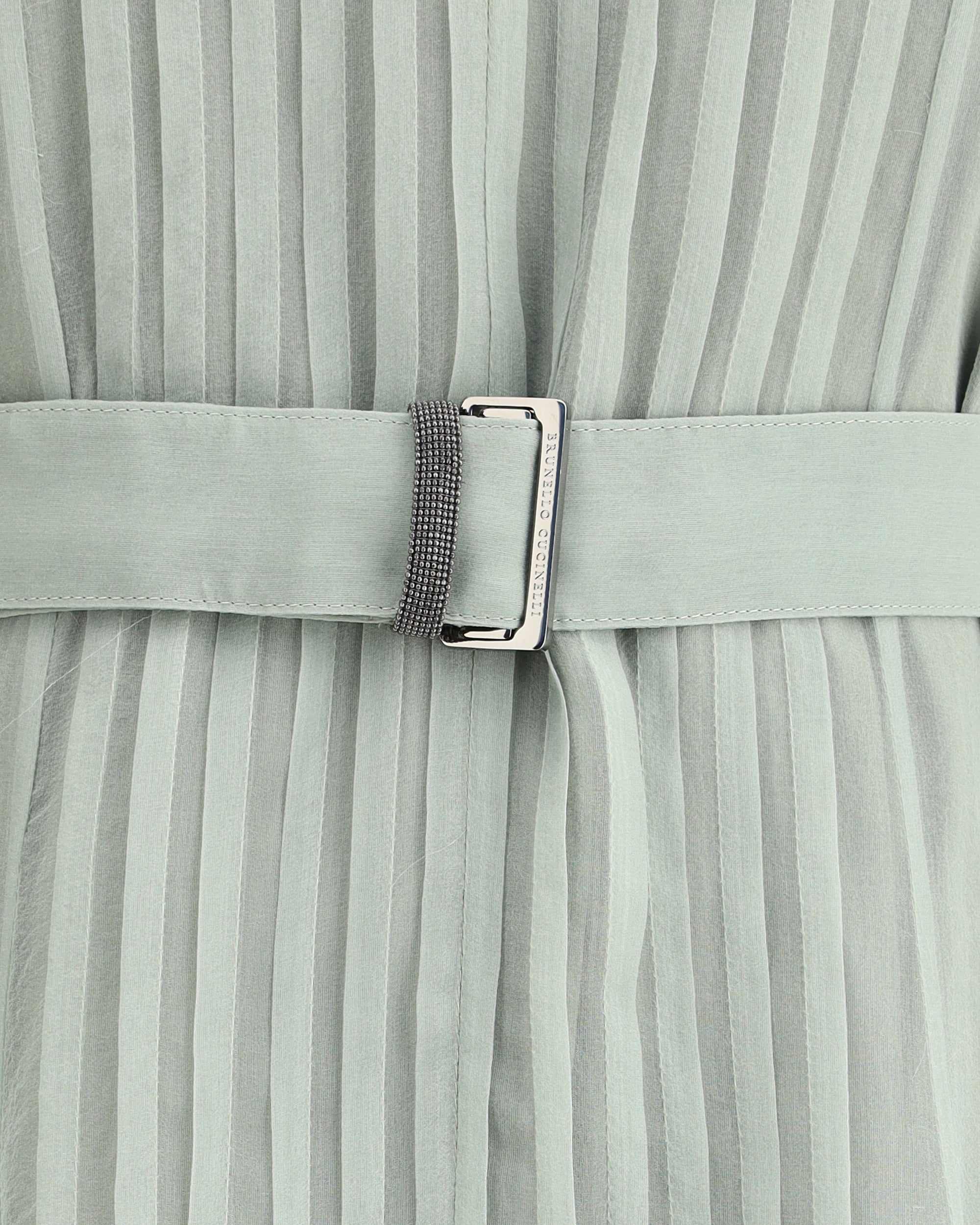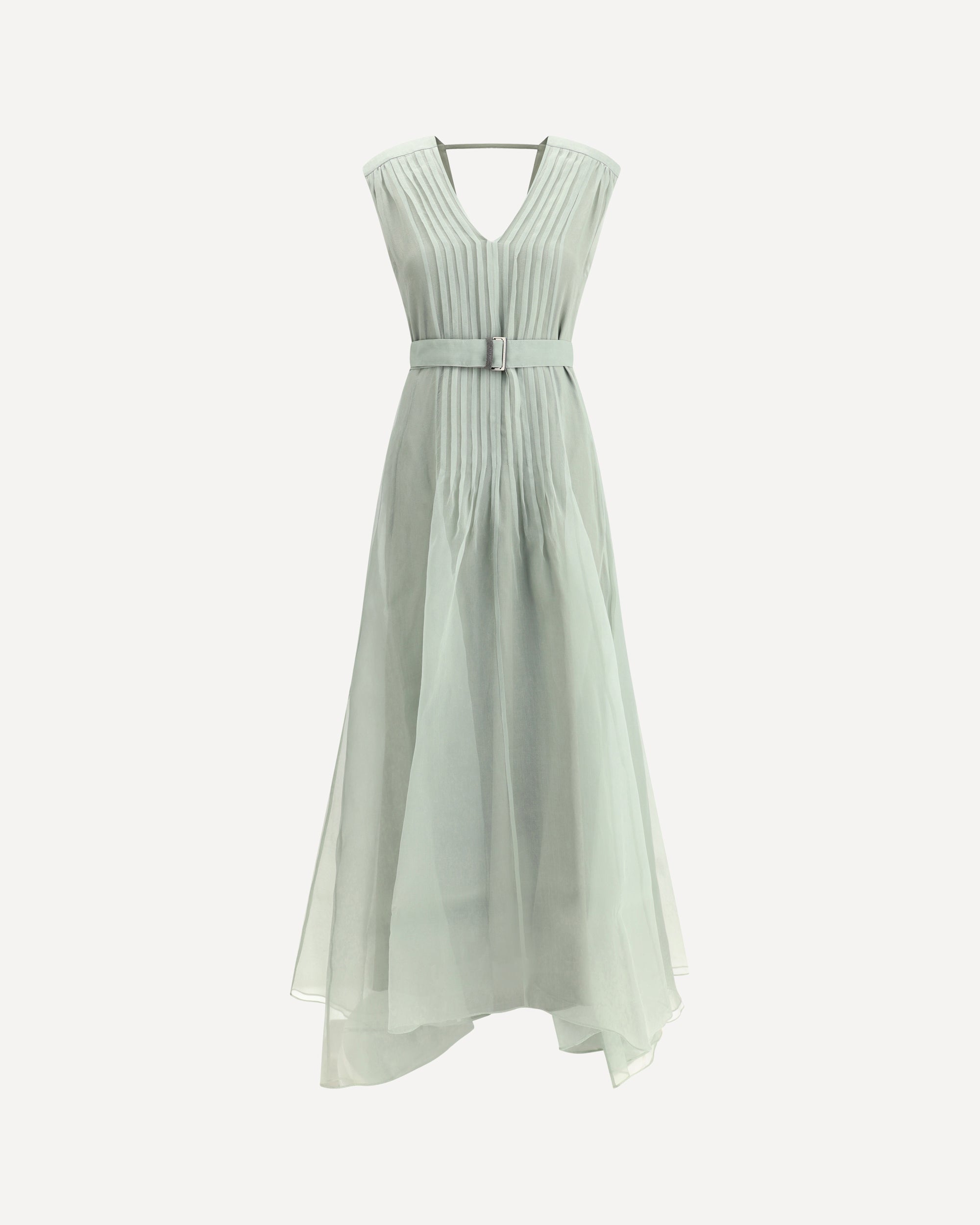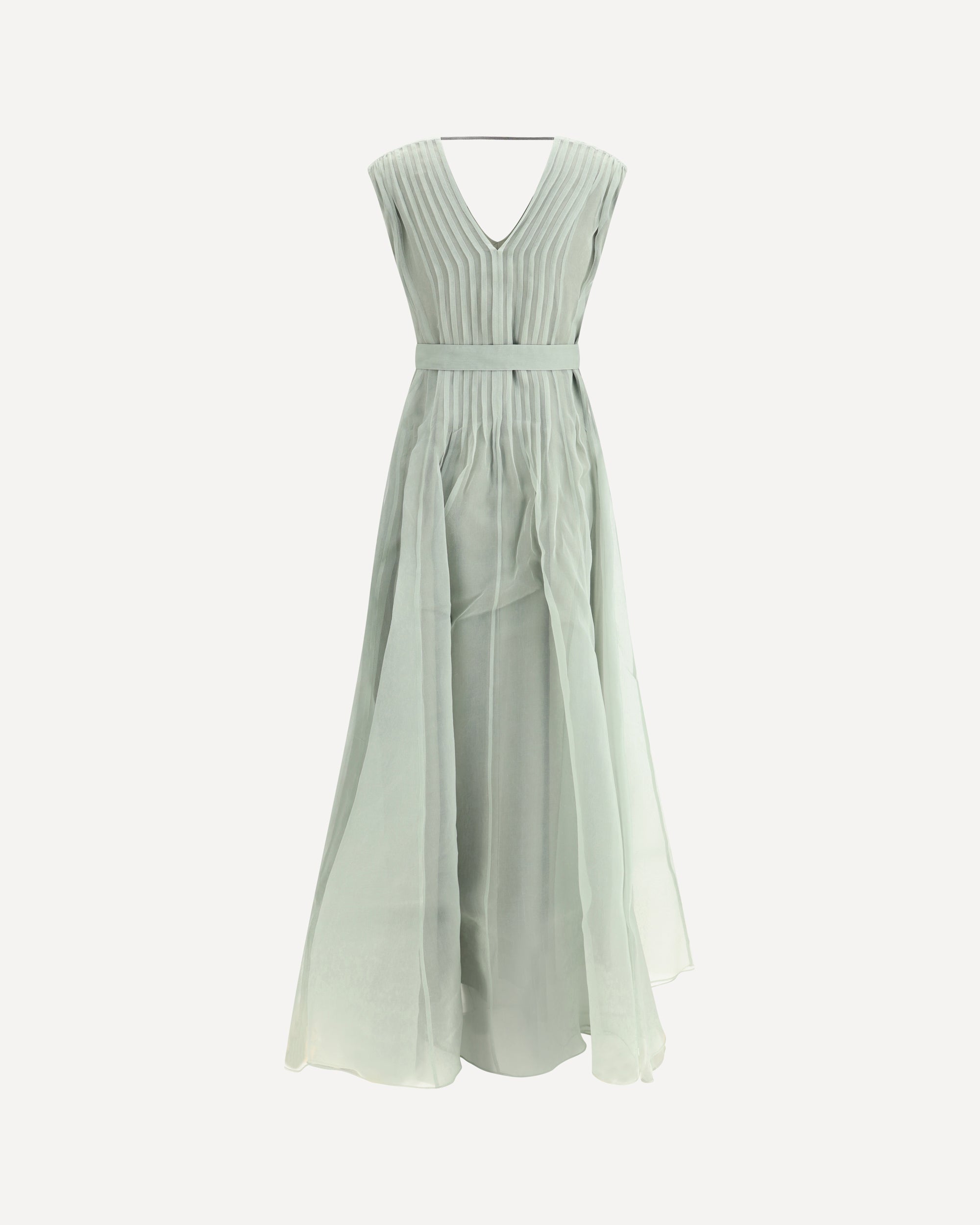 L’Abito lungo in seta di Brunello Cucinelli unisce la raffinatezza dei volumi fluidi a dettagli sofisticati che raccontano l’eleganza distintiva della Maison. Il design senza maniche con scollo a V, sia sul fronte che sul retro, crea una linea femminile e armoniosa. L’elegante plissettatura parte delicatamente dalle spalle e si apre lungo la gonna, conferendo movimento e leggerezza al capo. La cintura regolabile in vita definisce la silhouette con equilibrio e introduce un delicato accento di ispirazione utility. Sul retro, un inserto in brillante monile illumina lo scollo con un tocco prezioso e discreto, firma inconfondibile dello stile Brunello Cucinelli.