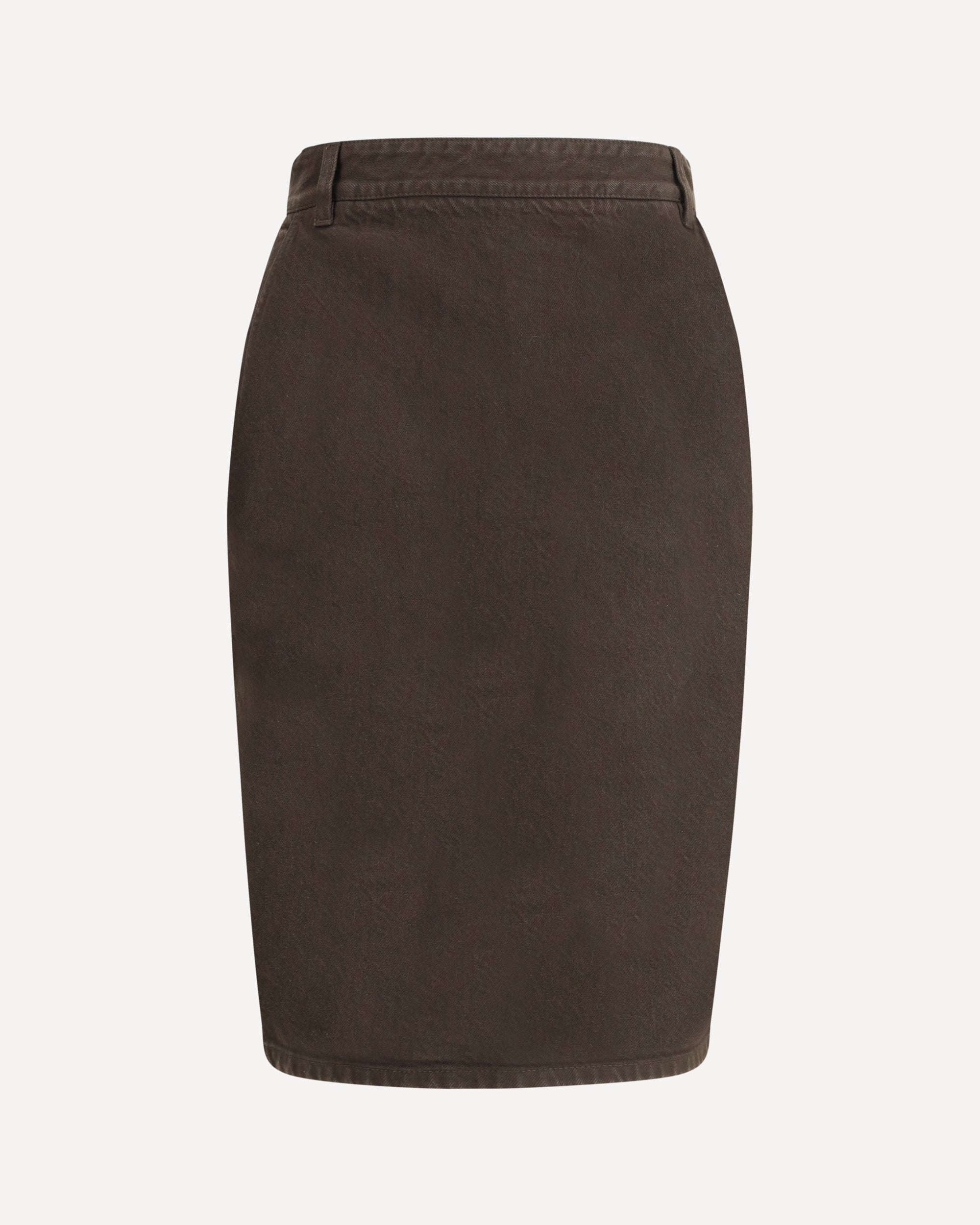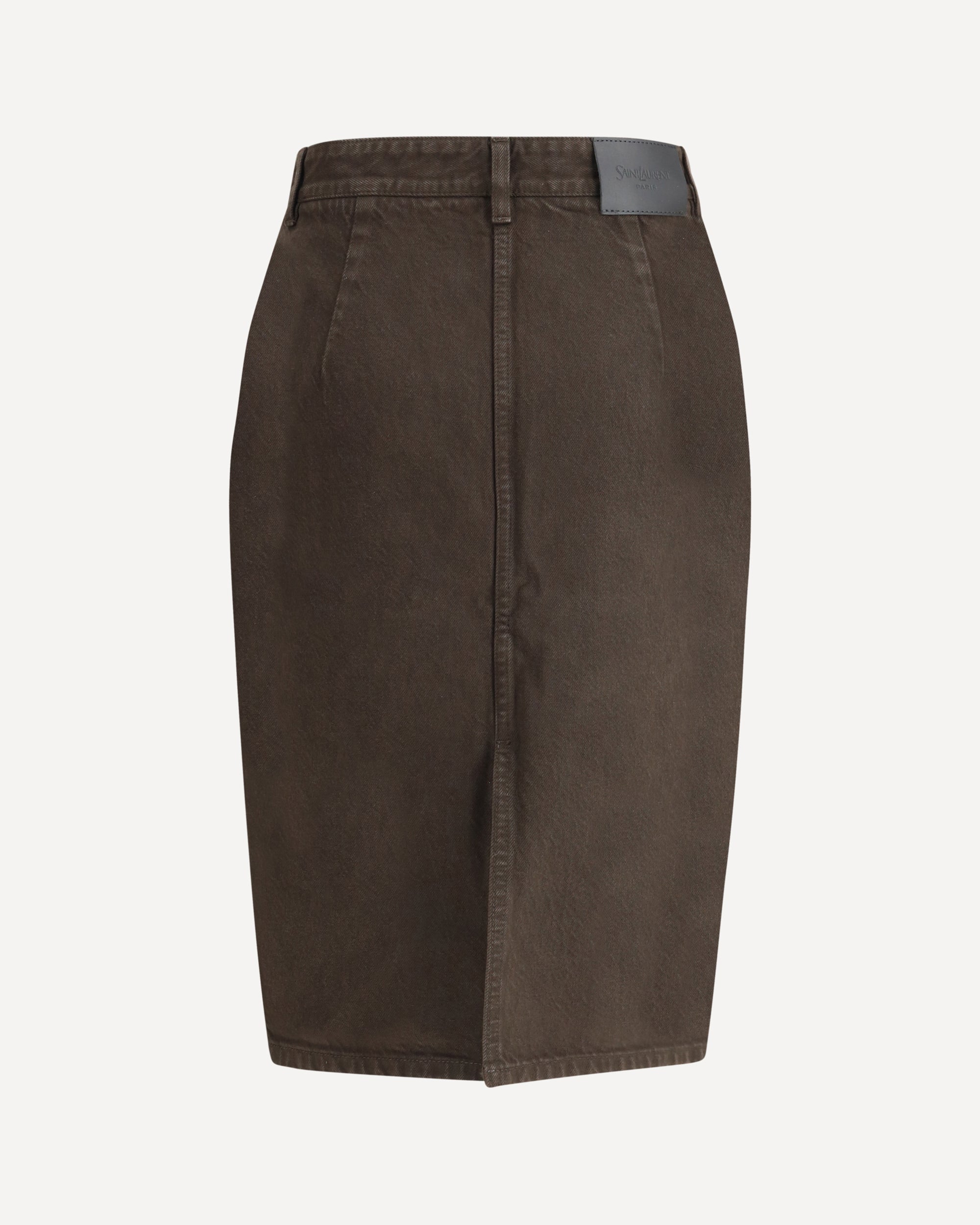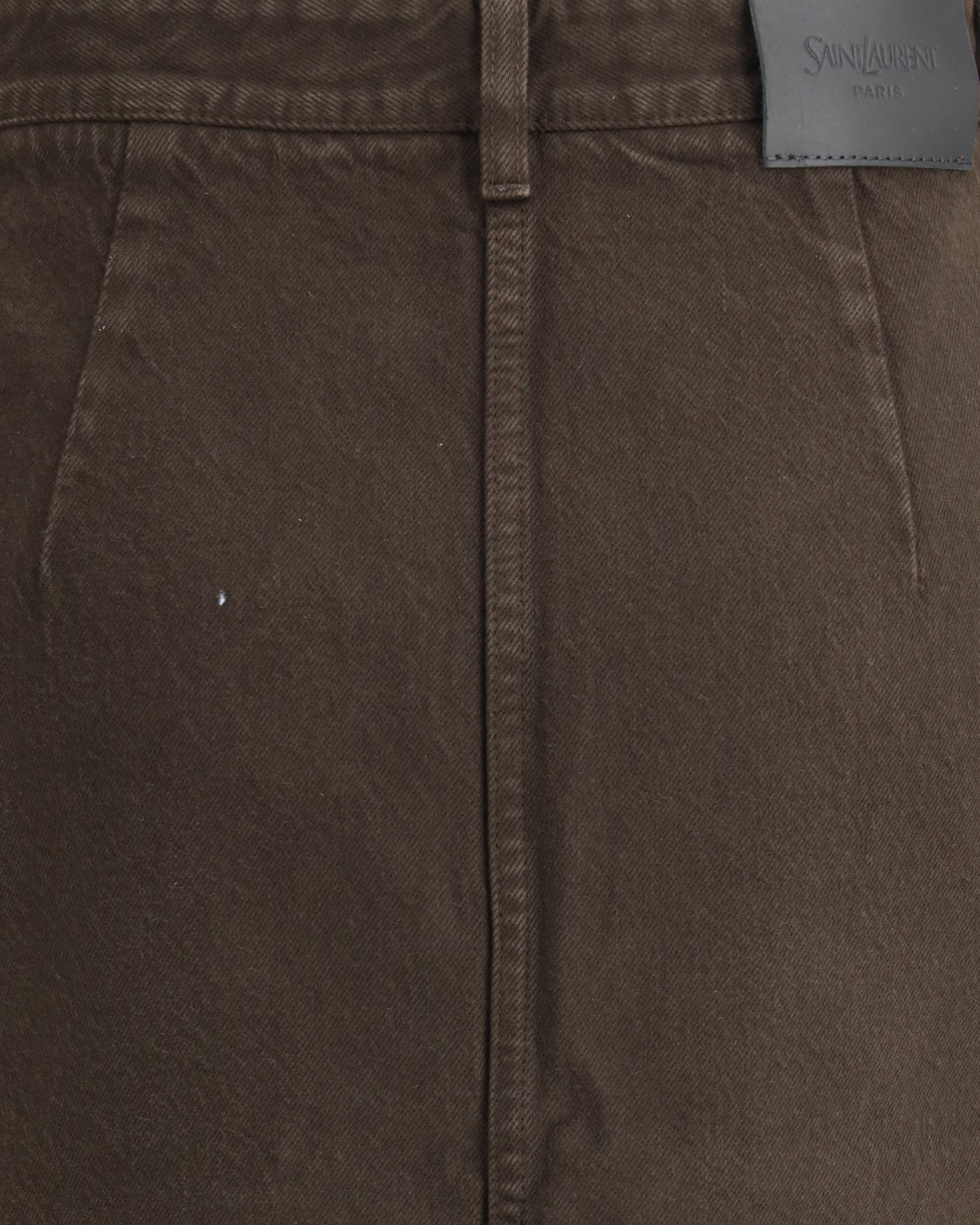 La Gonna a Matita in Denim di Saint Laurent unisce praticità e stile contemporaneo in un capo essenziale. Realizzata in cotone certificato, presenta vita media con passanti per cintura, spacco sul retro per maggiore libertà di movimento e silhouette aderente che valorizza la figura. Il dettaglio Jacron in pelle con goffratura Saint Laurent Paris aggiunge un tocco distintivo e raffinato, rendendo la gonna versatile sia per look casual sia più curati.