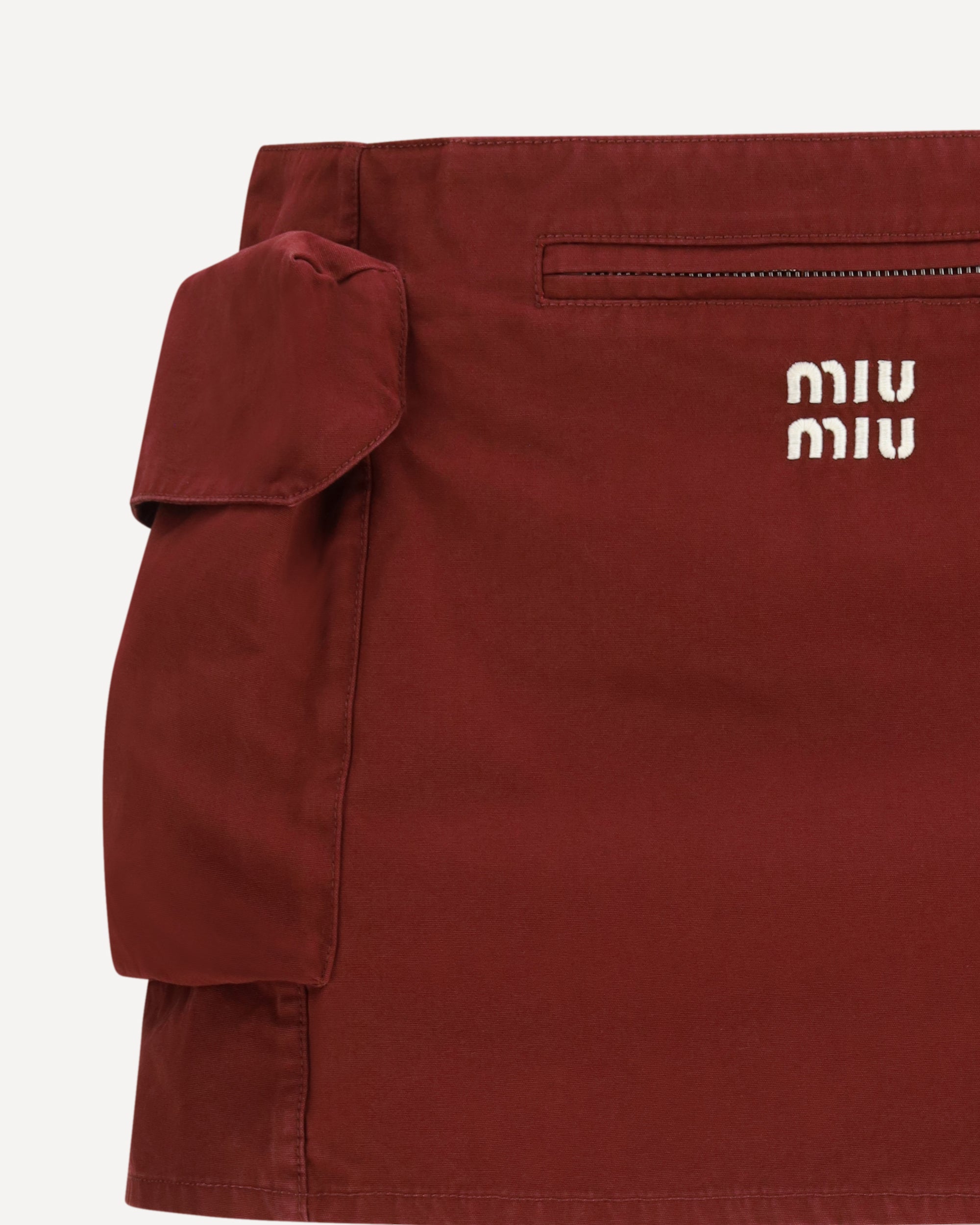 La Gonna mini in cotone di Miu Miu interpreta uno stile giovane e contemporaneo. Realizzata in cotone, presenta una chiusura con zip sul retro per una linea pulita e funzionale. Il design è arricchito da una tasca anteriore con zip e da maxi tasche laterali con pattina, che donano un carattere utilitario e deciso. A completare il capo, il ricamo con logo lettering Miu Miu, dettaglio iconico e distintivo.