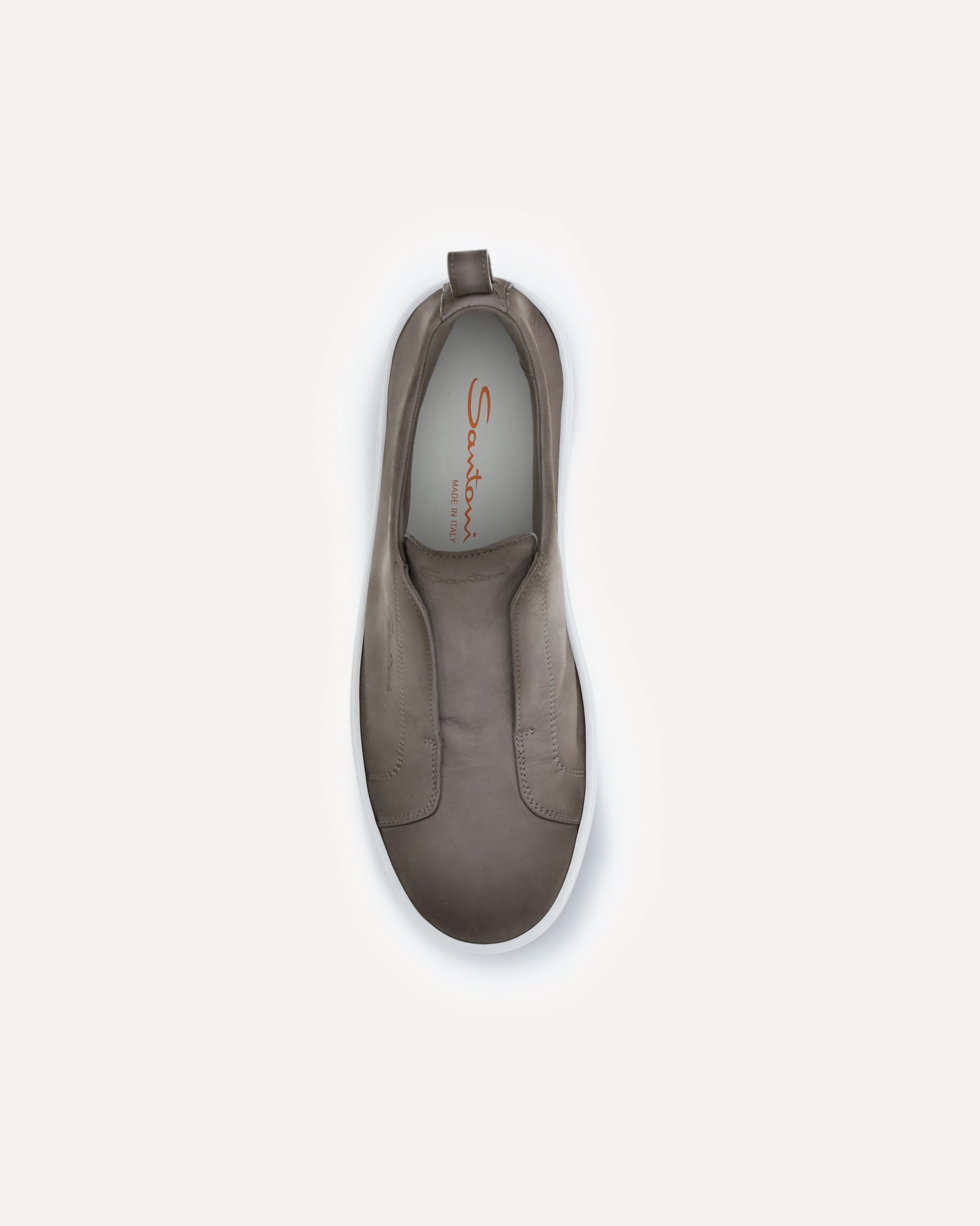 Le Sneakers slip-on di Santoni uniscono praticità e stile in un design essenziale e raffinato. Caratterizzate da una punta arrotondata e un loop sul tallone per una calzata facile e veloce, sono completamente sfoderate per garantire leggerezza. La suola a cassetta in gomma assicura durata e comfort, mentre il battistrada con il decoro doppia fibbia Arancio Santoni dona un tocco distintivo e di carattere a questo modello versatile e contemporaneo.
