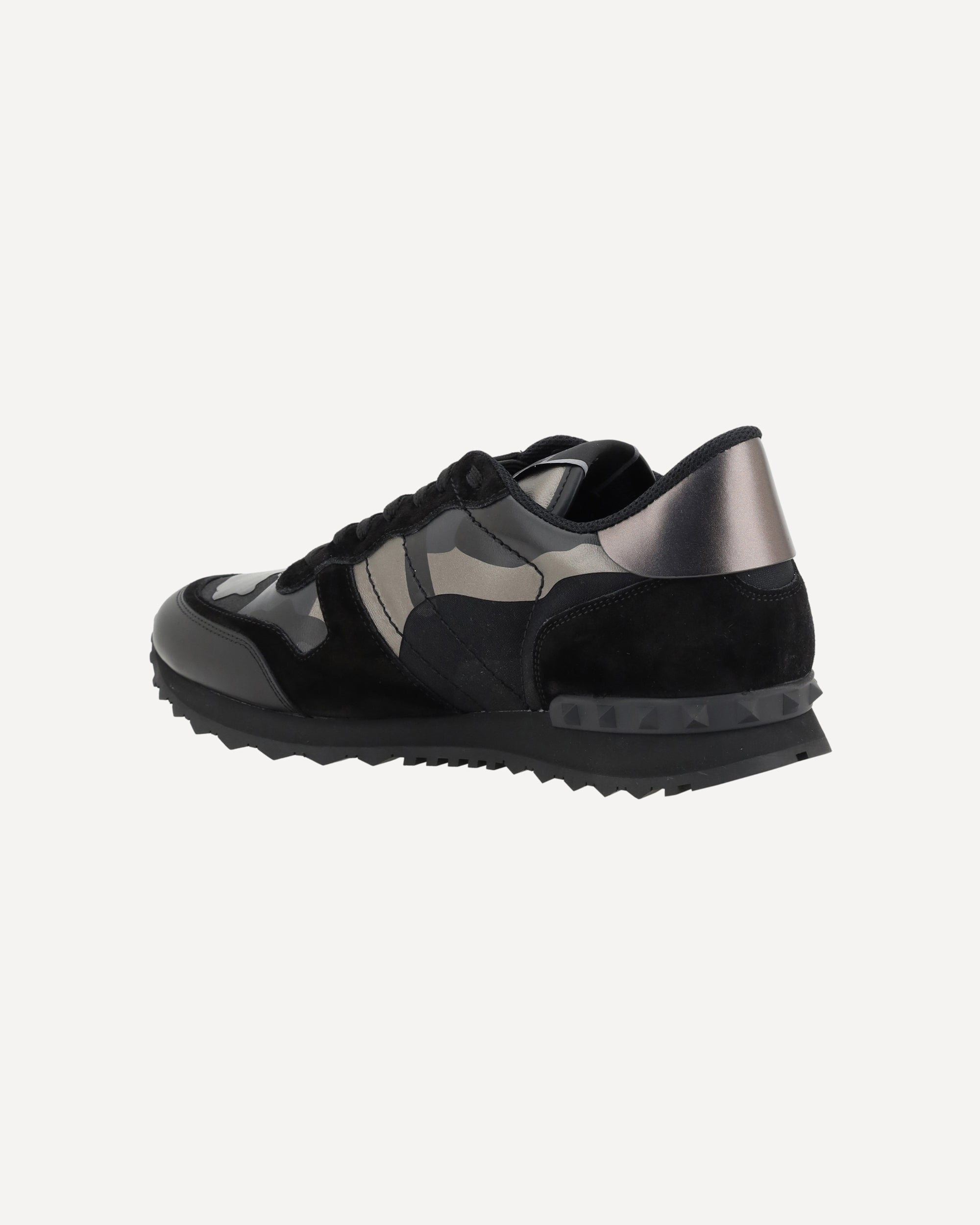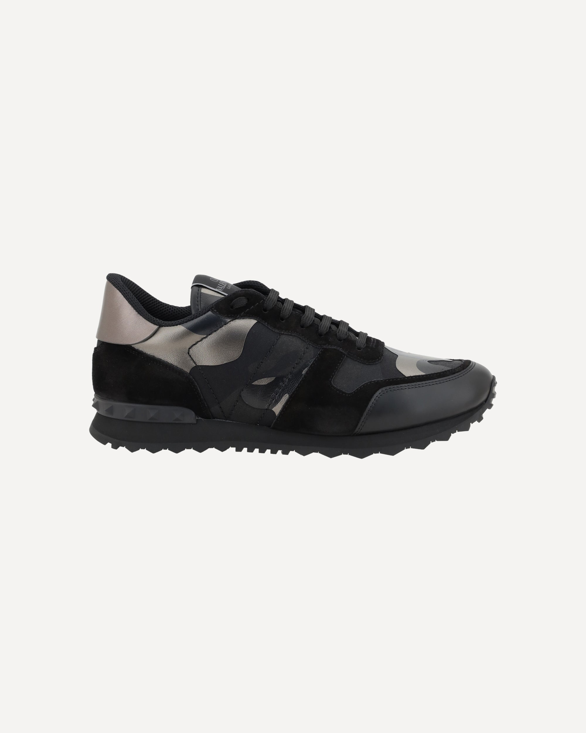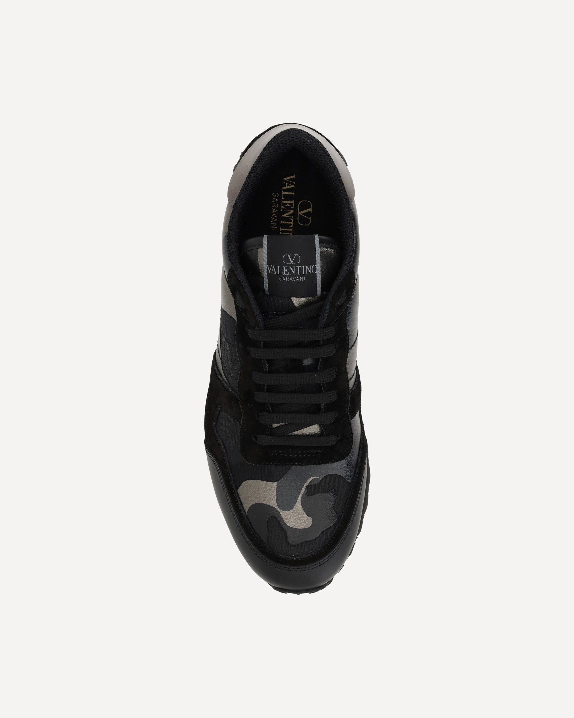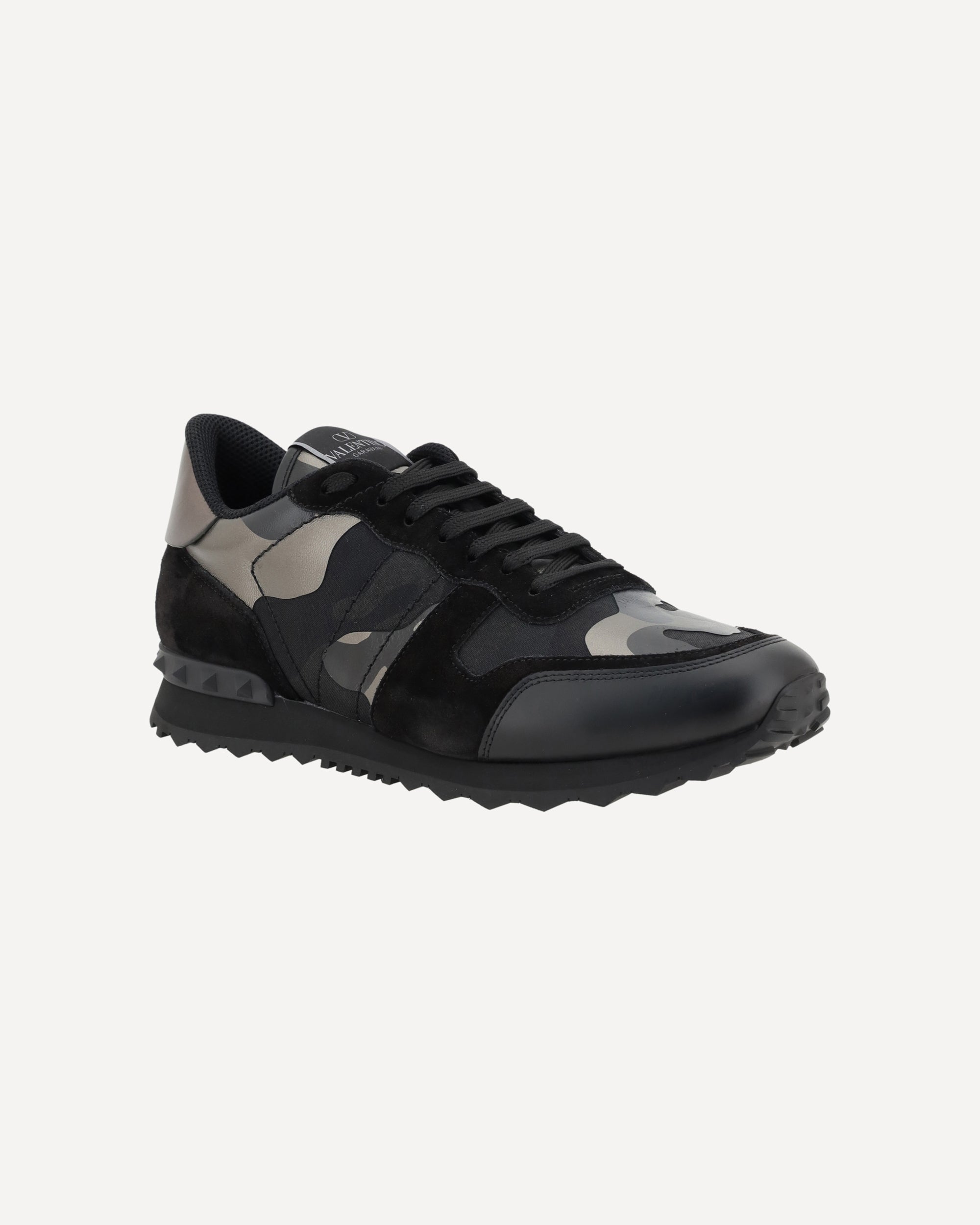 Sneakers in Pelle di Valentino Garavani, chiusura frontale mediante lacci, dettagli in pelle scamosciata, fantasia camouflage, suola strutturata zigrinata, soletta logata a contrasto.