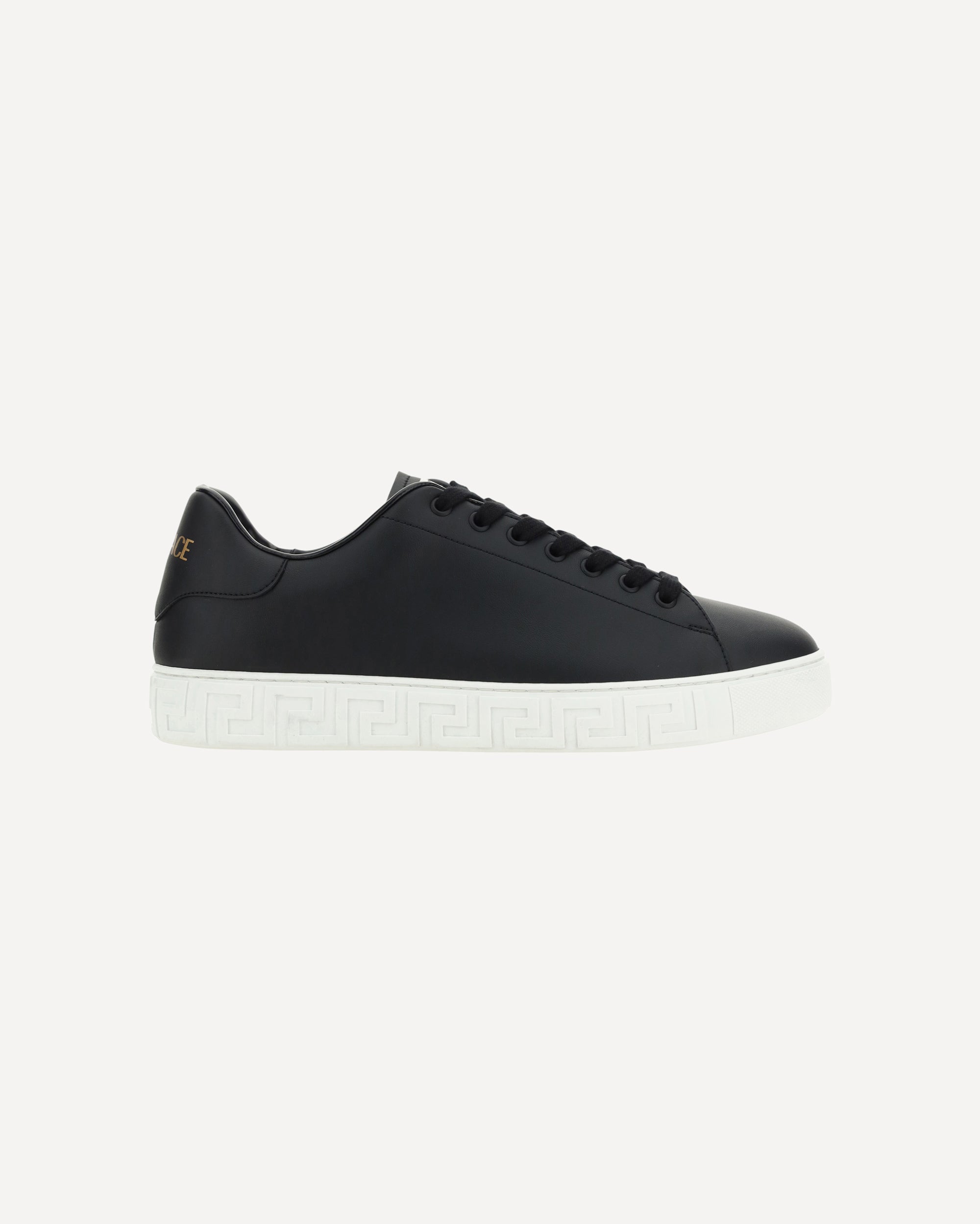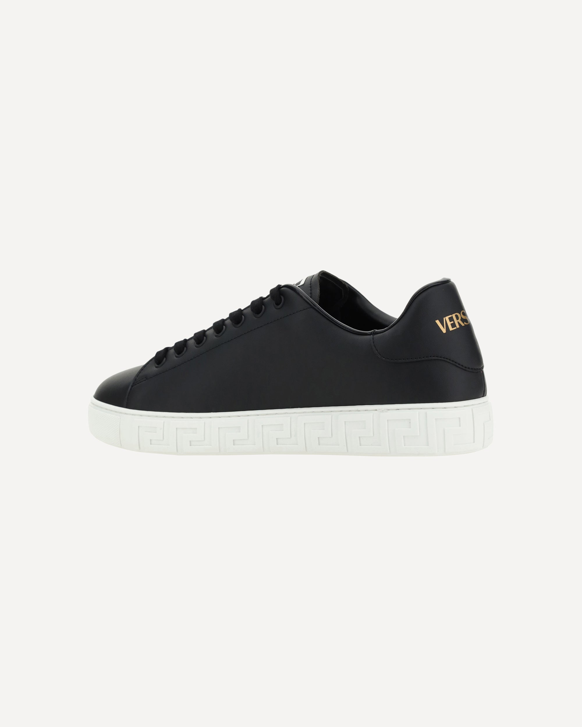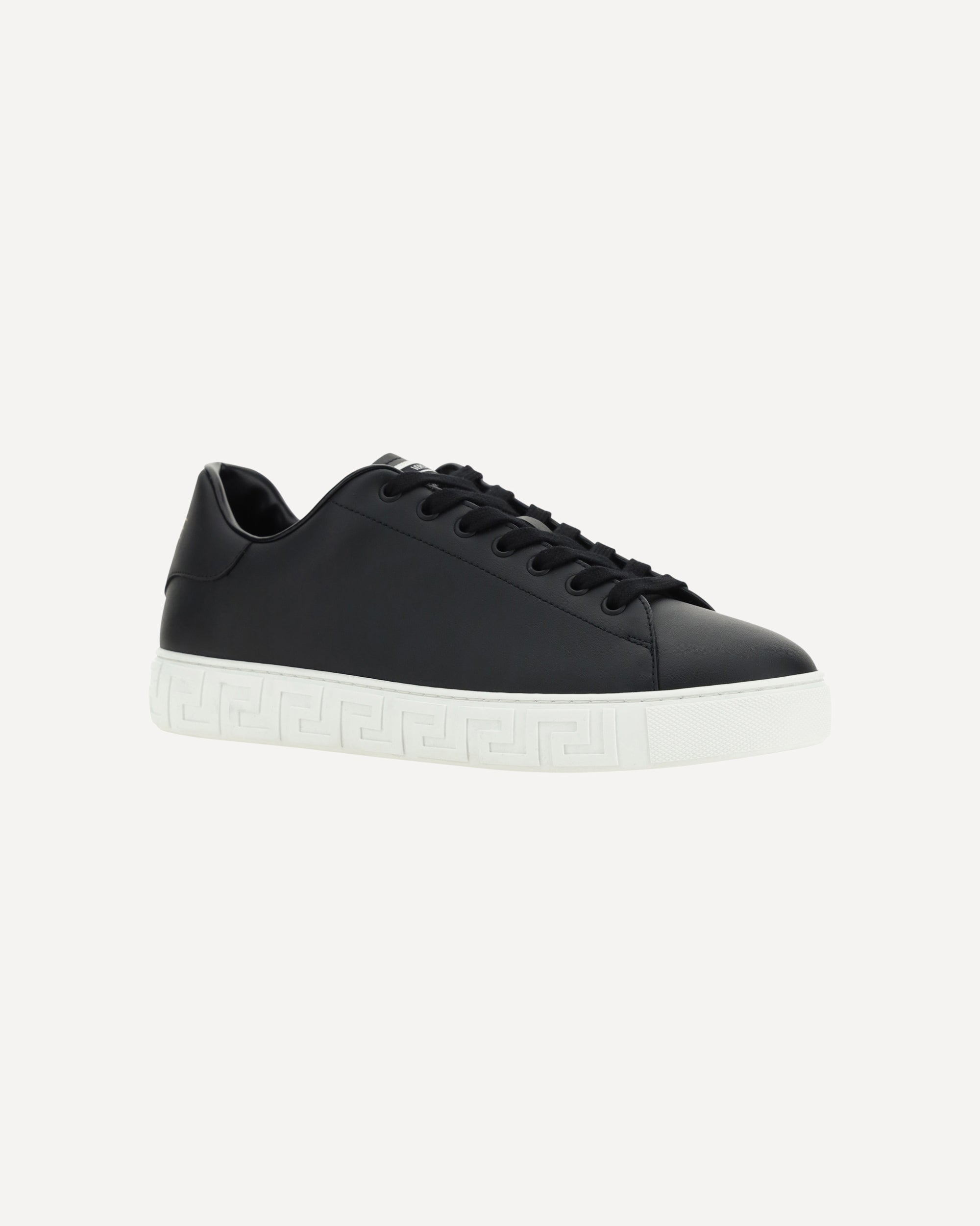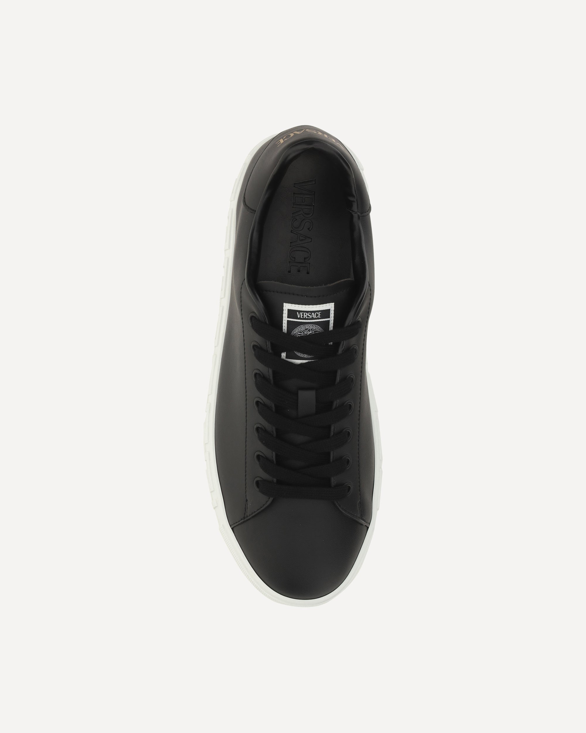Sneakers in Pelle di Versace, punta tonda, chiusura frontale con lacci, suola piatta con iconica stampa Greca in rilievo, iconico monogramma stampato a pressione sul retro, soletta logata a pressione.