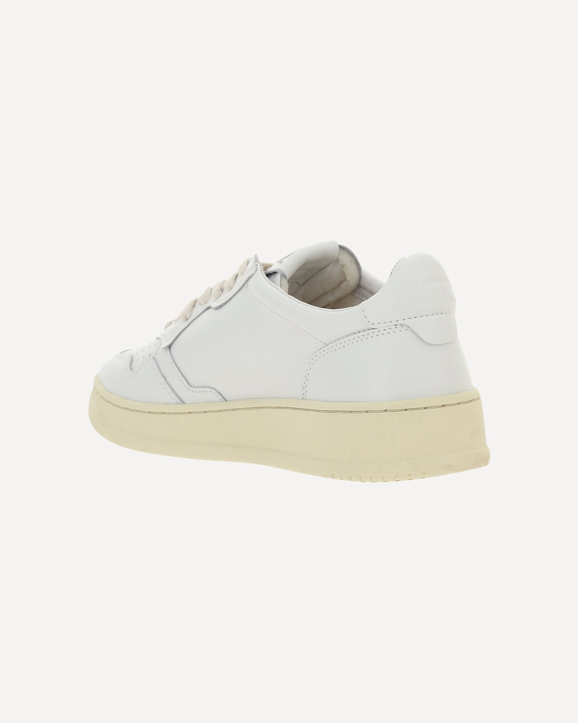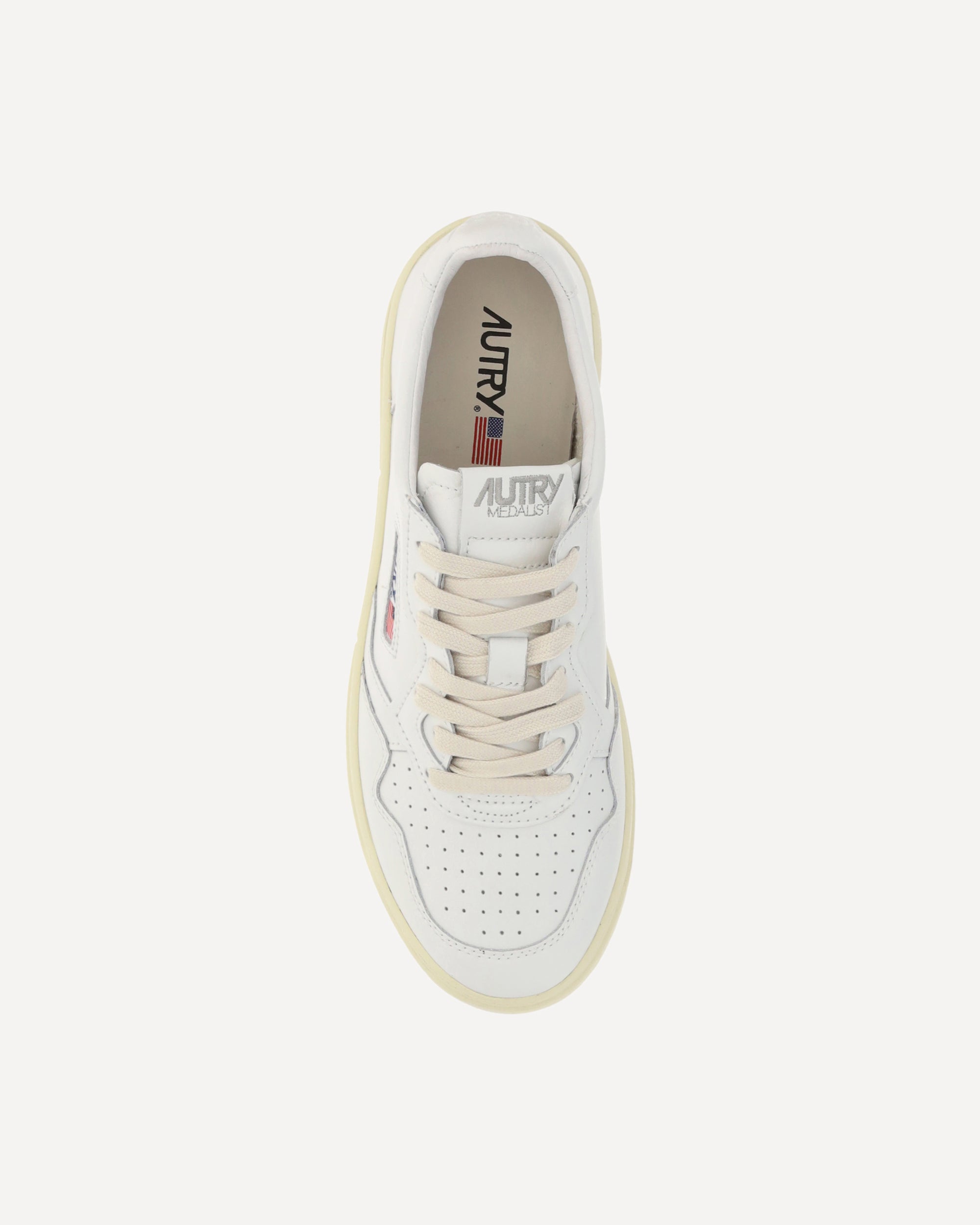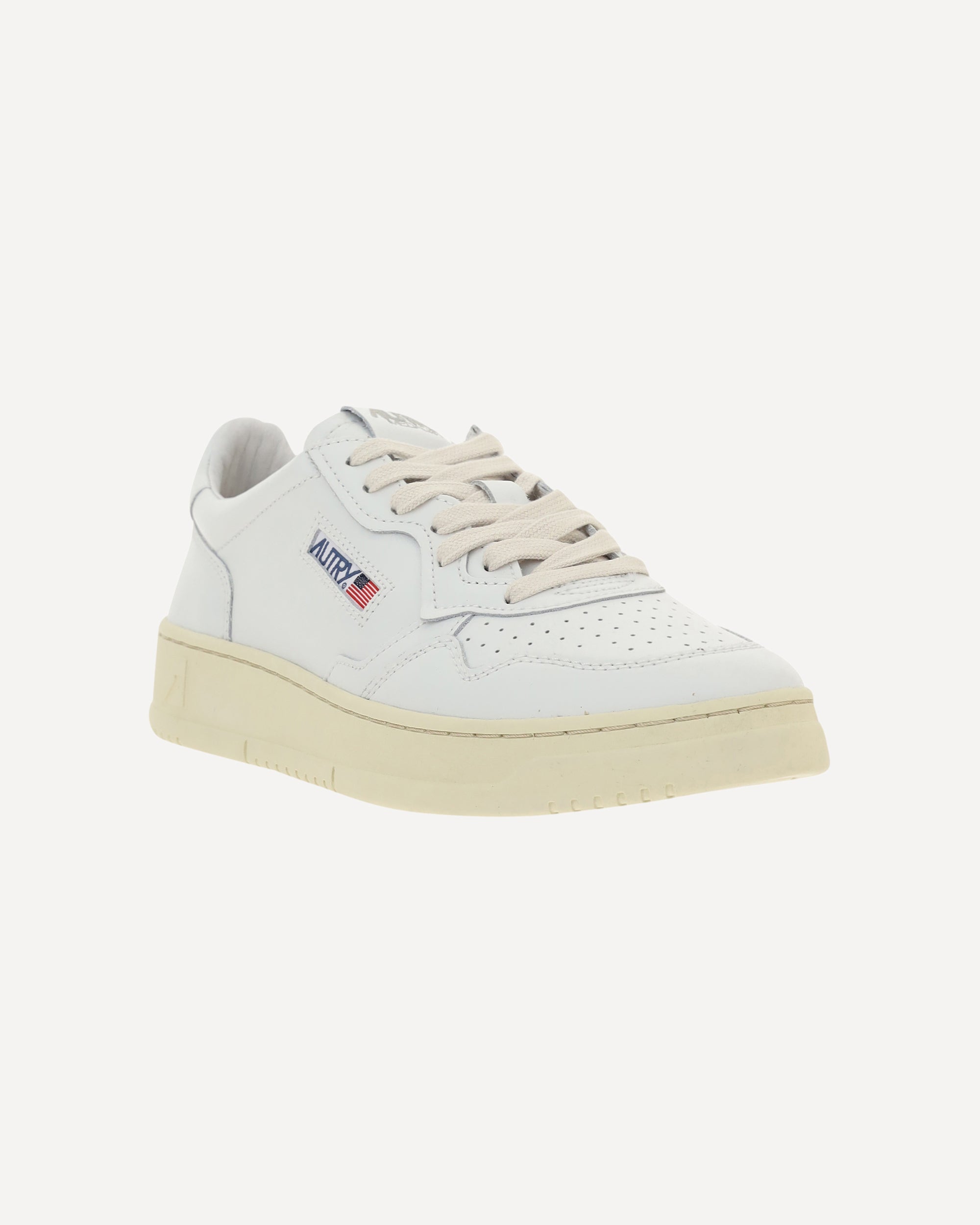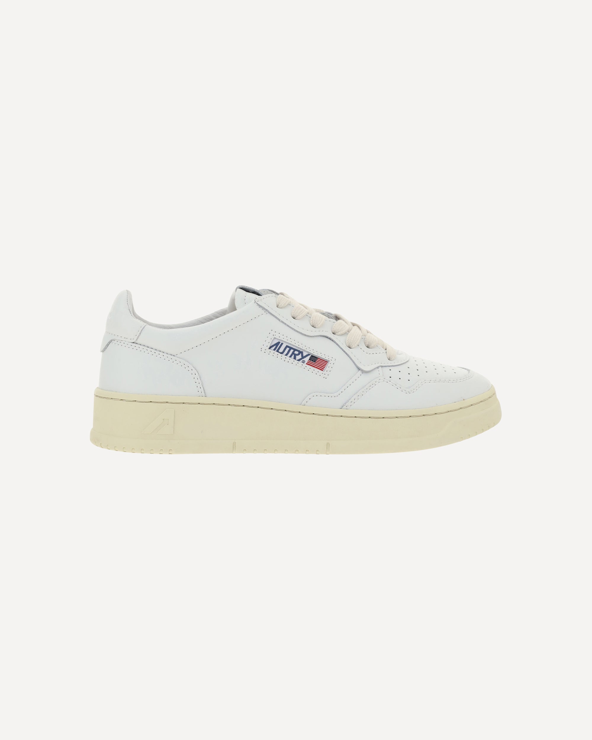 Sneakers in Pelle di Autry, punta tonda traforata, chiusura frontale con lacci, linguetta in pelle con etichetta loggata cucita in tono, iconico talloncino in tono sul retro con logo impresso, soletta in pelle loggata, suola loggata bicolore, bandierina a stelle e strisce con logo sul lato.