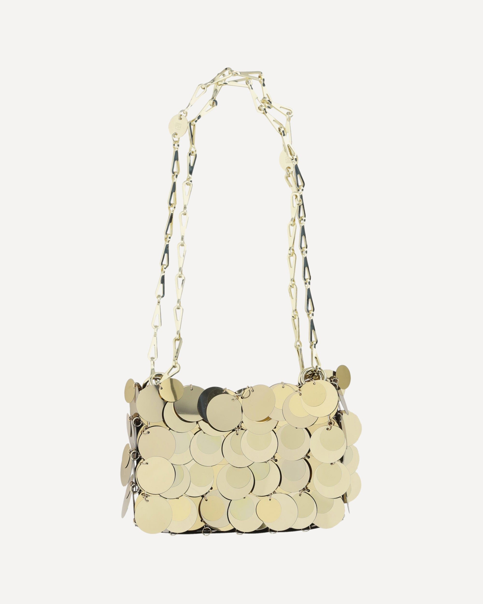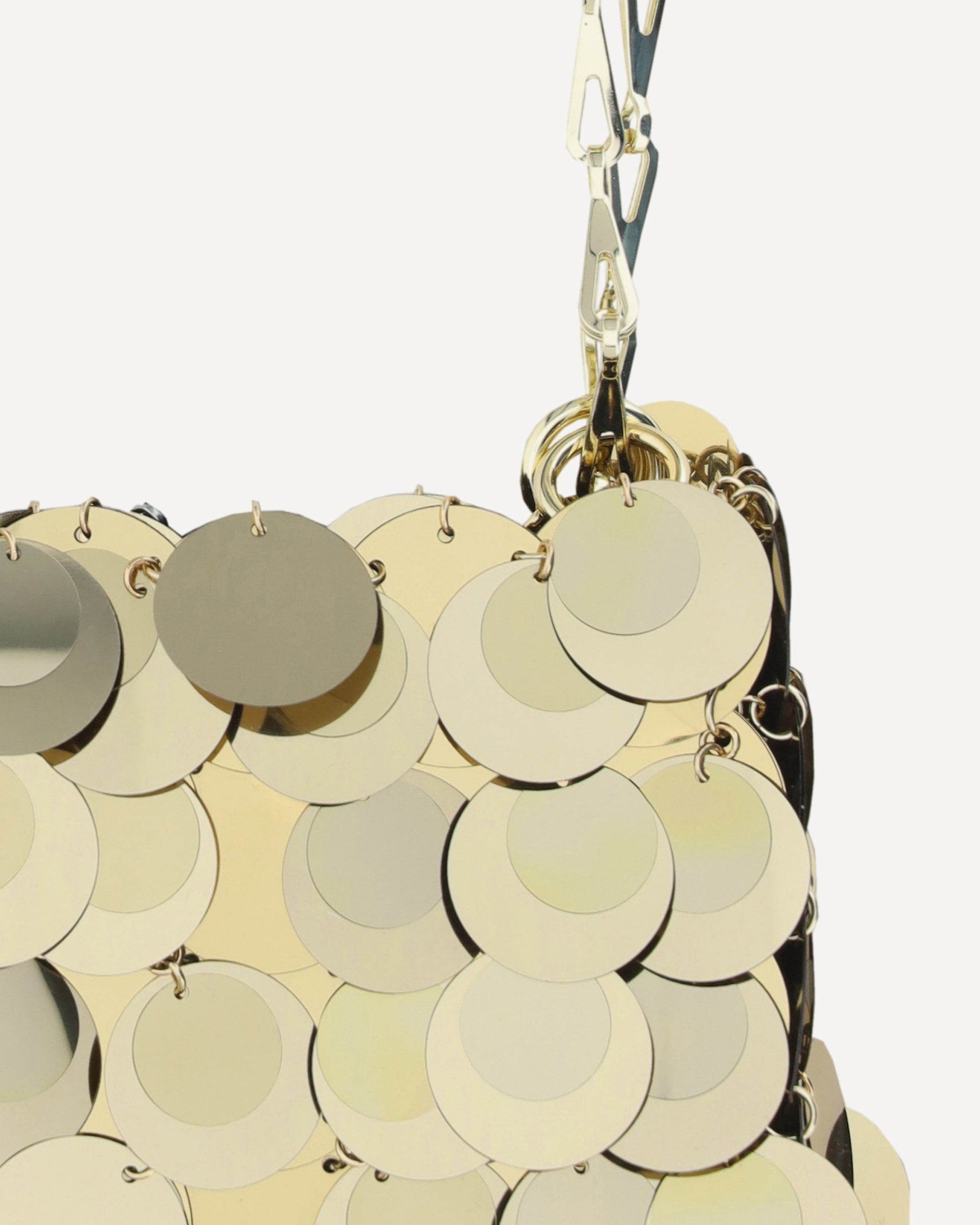 Borsa a Spalla Sparkle Nano di Rabanne, unico scomparto interno, tracolla a catena metallica, design con paillettes Sparkle monocromo, unico scomparto interno.