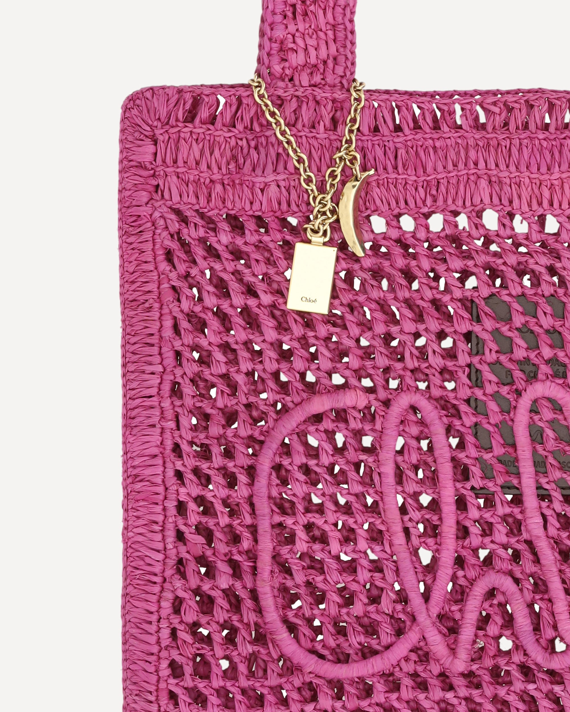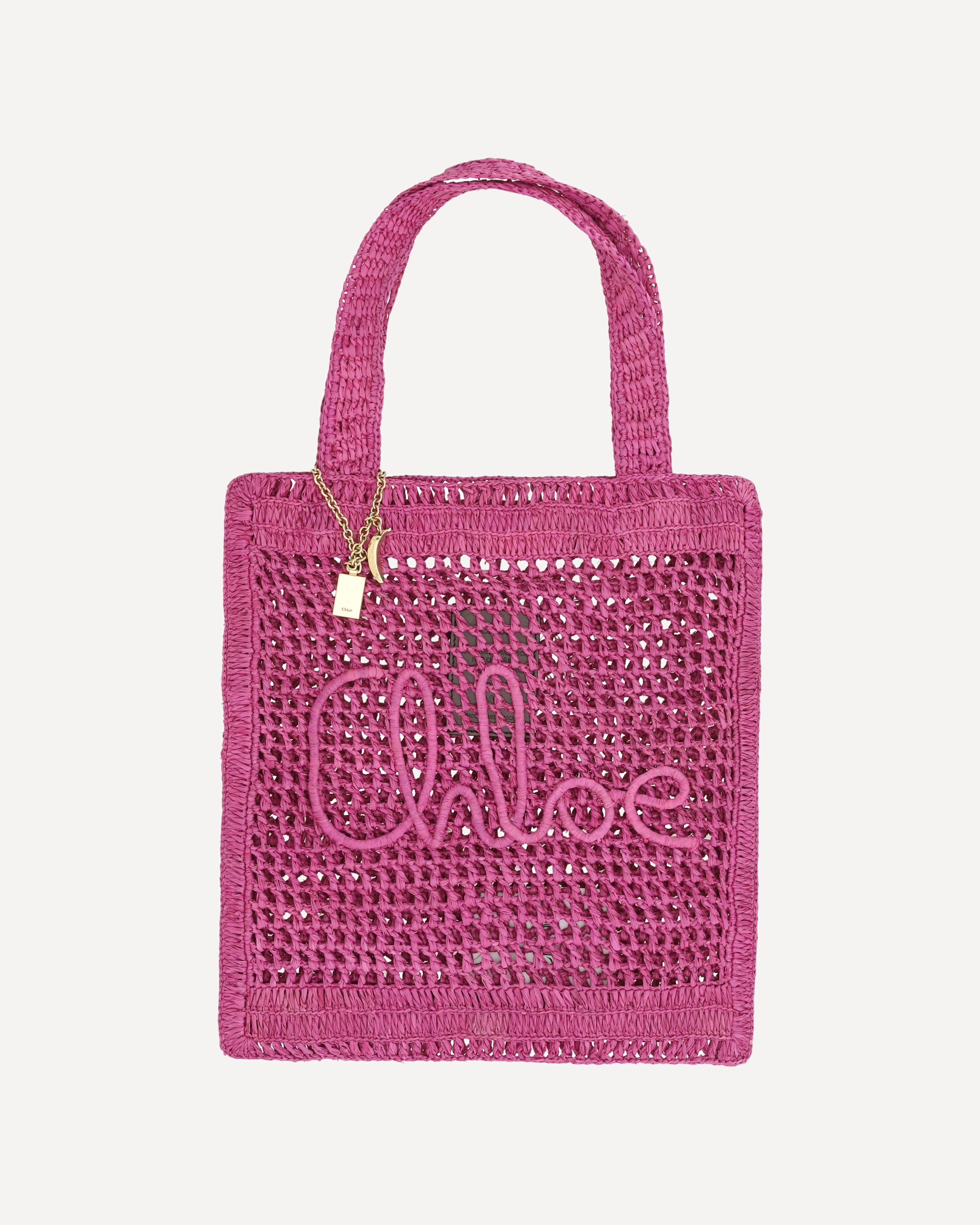 La Borsa Tote Summer Banana di Chloé è un accessorio elegante e fresco, realizzato in rafia con una trama traforata. Dispone di due manici superiori per un comodo trasporto e presenta l'iconico monogramma ricamato sul fronte. Un ciondolo a forma di banana dorata è applicato al manico, aggiungendo un tocco distintivo. All'interno, c'è un patch in pelle logata e un unico scomparto interno per riporre gli oggetti essenziali. Perfetta per l'estate, unisce praticità e stile.